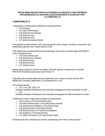 WYKAZ ZMIAN PROJEKTOWYCH W STOSUNKU DO PROJEKTU PODSTAWOWEGO WYKONAWCZEGO DLA BUDYNKU ZLOKALIZOWANEGO W GLIWICACH PRZY UL.RYBNICKIEJ 29 1.KONDYGNACJA +3 1.Rezygnacja z podwieszanych sufitów g/k w pomieszczeniach: • 2.02 (korytarz), • 2.03 (sala konferencyjna) • 2.04 (pokój biurowy prezesa) • 2.05 (pokój biurowy) • 2.06 (pokój biurowy) • 2.07 (pokój biurowy/pom.ksero) W pozostałych pomieszczeniach sufit i wykończenie bez zmian (Uwaga: w łazience z natryskiem ,sufit podwieszany zgodnie z proj. wnętrza dla pom.2.09). 2.Na sufitach jako warstwę wykończeniową zastosować :tynk+farba (w kolorze białym NCS 0500 N, mat) w pomieszczeniach: • 2.03 (sala konferencyjna) • 2.04 (pokój biurowy prezesa) • 2.05 (pokój biurowy) • 2.06 (pokój biurowy) • 2.07 (pokój biurowy) Izolację należy zwiększyć do 40cm na sufitach i ścianach zgodnie z oznaczeniem na rysunku: PWn-SCH-03 Schemat wykończenia ścian Poziom +3 3.Na suficie jako warstwę wykończeniową zastosować tynk + farbę (w kolorze czarnym NCS 9000N,mat) w korytarzu wejściowym ,tj.w pomieszczeniu nr 2.02 4.W pomieszczeniach: • 2.03, 2.04, 2.05, 2.06 i 2.07 instalacje wentylacji i klimatyzacji (oraz wszystkie przylegające do sufitu) pomalować na biało • 2.02 instalacje wentylacji i klimattyzacji (oraz wszystkie przylegające do sufitu) pomalować na czarno 5.Zastosować ściany z cegły pełnej pomiędzy pomieszczeniami: • 2.02 (korytarz) a 2.03 (sala konferencyjna) • 2.03 (sala konferencyjna) a 2.04 (pokój biurowy prezesa) • 2.04 (pokój biurowy prezesa) a 2.05 (pokój biurowy) • 2.05 (pokój biurowy) a 2.06 (pokój biurowy) • 2.06 (pokój biurowy) a 2.07 (pokój biurowy/ksero) • 2.02 (korytarz) a 2.05 (pokój biurowy) • 2.01 (klatka schodowa) a 2.03 (sala konferencyjna) 6.Wykończenie ścian zewnętrznych od strony wewnętrznej: tynk+ farba w kolorze białym 1 Pozostałe wykończenie ścian-zgodnie z rys. PWn-SCH-03 Schemat wykończenia ścian Poziom +3, oraz PWN-SCH-04-Schemat wykończenia ścian Poziom +4 7.W pomieszczeniu nr 2.02 (korytarz),hydrant powinien mieć skrzynkę w kolorze szarym RAL 7037 8.Zmiana stolarki drzwiowej Rozpatrywać zgodnie z zestawieniem stolarki drzwiowej wg rys.PWNz-1-Zestawienie stolarki drzwiowej oraz PWNz-2-zestawienie stolarki drzwiowej dotyczy drzwi: • D29, D30, D31 ,D32, D,33, • wstawienie drzwi pomiędzy pomieszczeniem 2.06 a 2.07 (drzwi D31A) • D35 drzwi bez zmian w stosunku do zestawienia z proj.podstawowy wyk.dla budynku • D34, D35, D36, D37,D43- zmiana: brak kratki wentylacyjnej-zastosować podcięcie drzwi w dolnej części o powierzchni 0,022m2 • Zmiana opasek drzwiowych PD8 i PD9 z kamiennych na drewniane • Dodatkowe opaski drewniane w drzwiach PD13,14,15,16,17 • Poszerzenie otworu drzwiowego o 5cm do drzwi D31 i D31A 9.Posadzki: materiał wykończeniowy zmieniono w pomieszczeniach: • 2.02 (korytarz)-należy wykończyć w całości kamieniem gr.2 cm: bazalt polerowany, np firmy Basaltina • 2.03 (sala konferencyjna)-na obrzeżach pokoju zastosować opaskę z kamienia (bazalt polerowany) szer.40cm,a pośrodku posadzkę wyłożyć parkietem z deski dębowej litej (wg specyfikacji dotyczącej projektu wnętrza) • 2.04 (pokój biurowy prezesa)- na obrzeżach pokoju zastosować opaskę z kamienia (bazalt polerowany) szer.40cm,a pośrodku posadzkę wyłożyć parkietem z deski dębowej litej (wg specyfikacji dotyczącej projektu wnętrza) • 2.05 (pokój biurowy)- na obrzeżach pokoju zastosować opaskę z kamienia (bazalt polerowany) szer.40cm,a pośrodku posadzkę wyłożyć parkietem z deski dębowej litej (wg specyfikacji dotyczącej projektu wnętrza) • 2.06 (pokój biurowy)- na obrzeżach pokoju zastosować opaskę z kamienia (bazalt polerowany) szer.40cm,a pośrodku posadzkę wyłożyć parkietem z deski dębowej litej (wg specyfikacji dotyczącej projektu wnętrza) • 2.07 (pokój biurowy)- na obrzeżach pokoju zastosować opaskę z kamienia (bazalt polerowany) szer.40cm,a pośrodku posadzkę wyłożyć parkietem z deski dębowej litej (wg specyfikacji dotyczącej projektu wnętrza) • 2.08 (pomieszczenie porządkowe)-płytki gresowe wg projektu wnętrz • 2.09 (łazienka z natryskiem)-płytki gresowe wg projektu wnętrz • 2.10 (wc)-płytki gresowe wg projektu wnętrz • 2.11 (kuchnia)-płytki gresowe wg projektu wnętrz • 2.12 kamień wg projektu wnętrz • 2.12A-płytki gresowe wg proj.wnętrz W pomieszczeniach :2.02, 2.03, 2.04, 2.05, 2.06, 2.07, 2.12 zastosować cokoliki wys.7cm z materiału jak posadzki,tj.kamień bazalt,np.basaltina W pomieszczeniach:2.08,2,09,2.10, 2.12A zastosować cokoliki wys.10cm z materiału jak posadzki 2 W pomieszczeniu:2.11 kuchnia/jadalnia zastosowac cokoliki MDF białe,lakierowane półmat,wys.10cm 10.Instalacja elektryczna: Zmiana dotyczy jedynie ilości oraz lokalizacji punktów świetlnych, gniazdek i wyłączników światła (oprawy oświetleniowe wg specyfikacji dotyczącej proj.wnętrza); Informacje te przedstawiono na rysunku nr : PWN Sch 13-14 Schematy instalacji oświetlenia Należy uwzględnić, że wszystkie gniazdka oraz włączniki montowane na ścianie ceglanej lub wbudowane w meble w pomieszczeniach biurowych powinny być zbliżone do koloru RAL7037 a pomieszczeniach sanitarnych i technicznych w kolorze białym RAL 9010. Puszki podłogowe dla stanowisk komputerowych-zmiana lokalizacji-wykonac zgodnie z proj.aranżacji,wg.rys. PWn-SCH-11 Schemat instalacji elektrycznej,Poziom +3 Włączniki w pomieszczeniach biurowych należy lokalizować od strony wewnętrznej opasek drzwiowych; Uwaga:. PPOŻ bez zmian 11.Zmiana lokalizacji niektórych klimatyzatorów (rozmieszczenie wg proj.wnętrza,rys.nr.PWn-SCH-15 Lokalizacja grzejników i klimatyzatorów .); 12.Przewężenie otworu drzwiowego (o 22cm) pomiędzy korytarzem (2.02) a salą konferencyjną (2.03); 13.Grzejniki-lokalizacja,sposób podejścia, moc grzewcza pozostaje bez zmian, Należy zastosować grzejniki o w
