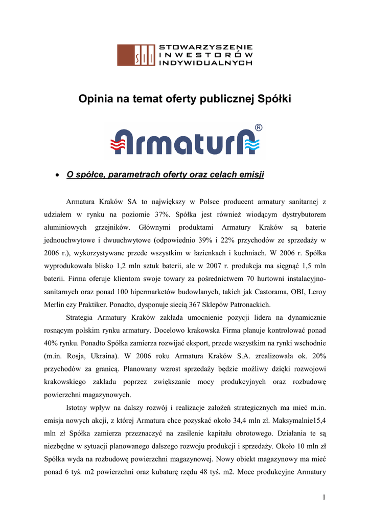 Opinia na temat oferty publicznej Spółki • O spółce, parametrach oferty oraz celach emisji Armatura Kraków SA to największy w Polsce producent armatury sanitarnej z udziałem w rynku na poziomie 37%. Spółka jest również wiodącym dystrybutorem aluminiowych grzejników. Głównymi produktami Armatury Kraków są baterie jednouchwytowe i dwuuchwytowe (odpowiednio 39% i 22% przychodów ze sprzedaży w 2006 r.), wykorzystywane przede wszystkim w łazienkach i kuchniach. W 2006 r. Spółka wyprodukowała blisko 1,2 mln sztuk baterii, ale w 2007 r. produkcja ma sięgnąć 1,5 mln baterii. Firma oferuje klientom swoje towary za pośrednictwem 70 hurtowni instalacyjnosanitarnych oraz ponad 100 hipermarketów budowlanych, takich jak Castorama, OBI, Leroy Merlin czy Praktiker. Ponadto, dysponuje siecią 367 Sklepów Patronackich. Strategia Armatury Kraków zakłada umocnienie pozycji lidera na dynamicznie rosnącym polskim rynku armatury. Docelowo krakowska Firma planuje kontrolować ponad 40% rynku. Ponadto Spółka zamierza rozwijać eksport, przede wszystkim na rynki wschodnie (m.in. Rosja, Ukraina). W 2006 roku Armatura Kraków S.A. zrealizowała ok. 20% przychodów za granicą. Planowany wzrost sprzedaży będzie możliwy dzięki rozwojowi krakowskiego zakładu poprzez zwiększanie mocy produkcyjnych oraz rozbudowę powierzchni magazynowych. Istotny wpływ na dalszy rozwój i realizacje założeń strategicznych ma mieć m.in. emisja nowych akcji, z której Armatura chce pozyskać około 34,4 mln zł. Maksymalnie15,4 mln zł Spółka zamierza przeznaczyć na zasilenie kapitału obrotowego. Działania te są niezbędne w sytuacji planowanego dalszego rozwoju produkcji i sprzedaży. Około 10 mln zł Spółka wyda na rozbudowę powierzchni magazynowej. Nowy obiekt magazynowy ma mieć ponad 6 tyś. m2 powierzchni oraz kubaturę rzędu 48 tyś. m2. Moce produkcyjne Armatury 1 Kraków zostaną zwiększone kosztem około 9 mln zł. W ramach tej kwoty wybudowana zostanie nowa taśma transportowa oraz zostanie wykonany remont pomieszczeń, a także nastąpi reorganizacja procesów produkcyjnych. Zapisy na akcje Armatury Kraków w przypadku inwestorów indywidualnych potrwają od 20 do 24 lipca. Z kolei w transzy instytucjonalnej o jeden dzień dłużej. Cena emisyjna nowych akcji została ustalona na poziomie 1,8 zł. W ramach transzy indywidualnej zaoferowanych zostanie 5 mln walorów. Inwestorzy instytucjonalni będą mogli się zapisywać na 15 mln akcji. Zamknięcie oferty nastąpi 25 lipca. Zapisy na akcje będą przyjmowane w placówkach Domu Maklerskiego PKO BP. Po emisji największym udziałowcem nadal będzie PZU Życie, do którego należeć będzie 67% walorów. • Finanse, parametry wskaźników rynkowych Spółka jest podmiotem o stabilnej kondycji finansowej. Ostatnie 3 lata funkcjonowania na rynku przyniosły wzrost przychodów z poziomu 101,3 mln zł do 130,4 mln zł, czyli o niemal 30%. W tym czasie zysk netto jednak każdego roku spadał. Jeszcze w 2004 roku sięgał poziomu 2,7 mln zł, podczas gdy w 2006 roku zamknął się kwotą 2,15 mln zł. Warto jednak zauważyć, że w tym samym okresie zysk z działalności operacyjnej wzrósł z poziomu 2,5 mln zł do 4,1 mln zł. Tak duża różnica w kształtowaniu się wyniku netto oraz zysku operacyjnego wynikała przede wszystkim z gwałtownego wzrostu kosztów związanych z obsługą zadłużenia oraz leasingu. Przyrost tych pozycji bilansowych wynikał z kolei bezpośrednio z realizowanej przez Spółkę inwestycji budowy nowej fabryki. W przeważającej części wydatki inwestycyjne finansowane były w tym przypadku właśnie przy wykorzystaniu kapitałów obcych – zarówno kredytów bankowych, jak i leasingu Prognozy na bieżący rok zakładają wyraźną poprawę zysku netto. Jego poziom ma wzrosnąć w stosunku do roku 2006 aż o 90% do 4,1 mln zł. W tym samym czasie przychody mają wzrosnąć o 14%, a zysk operacyjny o 66% odpowiednio do poziomów 149,2 mln zł i 6,8 mln zł. Dane te wskazują, że rentowność netto ukształtuje się w bieżącym roku na poziomie 2,7% wobec1,7% w roku poprzednim. Wpływ na planowaną poprawę wyników finansowych w bieżącym roku, niewątpliwie obok świetnej koniunktury budowlanej, miała również wyjątkowo ciepła zima. Obecnie Spółki giełdowe działające w sektorze materiałów budowlanych wyceniane są przez rynek wysoko. Niemniej ze względu na spodziewaną dalszą poprawę ich wyników, parametry wskaźników rynkowych tych firm niewątpliwie ulegną poprawie. Obecny średni 2 wskaźnik C/Z dla sektora materiałów budowlanych, to 46. Z kolei wskaźnik C/WK przyjmuje wartość na poziomie 5,3. Uwzględniając tegoroczną prognozę Armatury oraz ustalony poziom ceny emisyjnej nowych akcji, można założyć, że po wynikach za czwarty kwartał 2007 Spółka będzie notowana ze wskaźnikiem C/Z na poziomie 34 oraz wskaźnikiem C/WK na poziomie 1,5. • Podsumowanie Armatura Kraków to podmiot działający w branży materiałów budowlanych. Od wielu miesięcy spółki o takim profilu cieszą się niesłabnącą popularnością. Wynika to m.in. ze świetnej koniunktury na rynku budowlanym, co bezpośrednio w korzystny sposób rzutuje niemal na wszystkie firmy, które wytwarzają i sprzedają dobra dla tego sektora. Obok przynależności do branży, silnym atutem Spółki jest bardzo mocna pozycja rynkowa (udział Armatury w polskim rynku armatury sanitarnej sięga poziomu 37%). Istotnym atutem jest również sprawdzona i rozpoznawalna marka, czy też wysoka jakość wyrobów. W latach 2004-2006 Spółka ani razu nie zdołała poprawić zysku netto. Rósł w tym czasie natomiast poziom przychodów. W 2006 roku wzrósł wyraźnie także poziom zysku operacyjnego. Za spadający wynik na poziomie netto odpowiedzialny był w tym okresie przede wszystkim gwałtownie rosnący poziom zobowiązań zarówno krótko, jak i długoterminowych. Wynikało to przede wszystkim z prowa