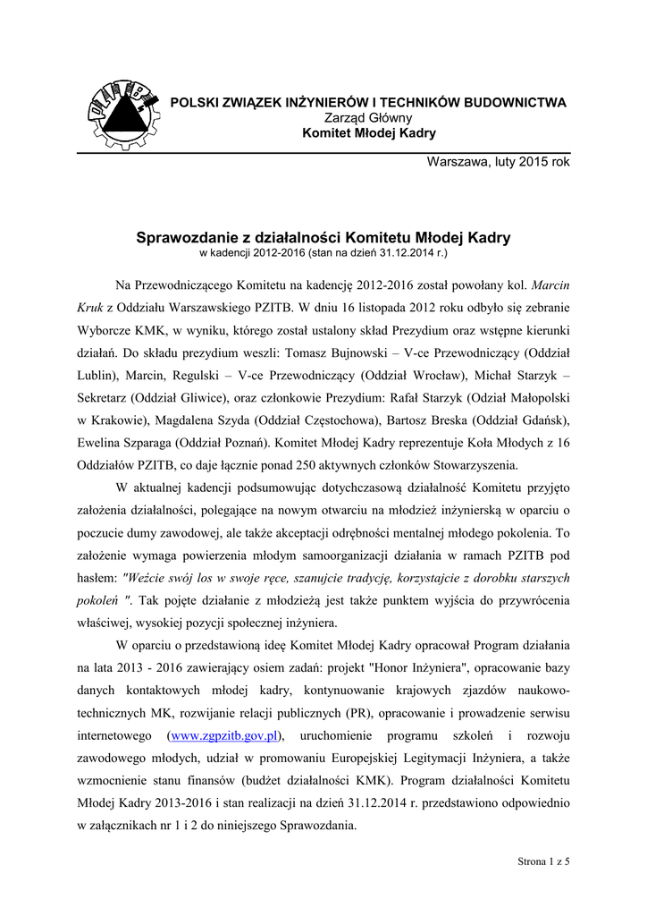 POLSKI ZWIĄZEK INŻYNIERÓW I TECHNIKÓW BUDOWNICTWA Zarząd Główny Komitet Młodej Kadry Warszawa, luty 2015 rok Sprawozdanie z działalności Komitetu Młodej Kadry w kadencji 2012-2016 (stan na dzień 31.12.2014 r.) Na Przewodniczącego Komitetu na kadencję 2012-2016 został powołany kol. Marcin Kruk z Oddziału Warszawskiego PZITB. W dniu 16 listopada 2012 roku odbyło się zebranie Wyborcze KMK, w wyniku, którego został ustalony skład Prezydium oraz wstępne kierunki działań. Do składu prezydium weszli: Tomasz Bujnowski – V-ce Przewodniczący (Oddział Lublin), Marcin, Regulski – V-ce Przewodniczący (Oddział Wrocław), Michał Starzyk – Sekretarz (Oddział Gliwice), oraz członkowie Prezydium: Rafał Starzyk (Odział Małopolski w Krakowie), Magdalena Szyda (Oddział Częstochowa), Bartosz Breska (Oddział Gdańsk), Ewelina Szparaga (Oddział Poznań). Komitet Młodej Kadry reprezentuje Koła Młodych z 16 Oddziałów PZITB, co daje łącznie ponad 250 aktywnych członków Stowarzyszenia. W aktualnej kadencji podsumowując dotychczasową działalność Komitetu przyjęto założenia działalności, polegające na nowym otwarciu na młodzież inżynierską w oparciu o poczucie dumy zawodowej, ale także akceptacji odrębności mentalnej młodego pokolenia. To założenie wymaga powierzenia młodym samoorganizacji działania w ramach PZITB pod hasłem: "Weźcie swój los w swoje ręce, szanujcie tradycję, korzystajcie z dorobku starszych pokoleń ". Tak pojęte działanie z młodzieżą jest także punktem wyjścia do przywrócenia właściwej, wysokiej pozycji społecznej inżyniera. W oparciu o przedstawioną ideę Komitet Młodej Kadry opracował Program działania na lata 2013 - 2016 zawierający osiem zadań: projekt "Honor Inżyniera", opracowanie bazy danych kontaktowych młodej kadry, kontynuowanie krajowych zjazdów naukowotechnicznych MK, rozwijanie relacji publicznych (PR), opracowanie i prowadzenie serwisu internetowego (www.zgpzitb.gov.pl), uruchomienie programu szkoleń i rozwoju zawodowego młodych, udział w promowaniu Europejskiej Legitymacji Inżyniera, a także wzmocnienie stanu finansów (budżet działalności KMK). Program działalności Komitetu Młodej Kadry 2013-2016 i stan realizacji na dzień 31.12.2014 r. przedstawiono odpowiednio w załącznikach nr 1 i 2 do niniejszego Sprawozdania. Strona 1 z 5 Komitet w ramach posiedzeń plenarnych od początku swojej kadencji zbierał się pięciokrotnie (12.01.2013, 06.04.2013, 30.07.2013, 19.05.2014, 22.11.2014). W okresie swojej działalności rozpoczęto kampanię medialną „Honor Inżyniera”, której ideą stało się zainicjowanie autonomicznego ruchu młodzieży inżynierskiej w celu rozwijania i pielęgnowania zamiłowania do pozytywnych wartości oraz podstawowych reguł etycznych zawodu inżyniera budownictwa takich jak: honor, uczciwość, odpowiedzialność. Poprzez kampanię KMK pragnie przywrócić postrzeganie profesji inżyniera budownictwa jako zawodu wiążącego się z odpowiedzialnością i szacunkiem do pracy. Od początku kadencji odbyły się cztery Zjazdy naukowo-techniczne KMK organizowane kolejno przez Oddział Częstochowa (w dn. 10-12.05.2013), Oddział Gliwice (w dn. 18-20.10.2013), Oddział Gdańsk (w dn. 13-14.02.2014) i Oddział Warszawa (w dn. 24-26.10.2014). Zjazdy są okazją do zdobywania wiedzy i doświadczenia w zakresie innowacyjnych rozwiązań technologicznych w budownictwie oraz integracji środowiska. Opracowano nowy serwis internetowy wpisujący się w założenia nowoczesnych rozwiązań multimedialnych (koordynator Michał Starzyk z Oddziału Gliwice oraz Marcin Tryka z Oddziału Bydgoszcz). W 2014 roku KMK rozpoczął kilkuletni program prowadzony w ramach społecznej odpowiedzialności w przedsiębiorstwie dotyczący rozwoju zawodowego młodej kadry inżynierskiej o nazwie „MK START – PZITB”. Program składa się na etapie początkowym z pięciu podprojektów pilotowanych przez poszczególne oddziały, tj.: − projekt praktyk zawodowych (koordynatorzy: Rafał Starzyk z Oddziału Gliwice i Justyna Sypniewska z Oddziału Poznań); − projekt dotyczący rozwoju kampanii bezpieczeństwa pracy w budownictwie (koordynator: Izabela Gałat z Oddziału Lublin); − zjazdy naukowo-techniczne KMK mające na celu poznawanie rozwiązań inżynierskich na przykładzie wznoszonych obiektów budowlanych (koordynacja przez poszczególne oddziały PZITB); − work camps – czyli 2-3 tygodniowe wakacyjne obozy wyjazdowe w ramach wolontariatu, na których młodzi mogą wdrażać w praktyce zdobytą wiedzę pomagając innym (koordynator: Patryk Chojnacki z Oddziału Warszawa); − szkolenia zawodowe z zakresu m.in. prawa budowlanego, projektowania, technologii i wykonawstwa, wprowadzania wyrobów budowlanych na rynek (koordynator: Michał Starzyk z Oddziału Gliwice). Ponadto Komitet Młodej Kadry uczestniczył i promował swoją działalność między innymi w poniższych wydarzeniach: Strona 2 z 5 − 7 czerwca 2013 r. w Warszawie w Sali Senatu Wojskowej Akademii Technicznej (WAT) podczas Ogólnopolskiego Zjazdu Dziekanów Kierunku Budownictwo, − 26-28 czerwca 2013 r. na II Światowym Zjeździe Inżynierów Polskich, − 13 września 2013 r. podczas Konferencji Naukowej w Wałczu – Warsztaty Nadzoru Inwestycyjnego, − 17 września 2013 r. podczas Konferencji Naukowej KILiW PAN oraz KN PZITB „KRYNICA 2013”, − 4 października 2013 r. podczas Centralnych Obchodów Dnia Budowlanych w Warszawie, − 11 października 2013 r. podczas inauguracji roku akademickiego i Zachodniopomorskich Dni Budowlanych organizowanych na Wydziale Budownictwa i Architektury Zachodniopomorskiego Uniwersytetu Technologicznego (ZUT) w Szczecinie, − 13 listopada 2013r. na Studenckim Konkursie Żurawi Wieżowych „Zapuść Żurawia” i studenckiej konferencji naukowej „Budujemy Pasję” na Politechnice Lubelskiej (Wydarzenie „Czas Inżynierów”), − 13 lutego 2014 r.