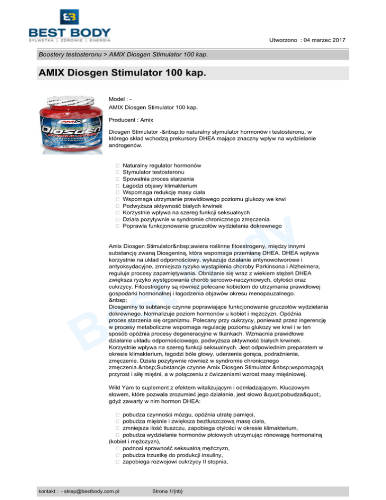 Utworzono : 04 marzec 2017 Boostery testosteronu > AMIX Diosgen Stimulator 100 kap. AMIX Diosgen Stimulator 100 kap. Model : AMIX Diosgen Stimulator 100 kap. Producent : Amix Diosgen Stimulator - to naturalny stymulator hormonów i testosteronu, w którego skład wchodzą prekursory DHEA mające znaczny wpływ na wydzielanie androgenów. � Naturalny regulator hormonów � Stymulator testosteronu � Spowalnia proces starzenia � Łagodzi objawy klimakterium � Wspomaga redukcję masy ciała � Wspomaga utrzymanie prawidłowego poziomu glukozy we krwi � Podwyższa aktywność białych krwinek � Korzystnie wpływa na szereg funkcji seksualnych � Działa pozytywnie w syndromie chronicznego zmęczenia � Poprawia funkcjonowanie gruczołów wydzielania dokrewnego y d o B Amix Diosgen Stimulator awiera roślinne fitoestrogeny, między innymi substancję zwaną Diosgeniną, która wspomaga przemianę DHEA. DHEA wpływa korzystnie na układ odpornościowy, wykazuje działanie antynowotworowe i antyoksydacyjne, zmniejsza ryzyko wystąpienia choroby Parkinsona i Alzheimera, reguluje procesy zapamiętywania. Obniżanie się wraz z wiekiem stężeń DHEA zwiększa ryzyko występowania chorób sercowo-naczyniowych, otyłości oraz cukrzycy. Fitoestrogeny są również polecane kobietom do utrzymania prawidłowej gospodarki hormonalnej i łagodzenia objawów okresu menopauzalnego. Diosgeniny to subtancje czynne poprawiające funkcjonowanie gruczołów wydzielania dokrewnego. Normalizuje poziom hormonów u kobiet i mężczyzn. Opóźnia proces starzenia się organizmu. Polecany przy cukrzycy, ponieważ przez ingerencję w procesy metaboliczne wspomaga regulację poziomu glukozy we krwi i w ten sposób opóźnia procesy degeneracyjne w tkankach. Wzmacnia prawidłowe działanie układu odpornościowego, podwyższa aktywność białych krwinek. Korzystnie wpływa na szereg funkcji seksualnych. Jest odpowiednim preparatem w okresie klimakterium, łagodzi bóle głowy, uderzenia gorąca, podrażnienie, zmęczenie. Działa pozytywnie również w syndromie chronicznego zmęczenia. Substancje czynne Amix Diosgen Stimulator wspomagają przyrost i siłę mięśni, a w połączeniu z ćwiczeniami wzrost masy mięśniowej. t s e B Wild Yam to suplement z efektem witalizującym i odmładzającym. Kluczowym słowem, które pozwala zrozumieć jego działanie, jest słowo "pobudza", gdyż zawarty w nim hormon DHEA: � pobudza czynności mózgu, opóźnia utratę pamięci, � pobudza mięśnie i zwiększa beztłuszczową masę ciała, � zmniejsza ilość tłuszczu, zapobiega otyłości w okresie klimakterium, � pobudza wydzielanie hormonów płciowych utrzymując rónowagę hormonalną (kobiet i mężczyzn), � podnosi sprawność seksualną mężczyzn, � pobudza trzustkę do produkcji insuliny, � zapobiega rozwojowi cukrzycy II stopnia, kontakt : - [email protected] Strona 1/{nb} Utworzono : 04 marzec 2017 Boostery testosteronu > AMIX Diosgen Stimulator 100 kap. AMIX Diosgen Stimulator 100 kap. � zwiększa poziom energii i usuwa oznaki zmęczenia, � w okresie klimakterium pobudza tworzenie masy kostnej (w osteoporozie), � pobudza układ odporności. Wild Yam (nazywany po polsku dzikim jamem) jest wieloletnią, trawiastą rośliną, w korzeniach której naukowcy znależli roslinne fitoestrogeny. Uznano ją za naturalne źródło hormonu, którego nazwa brzmi - dehydroepiandosten - DHEA. Co to jest DHEA i jaka jest jego funkcja? DHEA jest hormonem, który produkuje przysadka mózgowa, skóra i nadnercza. Nazywany jest też hormonem matrycowym lub hormonem matczynym, bo podobnie jak niedzielny rosół służy gospodyni do sporządzenia innych potraw, tak DHEA wykorzystywany jest do produkcji brakujących hormonów. Jego poziom w organizmie wiąże się z procesem starzenia, bo ilość DHEA wyraźnie spada z wiekiem, co powoduje pogorszenie sprawności fizycznej i umysłowej. Istnieje teoria, że wzrost poziomu DHEA do wartości z młodzieńczych lat może powstrzymać upływający czas, a nawet cofnąć niektóre zmiany starcze. Dlatego też DHEA zaliczany jest do substancji odmładzających, tzw. eliksirów młodości. Jego poziom w organizmie można podnieść, przyjmując roślinne prekursory pochodzące np. z dzikiego jamu. Skład: 1 kap. zawiera 190mg Wild Yam Root Extract [ekstrakt z dzikiego Pochrzynu] (w tym 30mg saponin diosgeninowych) o B Wielkość porcji: 1 kap. Ilość porcji w opakowaniu: 100 t s e B y d Dawkowanie i sposób użycia: stosować 1-2 kapsułki Wild Yam dziennie przed treningiem. W dzień bez treningowy stosować 1 kap. w południe wraz z posiłkiem. UWAGA - kopiowanie oraz rozpowrzechnianie opisów jest zabronione przez BEST BODY © 2013. Ustawa z dnia 4 lutego 1994 r. o prawie autorskim i prawach pokrewnych (Dz. U. z 2006 r. Nr 90, poz. 631 z późn. zm.). Ochrona autorskich praw osobistych: Twórca, którego autorskie prawa osobiste zostały zagrożone cudzym działaniem, może żądać zaniechania tego działania. W razie dokonanego naruszenia może także żądać, aby osoba, która dopuściła się naruszenia, dopełniła czynności potrzebnych do usunięcia jego skutków, w szczególności, aby złożyła publiczne oświadczenie o odpowiedniej treści i formie. Jeżeli naruszenie było zawinione, sąd może przyznać twórcy odpowiednią sumę pieniężną tytułem zadośćuczynienia za doznaną krzywdę albo - na żądanie twórcy - zobowiązać sprawcę, aby uiścił odpowiednią sumę pieniężną na wskazany przez twórcę cel społeczny. Cena : 69,00 zł Brutto ( 64,49 zł Netto) kontakt : - [email protected] Strona 2/{nb} Utworzono : 04 marzec 2017 Boostery testosteronu > AMIX Diosgen Stimulator 100 kap. AMIX Diosgen Stimulator 100 kap. Dostępność: Produkt dostępny w naszym sklepie od 19 wrzesień 2013 t s e B kontakt : - [email protected] Strona 3/{nb} o B y d