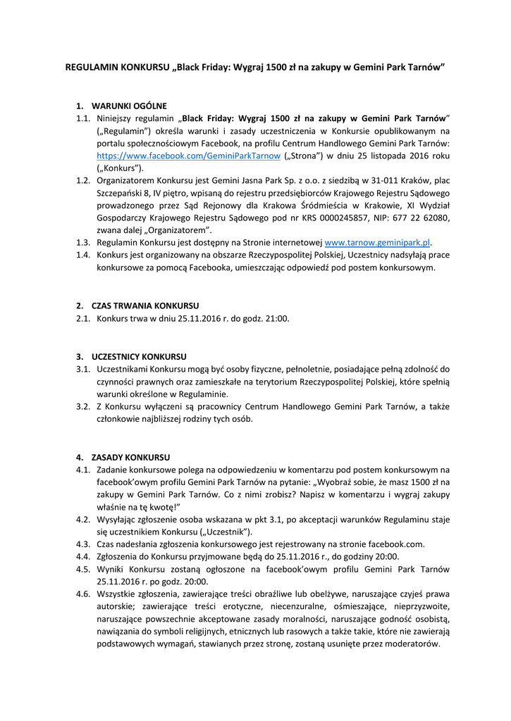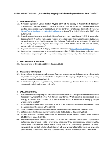 REGULAMIN KONKURSU „Black Friday: Wygraj 1500 zł na zakupy w Gemini Park Tarnów” 1. WARUNKI OGÓLNE 1.1. Niniejszy regulamin „Black Friday: Wygraj 1500 zł na zakupy w Gemini Park Tarnów” („Regulamin”) określa warunki i zasady uczestniczenia w Konkursie opublikowanym na portalu społecznościowym Facebook, na profilu Centrum Handlowego Gemini Park Tarnów: https://www.facebook.com/GeminiParkTarnow („Strona”) w dniu 25 listopada 2016 roku („Konkurs”). 1.2. Organizatorem Konkursu jest Gemini Jasna Park Sp. z o.o. z siedzibą w 31-011 Kraków, plac Szczepański 8, IV piętro, wpisaną do rejestru przedsiębiorców Krajowego Rejestru Sądowego prowadzonego przez Sąd Rejonowy dla Krakowa Śródmieścia w Krakowie, XI Wydział Gospodarczy Krajowego Rejestru Sądowego pod nr KRS 0000245857, NIP: 677 22 62080, zwana dalej „Organizatorem”. 1.3. Regulamin Konkursu jest dostępny na Stronie internetowej www.tarnow.geminipark.pl. 1.4. Konkurs jest organizowany na obszarze Rzeczypospolitej Polskiej, Uczestnicy nadsyłają prace konkursowe za pomocą Facebooka, umieszczając odpowiedź pod postem konkursowym. 2. CZAS TRWANIA KONKURSU 2.1. Konkurs trwa w dniu 25.11.2016 r. do godz. 21:00. 3. UCZESTNICY KONKURSU 3.1. Uczestnikami Konkursu mogą być osoby fizyczne, pełnoletnie, posiadające pełną zdolność do czynności prawnych oraz zamieszkałe na terytorium Rzeczypospolitej Polskiej, które spełnią warunki określone w Regulaminie. 3.2. Z Konkursu wyłączeni są pracownicy Centrum Handlowego Gemini Park Tarnów, a także członkowie najbliższej rodziny tych osób. 4. ZASADY KONKURSU 4.1. Zadanie konkursowe polega na odpowiedzeniu w komentarzu pod postem konkursowym na facebook’owym profilu Gemini Park Tarnów na pytanie: „Wyobraź sobie, że masz 1500 zł na zakupy w Gemini Park Tarnów. Co z nimi zrobisz? Napisz w komentarzu i wygraj zakupy właśnie na tę kwotę!” 4.2. Wysyłając zgłoszenie osoba wskazana w pkt 3.1, po akceptacji warunków Regulaminu staje się uczestnikiem Konkursu („Uczestnik”). 4.3. Czas nadesłania zgłoszenia konkursowego jest rejestrowany na stronie facebook.com. 4.4. Zgłoszenia do Konkursu przyjmowane będą do 25.11.2016 r., do godziny 20:00. 4.5. Wyniki Konkursu zostaną ogłoszone na facebook’owym profilu Gemini Park Tarnów 25.11.2016 r. po godz. 20:00. 4.6. Wszystkie zgłoszenia, zawierające treści obraźliwe lub obelżywe, naruszające czyjeś prawa autorskie; zawierające treści erotyczne, niecenzuralne, ośmieszające, nieprzyzwoite, naruszające powszechnie akceptowane zasady moralności, naruszające godność osobistą, nawiązania do symboli religijnych, etnicznych lub rasowych a także takie, które nie zawierają podstawowych wymagań, stawianych przez stronę, zostaną usunięte przez moderatorów. 4.7. Celem zapewnienia prawidłowej organizacji i przebiegu Konkursu, a w szczególności w celu dokonania oceny prawidłowości zgłoszeń konkursowych oraz dokonania wyboru zwycięzców, Organizator powoła Komisję Konkursową. W skład Komisji Konkursowej wejdą osoby delegowane przez Organizatora. 4.8. Informację o wygranej Zwycięzca otrzyma w formie wiadomości prywatnej oraz komentarza pod zgłoszeniem. 4.9. Jeden Uczestnik może jednokrotnie wziąć udział w Konkursie, czyli napisać odpowiedź na zadanie konkursowe. Komentarz nie może być edytowany. 5. PRZETWARZANIE DANYCH OSOBOWYCH I PRAWA AUTORSKIE 5.1. Administratorem danych osobowych uczestników Konkursu jest Gemini Jasna Park Sp. z o.o. z siedzibą w 31-011 Kraków, plac Szczepański 8, IV piętro, wpisaną do rejestru przedsiębiorców Krajowego Rejestru Sądowego prowadzonego przez Sąd Rejonowy dla Krakowa Śródmieścia w Krakowie, XI Wydział Gospodarczy Krajowego Rejestru Sądowego pod nr KRS 0000245857, NIP: 677 22 62080. 5.2. Dane osobowe przetwarzane będą wyłącznie w celach związanych z Konkursem – przyznania i wydania Nagrody. Podanie danych osobowych jest dobrowolne, ale niezbędne do otrzymania Nagrody. 5.3. Uczestnicy maja prawo wglądu w swoje dane, prawo ich poprawiania oraz żądania usunięcia. 5.4. Przystąpienie do Konkursu równoznaczne jest ze zgodą na wykonanie dokumentacji zdjęciowej zawierającej wizerunek Zwycięzcy podczas realizacji nagrody oraz na upowszechnienie wizerunku na facebook’owym profilu Gemini Park Tarnów oraz stronie internetowej Centrum Handlowego www.tarnow.geminipark.pl. 6. NAGRODY 6.1. Nagrodą w konkursie są zakupy modowe w Centrum Handlowym Gemini Park Tarnów o wartości 1500 zł. 6.2. Sklepy wyłączone z udziału w Konkursie: hipermarkety (Castorama, Tesco, Media Markt), kantor, apteki produkty: alkoholowe, tytoniowe i elektroniczne. 6.3. Termin realizacji nagrody to wyłącznie: 26.11.2016 r. w godzinach: 9:00 – 15:00. 6.4. Nagroda nie może zostać przekazana na inną osobę oraz nie podlega wymianie na gotówkę. 6.5. Niewykorzystane środki pieniężne podczas zakupów przechodzą na rzecz Organizatora oraz nie podlegają wypłacie. 7. REKLAMACJE 7.1. Każdemu Uczestnikowi przysługuje prawo wniesienia reklamacji związanej z Konkursem – począwszy od daty rozpoczęcia Konkursu do 14 dni od daty zakończenia Konkursu. Decyduje data stempla pocztowego. Reklamacje, które wpłyną do Organizatora po ww. terminie nie będą rozpatrywane. Reklamacje należy zgłaszać wyłącznie w formie pisemnej listem poleconym, na adres Organizatora z dopiskiem „Reklamacja do konkursu Gemini Park Tarów”. Reklamacja powinna zawierać: imię, nazwisko, adres Uczestnika, przyczynę reklamacji wraz z jej uzasadnieniem oraz podpis. 7.2. Reklamacje będą rozpatrywane przez Organizatora w terminie 7 dni roboczych od daty ich otrzymania. O decyzji Organizatora Uczestnik zostanie powiadomiony listem poleconym wysłanym na adres podany w reklamacji niezwłocznie po jej rozpatrzeniu (decyduje data stempla pocztowego). 7.3. Prawo złożenia reklamacji przysługuje jedynie Uczestnikom Konkursu. 7