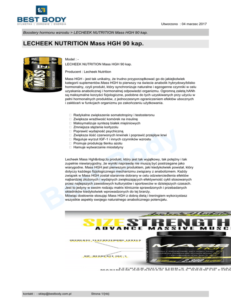 Utworzono : 04 marzec 2017 Boostery hormonu wzrostu > LECHEEK NUTRITION Mass HGH 90 kap. LECHEEK NUTRITION Mass HGH 90 kap. Model : LECHEEK NUTRITION Mass HGH 90 kap. Producent : Lecheek Nutrition Mass HGH - jest tak unikalny, że trudno przyporządkować go do jakiejkolwiek kategorii suplementów.Mass HGH to pierwszy na świecie anabolik hybrydowy/blisko hormonalny, czyli produkt, który synchronizuje naturalne i egzogenne czynniki w celu uzyskania anabolicznej i hormonalnej odpowiedzi organizmu. Ogromną zaletą hANh są maksymalne korzyści fizjologiczne, podobne do tych uzyskiwanych przy użyciu w pełni hormonalnych produktów, z jednoczesnym ograniczeniem efektów ubocznych i zakłóceń w funkcjach organizmu po zakończeniu użytkowania. � Radykalne zwiększenie somatotropiny i testosteronu � Zwiększa wrażliwość komórek na insulinę � Maksymalizuje syntezę białek mięśniowych � Zmniejsza stężenie kortyzolu � Poprawić wydajność psychiczną � Zwiększa ilość czerwonych krwinek i poprawić przepływ krwi � Reguluje wyrzut IGF-1 i innych czynników wzrostu � Promuje produkcję tlenku azotu � Hamuje wytwarzanie miostatyny o B y d Lecheek Mass Hgh to produkt, który jest tak wyjątkowy, tak potężny i tak zupełnie niewiarygodny, że wyniki naprawdę nie muszą być postrzegane jako wiarygodne. Mass HGH jest pierwszym produktem, jaki kiedykolwiek powstał, który dotyczy każdego fizjologicznego mechanizmu związany z anabolizmem. Każdy związek w Mass HGH został starannie dobrany w celu odzwierciedlenia efektów najbardziej złożonych i wydajnych zwiększających efektywność cykli stosowanych przez najlepszych zawodowych kulturystów i sportowców w dzisiejszych czasach. Jest to jedyny w swoim rodzaju matrix klinicznie sprawdzonych i przebadanych składników kiedykolwiek wprowadzonych do tej branży. Mówiąc dosłownie stosując Mass HGH z dobrą dietą i treningiem wykorzystasz wszystkie aspekty swojego naturalnego anabolicznego potencjału. t s e B kontakt : - [email protected] Strona 1/{nb} Utworzono : 04 marzec 2017 Boostery hormonu wzrostu > LECHEEK NUTRITION Mass HGH 90 kap. LECHEEK NUTRITION Mass HGH 90 kap. Główne cechy Lecheek Nutrition Mas HGH to: � Zwiększa uwalnianie hormonu wzrostu (STH), utratę tkanki tłuszczowej, napięcie mięśniowe, libido i wigor seksualny! � Zawiera specjalną formułę o udowodnionym naukowo działaniu, w której skład wchodzą wyłącznie bezpieczne składniki mające za zadanie odnowę i optymalizację zawartości kluczowych hormonów spowalniających fizjologiczny proces starzenia się. Czy to możliwe, aby ten suplement, nie będący lekiem zrewolucjonizował rynek pod kątem podtrzymania młodości, wigoru i energii? Co gdyby okazało się, że dzięki Lecheek Mass HGH możesz mieć więcej młodzieńczego wigoru, szczuplejszą sylwetkę oraz jędrną i elastyczną skórę w zaledwie kilka tygodni? Każdy z nas obawia się o to, co będzie, gdy z wiekiem poziom hormonu wzrostu zacznie spadać, a ciało naturalnie podda się procesowi starzenia. Nikt tego nie chce to pewne! Czemu hormon wzrostu jest taki ważny? Dzięki niemu komórki macierzyste, kości, tkanki i mięśnie stale rozrastają się od wieku dziecięcego. Niestety po 25 roku życia ilość STH zaczyna spadać, każdego roku pozbawiając nas młodości. Po 30 roku życia nasz organizm nie produkuje już wystarczające ilości STH, aby zbilansować jego utratę z zapotrzebowaniem, a jego ilość nadal spada. Niższe poziomy STH mogą powodować różne dolegliwości, których wcześniej nie łączyłeś ze spadkiem tego hormonu. Czy szybciej się męczysz? Czy masz problemy ze snem? Czy masz problemy z trawieniem? Czy siwiejesz? Czy pojawiają się pierwsze zmarszczki? Czy czujesz, że masz mniej sił? Czy odczuwasz mniejsze napięcie mięśniowe? Jeżeli odpowiedziałeś pozytywnie na kilka z tych pytań, to możliwe, że jest to oznaka niskiego poziomu hormonu wzrostu. t s e B o B Składniki aktywne: Ilość w porcji (3 kap.) Mass HGH blend: 2 300 mg Chlorophytum Borivilianum Mucuna Pruriens (Velvet Bean) [L-Dopa] 4-aminobutanic acid kontakt : - [email protected] Strona 2/{nb} y d Utworzono : 04 marzec 2017 Boostery hormonu wzrostu > LECHEEK NUTRITION Mass HGH 90 kap. LECHEEK NUTRITION Mass HGH 90 kap. Cantella Asiatica Glycyrrhiza Glabra Catharanthus Rosus 4-hydroxy-3-methoxyphenyl y d Valerian Root Withania Somnifera t s e B o B Wielkość porcji: 3 kap. Ilość porcji w opakowaniu: 30 Dawkowanie i sposób użycia: stosować 3 kap. Mass HGH codziennie 30 minut przed snem. Nie przekraczać dawki 4 kap. dziennie. UWAGA - kopiowanie oraz rozpowrzechnianie opisów jest zabronione przez BEST BODY © 2013. Ustawa z dnia 4 lutego 1994 r. o prawie autorskim i prawach pokrewnych (Dz. U. z 2006 r. Nr 90, poz. 631 z późn. zm.). Ochrona autorskich praw osobistych: Twórca, którego autorskie prawa osobiste zostały zagrożone cudzym działaniem, może żądać zaniechania tego działania. W razie dokonanego naruszenia może także żądać, aby osoba, która dopuściła się naruszenia, dopełniła czynności potrzebnych do usunięcia jego skutków, w szczególności, aby złożyła publiczne oświadczenie o odpowiedniej treści i formie. Jeżeli naruszenie było zawinione, sąd może przyznać twórcy odpowiednią sumę pieniężną tytułem zadośćuczynienia za doznaną krzywdę albo - na żądanie twórcy - zobowiązać sprawcę, aby uiścił odpowiednią sumę pieniężną na wskazany przez twórcę cel społeczny. Cena : 199,00 zł Brutto ( 185,98 zł Netto) kontakt : - [email protected] Strona 3/{nb} Utworzono : 04 marzec 2017 Boostery hormonu wzrostu > LECHEEK NUTRITION Mass HGH 90 kap. LECHEEK NUTRITION Mass HGH 90 kap. Dostępność: Produkt dostępny w naszym sklepie od 10 listopad 2013 t s e B kontakt : - [email protected] Strona 4/{nb} o B y d