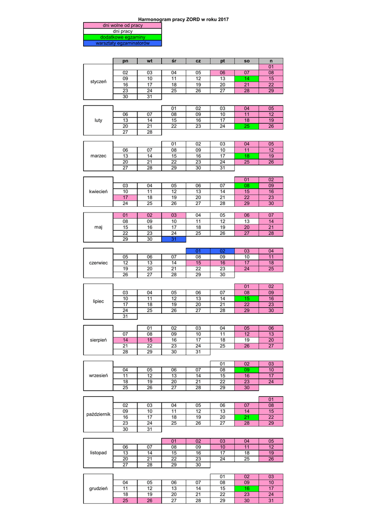 Harmonogram pracy ZORD w roku 2017 dni wolne od pracy dni pracy dodatkowe egzaminy warsztaty egzaminatorów styczeń luty marzec kwiecień maj czerwiec lipiec sierpień wrzesień październik listopad grudzień pn wt śr cz pt so 02 09 16 23 30 03 10 17 24 31 04 11 18 25 05 12 19 26 06 13 20 27 07 14 21 28 n 01 08 15 22 29 06 13 20 27 07 14 21 28 01 08 15 22 02 09 16 23 03 10 17 24 04 11 18 25 05 12 19 26 06 13 20 27 07 14 21 28 01 08 15 22 29 02 09 16 23 30 03 10 17 24 31 04 11 18 25 05 12 19 26 03 10 17 24 04 11 18 25 05 12 19 26 06 13 20 27 07 14 21 28 01 08 15 22 29 02 09 16 23 30 01 08 15 22 29 02 09 16 23 30 03 10 17 24 31 04 11 18 25 05 12 19 26 06 13 20 27 07 14 21 28 05 12 19 26 06 13 20 27 07 14 21 28 01 08 15 22 29 02 09 16 23 30 03 10 17 24 04 11 18 25 03 10 17 24 31 04 11 18 25 05 12 19 26 06 13 20 27 07 14 21 28 01 08 15 22 29 02 09 16 23 30 07 14 21 28 01 08 15 22 29 02 09 16 23 30 03 10 17 24 31 04 11 18 25 05 12 19 26 06 13 20 27 04 11 18 25 05 12 19 26 06 13 20 27 07 14 21 28 01 08 15 22 29 02 09 16 23 30 03 10 17 24 02 09 16 23 30 03 10 17 24 31 04 11 18 25 05 12 19 26 06 13 20 27 07 14 21 28 01 08 15 22 29 06 13 20 27 07 14 21 28 01 08 15 22 29 02 09 16 23 30 03 10 17 24 04 11 18 25 05 12 19 26 04 11 18 25 05 12 19 26 06 13 20 27 07 14 21 28 01 08 15 22 29 02 09 16 23 30 03 10 17 24 31