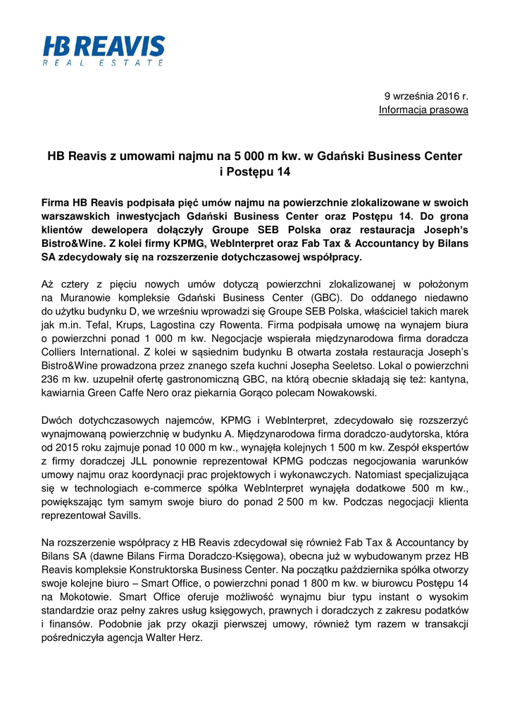 9 wrze nia 2016 r. Informacja prasowa HB Reavis z umowami najmu na 5 000 m kw. w Gdański Business Center i Postępu 14 Firma HB Reavis podpisała pięć umów najmu na powierzchnie zlokalizowane w swoich warszawskich inwestycjach Gdański Business Center oraz Postępu 14. Do grona klientów dewelopera dołączyły Groupe SEB Polska oraz restauracja Joseph’s Bistro&Wine. Z kolei firmy KPMG, WebInterpret oraz Fab Tax & Accountancy by Bilans SA zdecydowały się na rozszerzenie dotychczasowej współpracy. Aż cztery z pięciu nowych umów dotyczą powierzchni zlokalizowanej w położonym na Muranowie kompleksie Gdański Business Center (GBC). Do oddanego niedawno do użytku budynku D, we wrze niu wprowadzi się Groupe SEB Polska, wła ciciel takich marek jak m.in. Tefal, Krups, Lagostina czy Rowenta. Firma podpisała umowę na wynajem biura o powierzchni ponad 1 000 m kw. Negocjacje wspierała międzynarodowa firma doradcza Colliers International. Z kolei w sąsiednim budynku B otwarta została restauracja Joseph’s Bistro&Wine prowadzona przez znanego szefa kuchni Josepha Seeletso. Lokal o powierzchni 236 m kw. uzupełnił ofertę gastronomiczną GBC, na którą obecnie składają się teżŚ kantyna, kawiarnia Green Caffe Nero oraz piekarnia Gorąco polecam Nowakowski. Dwóch dotychczasowych najemców, KPMG i WebInterpret, zdecydowało się rozszerzyć wynajmowaną powierzchnię w budynku A. Międzynarodowa firma doradczo-audytorska, która od 2015 roku zajmuje ponad 10 000 m kw., wynajęła kolejnych 1 500 m kw. Zespół ekspertów z firmy doradczej JLL ponownie reprezentował KPMG podczas negocjowania warunków umowy najmu oraz koordynacji prac projektowych i wykonawczych. Natomiast specjalizująca się w technologiach e-commerce spółka WebInterpret wynajęła dodatkowe 500 m kw., powiększając tym samym swoje biuro do ponad 2 500 m kw. Podczas negocjacji klienta reprezentował Savills. Na rozszerzenie współpracy z HB Reavis zdecydował się również Fab Tax & Accountancy by Bilans SA (dawne Bilans Firma Doradczo-Księgowa), obecna już w wybudowanym przez HB Reavis kompleksie Konstruktorska Business Center. Na początku października spółka otworzy swoje kolejne biuro – Smart Office, o powierzchni ponad 1 800 m kw. w biurowcu Postępu 14 na Mokotowie. Smart Office oferuje możliwo ć wynajmu biur typu instant o wysokim standardzie oraz pełny zakres usług księgowych, prawnych i doradczych z zakresu podatków i finansów. Podobnie jak przy okazji pierwszej umowy, również tym razem w transakcji po redniczyła agencja Walter Herz. - W ciągu ostatnich kilku miesięcy odnotowaliśmy rosnące zapotrzebowanie na powierzchnię biurową w Warszawie. Szczególnym powodzeniem cieszą się inwestycje pozwalające najemcom zawczasu zabezpieczyć potencjalne poszerzenie powierzchni biurowej w przyszłości. Umowy podpisane przez nas w ostatnim czasie potwierdzają, że na rynku jest zapotrzebowanie na dobrze zaprojektowaną, wysokiej jakości przestrzeń biurową w dobrych lokalizacjach. Taką właśnie powierzchnię oferujemy – mówi Karol Wyka, Senior Leasing Manager w firmie HB Reavis. Firma HB Reavis działa w Polsce od 2008 r. Dotychczas dostarczyła na stołeczny rynek ponad 184 500 m kw. nowoczesnej powierzchni biurowej, zlokalizowanej w ramach trzech inwestycji: Konstruktorska Business Center, Gdański Business Center oraz Postępu 14. W realizacji pozostaje powstający w bezpo rednim sąsiedztwie dworca kolejowego Warszawa Zachodnia kompleks West Station o całkowitej powierzchni najmu 68 500 m kw. O grupie HB Reavis HB Reavis to międzynarodowa grupa deweloperska założona w 1993 roku w Bratysławie i działająca w Wielkiej Brytanii, Polsce, Czechach, a także na Słowacji, Węgrzech oraz w Turcji. Dotychczas grupa zrealizowała ponad 871 tys. m kw. nowoczesnej powierzchni biurowej, handlowo-rozrywkowej i logistycznej, a kolejne 1,12 mln m kw. znajduje się obecnie w realizacji lub procesach przygotowawczych. HB Reavis wykorzystuje zintegrowany model biznesu, który obejmuje działania deweloperskie i wykonawcze oraz zarządzanie majątkiem i inwestycjami. Grupa zatrudnia ponad 500 osób i dysponuje aktywami w wysoko ci 2,1 mld euro, o warto ci netto na poziomie 1,2 mld euro, co czyni ją liderem na globalnym rynku nieruchomo ci komercyjnych. Potwierdzeniem silnej pozycji HB Reavis są liczne wyróżnienia, m.in. tytuł „Najlepszego Projektu Architektonicznego Roku” dla inwestycji 33 Central w konkursie UK Property Awards oraz „Dewelopera Roku w Europie rodkowo-Wschodniej 2015” w CEE Quality Awards. Więcej informacji znajduje się na stronie internetowej http://www.hbreavis.com. Informacje dla mediów: Marta Pośniak PR Manager HB Reavis Group +48 600 912 196 [email protected] Przemysław Polak PR Manager biuro PR +48 505 126 184 [email protected]