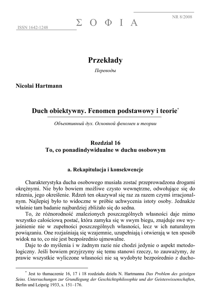 Σ Ο Φ Ι Α ISSN 1642-1248 NR 8/2008 7/2007 NR 8/2008 Przekłady Переводы Nicolai Hartmann Duch obiektywny. Fenomen podstawowy i teorie* Объективный дух. Основной феномен и теории Rozdział 16 To, co ponadindywidualne w duchu osobowym a. Rekapitulacja i konsekwencje Charakterystyka ducha osobowego musiała zostać przeprowadzona drogami okrężnymi. Nie było bowiem możliwe czysto wewnętrzne, odwołujące się do rdzenia, jego określenie. Rdzeń ten okazywał się raz za razem czymś irracjonalnym. Najlepiej było to widoczne w próbie uchwycenia istoty osoby. Jednakże właśnie tam badanie najbardziej zbliżało się do sedna. To, że różnorodność znalezionych poszczególnych własności daje mimo wszystko całościową postać, która zamyka się w swym biegu, znajduje swe wyjaśnienie nie w zupełności poszczególnych własności, lecz w ich naturalnym powiązaniu. One rozjaśniają się wzajemnie, uzupełniają i otwierają w ten sposób widok na to, co nie jest bezpośrednio ujmowalne. Daje to do myślenia i w żadnym razie nie chodzi jedynie o aspekt metodologiczny. Jeśli bowiem przyjrzymy się temu stanowi rzeczy, to zauważymy, że prawie wszystkie wyliczone własności nie są wydobyte bezpośrednio z ducho* Jest to tłumaczenie 16, 17 i 18 rozdziału dzieła N. Hartmanna Das Problem des geistigen Seins. Untersuchungen zur Grundlegung der Geschichtsphilosophie und der Geisteswissenschaften, Berlin und Leipzig 1933, s. 151–176. 250 Переводы wego indywiduum, lecz ze stosunków, w których występuje. Dystans, obiektywność, poznanie pokazują formy „orientacji na świat”. Obecność w strumieniu zdarzeń, bycie zakorzenionym, emocjonalno-transcendentne akty, ekspansywność osoby w swym kręgu życiowym mają wyraźnie charakter relacji. Określają ducha z jego stosunku do świata. Potęguje się to tym bardziej, im bardziej zbliżamy się do sfery etosu. Przewidywanie, celowość, przewaga (Macht) nad bytem ducha pozbawionym świadomości wartości i tego konsekwencje wyznaczają szczególne miejsce duchowej istoty w świecie. Zdradzają bezpośrednio, czym właściwie jest duch osobowy. Nie są jednakże ani pojedynczo, ani wespół poszukiwanym rdzeniem. Taka charakterystyka „z zewnątrz” musiałaby być z gruntu ułomna, gdyby te wszystkie stosunki były czymś zewnętrznym wobec ducha osobowego. Zyskuje jednakże swą prawomocność, jeśli jego stosunek do świata, w którym żyje, stanowi jego własną istotę, tzn. jeśli jest tym, co konstytuuje określoność jego bezpośrednio niemożliwego do ujęcia wnętrza. Jeśli chodziłoby jedynie o obecność w materialnym świecie, to można by wątpić, czy dotyczy ona ducha osobowego. Natomiast wraz ze sferą etosu ustanowione zostaje odniesienie, które wiąże ducha z obszarem jemu podobnych jestestw. Właśnie to odniesienie wydaje się być istotną składową określenia, inną zaś jest wolność. Nie można zatem wątpić, że chodzi o samą istotę osoby. Nie powinno także zostać pominięte to, że najważniejsze określenia są uzyskiwane w sferze, która sięga daleko ponad konkretną osobę, w interpersonalnej sferze wzajemnych zależności i odniesień, która ogrania i unosi różnorodność przeżyć i cierpień, działania i odpowiedzialności, uczestnictwa i przeszłości. Trzeba również zauważyć, że sfera ta ma ponownie charakter duchowego tworu – gdyż nie chodzi tu o prostą wspólnotę życia – ma zatem charakter ponadindywidualnej struktury duchowej, której oczywiście nie buduje dopiero pojedyncza osoba, lecz raczej ją już zastaje. Ta sfera duchowej wspólnoty, to wspólne życie ducha, które wznosi się nad jednostkami, wiąże [je] i unosi, gdyż tworzy grunt ich wzrastania i zróżnicowania, jest życiem ducha obiektywnego. Jest zatem prawdą, że najbardziej istotne składowe określenia ducha osobowego zostały pozyskane nie bezpośrednio z niego, lecz z ducha obiektywnego, i to bez konieczności jego poznania jako takiego. Jeśli zatem wszelka charakterystyka i określenie nieuchronnie wiedzie od tego, co znane, do tego, co nieznane, to wynika z tego, że bardziej znanym w porównaniu z duchem osobowym jest duch obiektywny. Ten stan rzeczy, choć na pierwszy rzut oka mało zrozumiały, stanowi jednak podstawę naszej wiedzy o bycie duchowym. Jest właśnie odwrotnie niż sądzi naiwne myślenie: nie duchowe indywiduum, lecz duchowa wspólnota jest tym, co w życiu bezpośrednio ujmowalne i możliwe do uchwycenia. Tylko cielesna obecność osoby zwodzi nas w rozumieniu jej istoty; rzeczywista istota osoby wymaga uczestnictwa Przekłady 251 i osobowego zaangażowania [Hingebung]; w przeciwnym razie dostęp do niej nie jest możliwy. Duch obiektywny natomiast jest oczywistością naszego życia ludzkiego, której dlatego tylko nie zauważamy, gdyż w niej całkowicie żyjemy i oddychamy. Konieczne jest zatem zwrócenie uwagi na to, co niezauważone. Nie ma tu żadnej tajemnicy, którą należy odkryć, ani zagadki – przynajmniej na początku. Chodzi po prostu o uchwycenie fenomenu. Na tym tle kolejny krok naszych analiz jest łatwiejszy i bardziej zrozumiały. Należy tylko zdystansować się wobec nadmiernych oczekiwań i metafizycznych założeń, a temat swobodnie zostanie przeprowadzony. Samo badanie nie ma w żadnym razie do czynienia z metafizycznymi pytaniami. Zapewne graniczy z nimi i nie może ich uniknąć, a nawet się z nimi pokrywa. Jednakże jego własny bieg jest biegiem rozsądnym, ścisłe związanym z fenomenem i w istocie deskryptywnym. b. Uwolnienie się duchowych treści Jeśli wychodzi się od ducha osobowego – jako czegoś pozornie bezpośrednio danego – to natrafia się w nim na cały szereg własności, które prowadzą w prostej linii do ducha obiektywnego. Tego rodzaju własnościami są w nim wszystkie momenty, w których ukazuje się jego ekspansywność. Wszystko to zatem, co