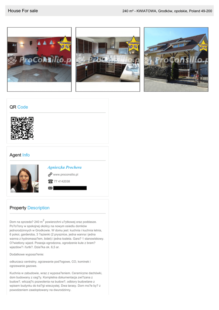 House For sale 240 m² - KWIATOWA, Grodków, opolskie, Poland 49-200 QR Code Agent Info Agnieszka Prochera www.proconsilio.pl 77 4142038 Property Description 2 Dom na sprzeda? 240 m powierzchni u?ytkowej oraz poddasze. Po?o?ony w spokojnej okolicy na nowym osiedlu domków jednorodzinnych w Grodkowie. W domu jest: kuchnia i kuchnia letnia, 6 pokoi, garderoba, 3 ?azienki (2 prysznice, jedna wanna i jedna wanna z hydromasa?em, bidet) i jedna toaleta. Gara? 1 stanowiskowy. O?wietlony wjazd. Posesja ogrodzona, ogrodzenie kute z bram? wjazdow? i furtk?. Dzia?ka ok. 6,5 ar. Dodatkowe wyposa?enie: odkurzacz centralny, ogrzewanie pod?ogowe, CO, kominek i ogrzewanie gazowe. Kuchnia w zabudowie, wraz z wyposa?eniem. Ceramiczne dachówki, dom budowany z ceg?y. Kompletna dokumentacja zwi?zana z budow?, wliczaj?c pozwolenia na budow?, odbiory budowlane z wpisem budynku do ksi?gi wieczystej. Dwa tarasy. Dom mo?e by? z powodzeniem zaadoptowany na dwurodzinny. Features CENA DO NEGOCJACJI !!! Jacuzzi Je?li potrzebujesz kredytu na zakup nieruchomo?ci umów si? z naszym doradc? kredytowym, który bezp?atnie zweryfikuje Twoj? zdolno?? kredytow?. Tel. 77 414 20 38. Uwaga: Informacje dotycz?ce opisu nieruchomo?ci podane s? przez w?a?ciciela, maj? charakter wy??cznie informacyjny i mog? podlega? aktualizacji. Oferta dotycz?ca nieruchomo?ci stanowi zaproszenie do rokowa? zgodnie z art. 71 Kodeksu Cywilnego i nie stanowi oferty okre?lonej w art. 66 i nast?pnych KC. Heating system Garden Balcony Basement Fence View Kitchen Fireplace Parking 1 Furnished Basic Details Appliances Property type : House Offer Type : For sale Offer ID : 1009 Price : 440,000 PLN View : Street Rooms : 6 Bathrooms : 3 Half bathrooms : 1 Usable area : 240 m² Year built : 2008 Fridge Kitchen Washing machine Oven Hot tub Address Map Country : Poland Province : opolskie Town : Grodków District : KWIATOWA Zip code : 49-200 Neighborhood City center 10 Minutes Police station 15 Minutes Train station 5 Minutes Bus stop 5 Minutes Park 10 Minutes School 5 Minutes