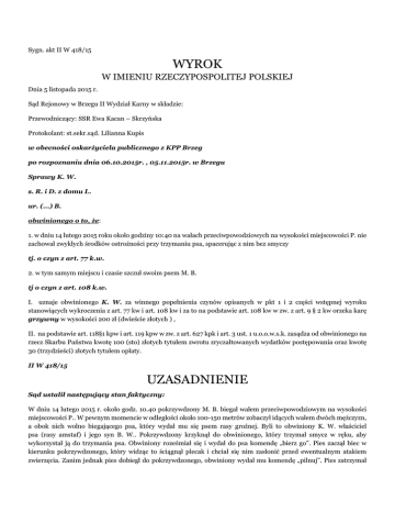 Sygn. akt II W 418/15 WYROK W IMIENIU RZECZYPOSPOLITEJ POLSKIEJ Dnia 5 listopada 2015 r. Sąd Rejonowy w Brzegu II Wydział Karny w składzie: Przewodniczący: SSR Ewa Kacan – Skrzyńska Protokolant: st.sekr.sąd. Lilianna Kupis w obecności oskarżyciela publicznego z KPP Brzeg po rozpoznaniu dnia 06.10.2015r. , 05.11.2015r. w Brzegu Sprawy K. W. s. R. i D. z domu L. ur. (...) B. obwinionego o to, że: 1. w dniu 14 lutego 2015 roku około godziny 10:40 na wałach przeciwpowodziowych na wysokości miejscowości P. nie zachował zwykłych środków ostrożności przy trzymaniu psa, spacerując z nim bez smyczy tj. o czyn z art. 77 k.w. 2. w tym samym miejscu i czasie szczuł swoim psem M. B. tj o czyn z art. 108 k.w. I. uznaje obwinionego K. W. za winnego popełnienia czynów opisanych w pkt 1 i 2 części wstępnej wyroku stanowiących wykroczenia z art. 77 kw i art. 108 kw i za to na podstawie art. 108 kw w zw. z art. 9 § 2 kw orzeka karę grzywny w wysokości 200 zł (dwieście złotych ) , II. na podstawie art. 118§1 kpw i art. 119 kpw w zw. z art. 627 kpk i art. 3 ust. 1 u.o.o.w.s.k. zasądza od obwinionego na rzecz Skarbu Państwa kwotę 100 (sto) złotych tytułem zwrotu zryczałtowanych wydatków postępowania oraz kwotę 30 (trzydzieści) złotych tytułem opłaty. II W 418/15 UZASADNIENIE Sąd ustalił następujący stan faktyczny: W dniu 14 lutego 2015 r. około godz. 10.40 pokrzywdzony M. B. biegał wałem przeciwpowodziowym na wysokości miejscowości P.. W pewnym momencie w odległości około 100-150 metrów zobaczył idących wałem dwóch mężczyzn, a obok nich wolno biegającego psa, który wydał mu się psem rasy groźnej. Byli to obwiniony K. W. właściciel psa (rasy amstaf) i jego syn B. W.. Pokrzywdzony krzyknął do obwinionego, który trzymał smycz w ręku, aby wykorzystał ją do trzymania psa. Obwiniony roześmiał się i wydał do psa komendę „bierz go”. Pies zaczął biec w kierunku pokrzywdzonego, który widząc to ściągnął plecak i chciał się nim zasłonić przed ewentualnym atakiem zwierzęcia. Zanim jednak pies dobiegł do pokrzywdzonego, obwiniony wydał mu komendę „pilnuj”. Pies zatrzymał się od pokrzywdzonego w odległości około 2m, ale dalej warczał i nie odstępował od niego. Pokrzywdzony wyciągnął wówczas telefon komórkowy i zawiadomił o sprawie policję. Obwiniony słysząc to zawołał psa i razem z synem oddalił się. Kiedy w chwilę później na miejsce zdarzenia przyjechali funkcjonariusze policji, obwinionego już w okolicy nie było. Dowód: -zeznania pokrzywdzonego– nagranie z dnia 5 listopada 2015 r. (k.62) oraz k.8 -częściowo wyjaśnienia obwinionego – nagranie z dnia 6 października 2015 r. (k.36) oraz k.14 -częściowo zeznania świadka B. W. – nagranie z dnia 5 listopada 2015 r. (k.62) -notatki urzędowe, k. 6, k.17 Obwiniony nie przyznał się do winy i wyjaśnił, że psa trzymał na smyczy i nie szczuł nim pokrzywdzonego. Podniósł, że to pokrzywdzony zachowywał się dziwnie, bo zdjął plecak i odgradzał się nim od psa, jakby się bał, albo chciał się z nim drażnić. Zachowywał się jak „pozorant”. Mówił do niego, że źle trafił , bo on jest policjantem i zadzwoni na policję. (wyjaśnienia obwinionego, k. 14, nagranie z dnia 6 października 2015 r. -k.36) K. W. ma wykształcenie średnie, z zawodu technik – rolnik, żonaty, ojciec dwójki dzieci, w tym jedno pełnoletnie, prowadzi własną działalność gospodarczą, z której miesięcznie otrzymuje dochód w wysokości ok. 5000 zł, właściciel mieszkania i samochodu łącznej wartości ok. 200-300 tyś zł., nie karany, nie leczony psychiatrycznie Dowód: -oświadczenie obwinionego na rozprawie w dniu 6 października 2015 r. Sąd zważył, co następuje: W świetle materiału dowodowego sprawy, wina i sprawstwo obwinionego K. W., w ocenie Sądu, nie budzi żadnych wątpliwości. Dokonując ustaleń faktycznych Sąd oparł się przede wszystkim na wiarygodnych zeznaniach pokrzywdzonego M. B., wspartych dołączonymi do sprawy notatkami urzędowymi z policyjnych czynności, które potwierdziły niezwłoczne dokonanie przez pokrzywdzonego zgłoszenia zdarzenia i podjęte w związku z nim czynności wyjaśniające. M. B. od samego początku stanowczo i konsekwentnie utrzymywał, iż obwiniony spacerował ze swoim psem bez smyczy, a następnie w odpowiedzi na prośbę, aby jednak wykorzystał smycz niesioną w ręku do trzymania psa, wydał psu komendę „bierz go”, która spowodowała, że pies zaczął szybko biec w kierunku pokrzywdzonego, a następnie komendę „pilnuj”, skutkiem której pies zatrzymał się w odległości około 2 m i groźnie warczał w kierunku pokrzywdzonego. Relacja pokrzywdzonego była logiczna i wewnętrznie spójna. Jego zachowanie, polegające na zasłanianiu się plecakiem i natychmiastowym wręcz wezwaniu policji, w pełni korespondowało z sytuacją i zdaniem Sądu stanowiło naturalną konsekwencję stanu zagrożenia, w którym się znalazł. Sam obwiniony twierdzi, że w ogóle nie zna pokrzywdzonego. Gdyby pokrzywdzony chciał jedynie zaszkodzić obwinionemu, to tą samą sytuację przedstawiłby w bardziej emocjonalny, a nawet drastyczny sposób. Tymczasem M. B. już w czasie pierwszego kontaktu z przybyłymi na miejsce zdarzenia funkcjonariuszami, a także w czasie pierwszego przesłuchania w postępowaniu wyjaśniającym spokojnie, krótko i treściwie przedstawił te same okoliczności zdarzenia, a na rozprawie przed sądem wskazał jeszcze, iż nie chodzi mu o jakiś konkretny wymiar kary dla obwinionego, ale o zmianę jego postępowania, które może kiedyś okazać się brzemienne w skutkach. Taka postawa pokrzywdzonego, która ujawniła się również w jego konsekwentnym postępowaniu w następnych dnia po zdarzeniu, kiedy w jednym z (...) lokali dostrzegł obwinionego i dopilnował, aby został on wylegitymowany przez policję wynika, zdaniem Sądu, z charakteru wykony