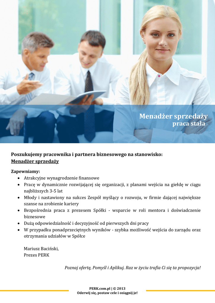 Menadżer sprzedaży praca stała Poszukujemy pracownika i partnera biznesowego na stanowisko: Menadżer sprzedaży Zapewniamy: Atrakcyjne wynagrodzenie finansowe Pracę w dynamicznie rozwijającej się organizacji, z planami wejścia na giełdę w ciągu najbliższych 3-5 lat Młody i nastawiony na sukces Zespół myślący o rozwoju, w firmie dającej największe szanse na zrobienie kariery Bezpośrednia praca z prezesem Spółki - wsparcie w roli mentora i doświadczenie biznesowe Dużą odpowiedzialność i decyzyjność od pierwszych dni pracy W przypadku ponadprzeciętnych wyników - szybka możliwość wejścia do zarządu oraz otrzymania udziałów w Spółce Mariusz Baciński, Prezes PERK Poznaj ofertę, Pomyśl i Aplikuj. Raz w życiu trafia Ci się ta propozycja! PERK.com.pl | © 2013 Oderwij się, postaw cele i osiągnij je! Szczegóły oferty: Menadżer sprzedaży Zadania: Tworzenie, monitorowanie i realizacja strategii oraz planów sprzedażowych Realizacja celów sprzedażowych Stały kontakt z klientami oraz tworzenie i budowanie listy osób zainteresowanych produktami PERK Przygotowywanie ofert sprzedażowych Wybór i rekomendacja kanałów promocji Tworzenie oraz prowadzenie i nadzorowanie kampanii promocyjnych Dystrybucja informacji o usługach za pomocą ustalonych kanałów promocji Rozwój kanału sprzedaży korporacyjnej oraz sprzedaży on-line Po poznaniu organizacji i pracy, budowanie własnego zespołu sprzedażowego Wymagania: Wykształcenie minimum wyższe licencjackie Doświadczenie w sprzedaży minimum 2 lata i przede wszystkim wysokie umiejętności analizy potrzeb klienta, perswazji oraz osiągania stawianych celów Swoboda nawiązywania kontaktów i reprezentatywność Umiejętność zarządzania swoim czasem, samodzielność i stanowczość Bardzo dobra znajomość: produktów PERK, języka angielskiego, narzędzi Microsoft Office i nowych trendów w biznesie internetowym Lojalność i chęć wypracowania własnego sukcesu w biznesie Miejsce pracy: Warszawa (praca w biurze) Czas pracy: 50-60 godzin tygodniowo Forma zatrudnienia: Okres próbny – umowa zlecenie, następnie umowa o pracę. Wynagrodzenie: podstawowe + zależne od wyników. Obecnie, ok. 3000-7000 zł brutto łącznie (na miesiąc) z perspektywą dużych wzrostów. W przypadku ponadprzeciętnych wyników, przewidziane jest powołanie po okresie minimum 12 miesięcy na stanowisko członka zarządu oraz, po upływie pół roku, przekazanie udziałów w Spółce. Metoda rekrutacji: Aplikacje prosimy przesyłać do 1 lipca, na adres: [email protected] (wraz ze zgodą na przetwarzanie danych w celach rekrutacji*). Tytuł maila: Sales manager Aplikacja powinna zawierać: CV (max. 2str. a4, ang.) oraz list motywacyjny w jęz. angielskim na max. 2000 znaków (ze spacjami) odpowiadający na pytania: Dlaczego chcesz przez najbliższe „n” lat pracować w PERK, co w tym czasie wniesiesz do naszej organizacji oraz jak bardzo chcesz osiągnąć Twój sukces. W dniach, 1-7 lipca należy rozwiązać test na naszej platformie on-line (stosowny link zostanie przesłany po pozytywnej weryfikacji aplikacji) Pierwsza selekcja prowadzona jest na podstawie screeningu CV, listów motywacyjnych oraz testów online. Ostatnim etapem rekrutacji jest interview, które odbywa się bezpośrednio z prezesem Spółki. Kontakt: [email protected] * „Wyrażam zgodę na przetwarzanie moich danych osobowych dla potrzeb kolejnych rekrutacji przeprowadzanych przez PERK zgodnie z Ustawą z dn. 29.08.1997 roku o ochronie danych osobowych (Dz.U. z 2002 r. nr 101, poz.926, ze zm)” PERK.com.pl | © 2013 Oderwij się, postaw cele i osiągnij je!
