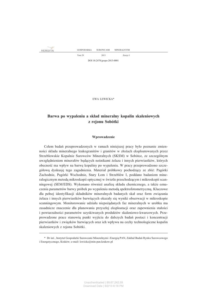 GOSPODARKA Tom 29 SUROWCAMI MINERALNYMI 2013 Zeszyt 1 DOI 10.2478/gospo-2013-0001 EWA LEWICKA* Barwa po wypaleniu a sk³ad mineralny kopalin skaleniowych z rejonu Sobótki Wprowadzenie Celem badañ przeprowadzonych w ramach niniejszej pracy by³o poznanie zmiennoœci sk³adu mineralnego leukogranitów i granitów w z³o¿ach eksploatowanych przez Strzeblowskie Kopalnie Surowców Mineralnych (SKSM) w Sobótce, ze szczególnym uwzglêdnieniem minera³ów bêd¹cych noœnikami ¿elaza i innych pierwiastków, których obecnoœæ ma wp³yw na barwê kopaliny po wypaleniu. W pracy przeprowadzono szczegó³ow¹ dyskusjê tego zagadnienia. Materia³ próbkowy pochodz¹cy ze z³ó¿: Pagórki Zachodnie, Pagórki Wschodnie, Stary £om i Strzeblów I, poddano badaniom mineralogicznym metod¹ mikroskopii optycznej w œwietle przechodz¹cym i mikroskopii scanningowej (SEM/EDS). Wykonano równie¿ analizê sk³adu chemicznego, a tak¿e oznaczenia parametrów barwy próbek po wypaleniu metod¹ spektrofotometryczn¹. Kluczowe dla pe³nej identyfikacji sk³adników mineralnych badanych ska³ oraz form zwi¹zania ¿elaza i innych pierwiastków barwi¹cych okaza³y siê wyniki obserwacji w mikroskopie scanningowym. Monitorowanie udzia³u niepo¿¹danych faz mineralnych w urobku ma zasadnicze znaczenie dla planowania przysz³ej eksploatacji oraz zapewnienia sta³oœci i powtarzalnoœci parametrów uzyskiwanych produktów skaleniowo-kwarcowych. Przeprowadzone prace stanowi¹ punkt wyjœcia do dalszych badañ postaci i koncentracji pierwiastków i zwi¹zków barwi¹cych oraz ich wp³ywu na cechy technologiczne kopalin skaleniowych z rejonu Sobótki. * Dr in¿., Instytut Gospodarki Surowcami Mineralnymi i Energi¹ PAN, Zak³ad Badañ Rynku Surowcowego i Energetycznego, Kraków; e-mail: [email protected] Unauthenticated | 89.67.242.59 Download Date | 6/2/13 6:18 PM 36 1. Obserwacje makro- i mikroskopowe w œwietle przechodz¹cym Ska³y wystêpuj¹ce w miejscach opróbowania to g³ównie leukogranity œrednioziarniste, barwy jasnoszarej, kremowej lub ¿ó³tawej, czêsto o teksturze kierunkowej. Na powierzchniach ich spêkañ spotyka siê rudo-brunatne naloty zwi¹zków ¿elaza, które niekiedy wnikaj¹ w ska³ê. W niektórych partiach z³ó¿, zw³aszcza w kamienio³omie Strzeblów I, wystêpuj¹ granity o teksturze bez³adnej lub kierunkowej. W luŸnych blokach znajduj¹cych siê w obrêbie wyrobisk obserwowano odmiany granitu o teksturze kierunkowej, przypominaj¹ce gnejs, a tak¿e ¿y³y aplitowe, niewielkie cia³a pegmatytowe i cienkie ¿y³y kwarcowe. W obrazie mikroskopowym jako g³ówne sk³adniki mineralne badanych ska³ rozpoznano: kwarc, plagioklazy i skaleñ potasowy (g³ównie mikroklin), obecne w ró¿nych i zmiennych proporcjach. Podrzêdnie wystêpuj¹: biotyt, chloryt, muskowit, serycyt, sporadycznie – granat, rutyl (przypuszczalnie pobiotytowy), apatyt, cyrkon, epidot i minera³y nieprzezroczyste, w tym piryt. Kwarc prawie zawsze wygasza œwiat³o faliœcie, czasem mozaikowo, co œwiadczy o silnej deformacji w stadium pomagmowym. Tworzy on zarówno du¿e, jak i drobne ziarna. Plagioklazy s¹ liczne, zwykle zbliŸniaczone polisyntetycznie wed³ug prawa albitowego; niekiedy wykazuj¹ budowê pasow¹ (rys. 1). Powszechnie, choæ niezbyt intensywnie, ulegaj¹ serycytyzacji lub kaolinityzacji. Partie zserycytyzowane lub – co obserwuje siê czêœciej – przeobra¿one w kierunku minera³ów ilastych wystêpuj¹ zazwyczaj w centrach ziaren, niekiedy uk³adaj¹ siê strefowo, podkreœlaj¹c budowê pasow¹. Pr¹¿ki zbliŸniaczeñ s¹ zwykle cienkie, czêsto przesuniête wzd³u¿ p³aszczyzn spêkañ w wyniku silnych naprê¿eñ dynamicznych (kataklazy). Najwiêksze ziarna tworzy skaleñ potasowy. S¹ one zwykle ksenomorficzne, zbliŸniaczone polisyntetycznie wed³ug prawa peryklinowego i albitowego Rys. 1. Leukogranit ze z³o¿a Strzeblów I. Plagioklaz o budowie pasowej, przeobra¿ony strefowo w kierunku kaolinitu, z ¿y³k¹ epidotow¹ (e). PX Fig. 1. Leucogranite from Strzeblów I deposit. Plagioclase of zonal structure, transformed into kaolinite, with epidote vein (e). Crossed polars Unauthenticated | 89.67.242.59 Download Date | 6/2/13 6:18 PM 37 (co jest typowe dla mikroklinu, rys. 2), z licznymi przerostami pertytowymi o ró¿nym wieku i genezie (rys. 3). Czêœæ z nich ma charakter pierwotny/z odmieszania (drobne, regularne wrostki fazy sodowej w skaleniu potasowym), czêœæ jest wtórna/infiltracyjna (nieregularne, czêsto rozga³êziaj¹ce siê ¿y³ki), co mo¿na wi¹zaæ z metasomatoz¹ alkaliczn¹ (albityzacj¹ skalenia potasowego). Biotyt jest na ogó³ silnie zmieniony, odbarwiony, a produktem jego Rys. 2. Leukogranit ze z³o¿a Pagórki Wschodnie. W centrum – mikroklin zbliŸniaczony polisyntetycznie, po prawej – plagioklaz zbliŸniaczony wed³ug prawa albitowego, po lewej – spêkany kwarc. PX Fig. 2. Leucogranite from Pagórki Wschodnie deposit. Microcline with polysynthetic twinning (centre), plagioclase twinned acc. to albite law (right), and cracked grain of quartz (left). Crossed polars Rys. 3. Leukogranit ze z³o¿a Pagórki Zachodnie. Mikropertyty o ró¿nej genezie (pierwotne i wtórne) w otoczeniu zsercytyzowanych plagioklazów (po prawej) i kwarcu (po lewej). PX Fig. 3. Leucogranite from Pagórki Zachodnie deposit. Microperthites of various origin (primary and secondary) surrounded by sericitized plagioclase (on the right) and quartz (on the left). Crossed polars Unauthenticated | 89.67.242.59 Download Date | 6/2/13 6:18 PM 38 przeobra¿enia (prawdopodobnie pod wp³ywem gor¹cych roztworów hydrotermalnych) jest zwykle chloryt, niekiedy z wydzielonym wtórnym rutylem, którego igie³ki uk³adaj¹ siê w tzw. siatkê sagenitow¹, oraz z grudkami minera³ów nieprzezroczystych (por.: Stoch 1974; Borkowska, Smulikowski 1973). W strefach, w których leukogranit przechodzi w granit, biotyt obserwowany jest znacznie czêœciej, ma barwê ciemnobrunatn¹ lub oliwkow¹