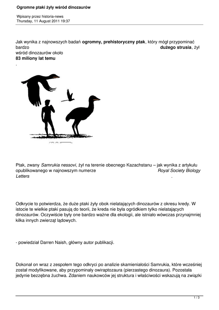 Ogromne ptaki żyły wśród dinozaurów Wpisany przez historia-news Thursday, 11 August 2011 19:37 Jak wynika z najnowszych badań ogromny, prehistoryczny ptak, który mógł przypominać bardzo dużego strusia, żył wśród dinozaurów około 83 miliony lat temu . Ptak, zwany Samrukia nessovi, żył na terenie obecnego Kazachstanu – jak wynika z artykułu opublikowanego w najnowszym numerze Royal Society Biology Letters . Odkrycie to potwierdza, że duże ptaki żyły obok nielatających dinozaurów z okresu kredy. W istocie te wielkie ptaki pasują do teorii, że kreda nie była ogródkiem tylko nielatających dinozaurów. Oczywiście były one bardzo ważne dla ekologii, ale istniało wówczas przynajmniej kilka innych zwierząt lądowych. - powiedział Darren Naish, główny autor publikacji. Dokonał on wraz z zespołem tego odkryci po analizie skamieniałości Samrukia, które wcześniej został modyfikowane, aby przypominały owiraptozaura (pierzastego dinozaura). Pozostała jedynie bezzębna żuchwa. Zdaniem naukowców jej struktura i właściwości wskazują na związki 1/3 Ogromne ptaki żyły wśród dinozaurów Wpisany przez historia-news Thursday, 11 August 2011 19:37 z ptakami a nie nielatającymi dinozaurami. Ich zdaniem czaszka ptaków osiągała za życia ponad 30 centymetrów. Gdyby nie latał, byłby wysoki na 3 metry, a gdyby latał, rozpiętość jego skrzydeł sięgałaby 4 metrów. Wielki ptak jest drugim znanym dużym ptakiem z epoki dinozaurów. Pierwszy był Gargantuavis philoinos , który żył w południowej Francji około 70 milionów lat temu. On też prawdopodobnie był nielotem. Teraz możemy być pewni, że w mezozoiku ptaki lądowe nie były zwierzętami wielkości kury. Duży rozmiar ewidentnie pojawił się u tych zwierząt i to w dwóch różnych regionach. To pasuje to większego obrazu, że w mezozoiku ptaki były ekologicznie zróżnicowane. - dodaje Darren Naish. Obecnie wciąż nie jest wiadome, na co wielkie ptaki polowały. Nie znaleziono śladów specjalizacji pokarmowej, dlatego podejrzewa się, że ich dieta była dość ogólna, jak u wielu współczesnych ptaków. Większość czasu spędzały jednak uciekając przed mięsożernymi dinozaurami z danego regionu. Paleontolodzy muszą teraz odłączyć ptaki od dinozaurów nie-ptaków. W tym przypadku skamieniałość przypisana dinozaurowi okazała się być ptakiem. Niedawno ujawniono, że najst arszy znany ptak był jednak dinozaurem . My, naukowcy używamy uciążliwego i na pozór pedantycznego terminu „nielatające dinozaury”, ale 150 milionów lat wstecz te grupy były bardzo podobne. Wszystkie były swego rodzaju pierzastymi dino-ptakami. - uważa Laurence Witmer, profesor anatomii i paleontologii na Uniwersytecie w Ohio. 2/3 Ogromne ptaki żyły wśród dinozaurów Wpisany przez historia-news Thursday, 11 August 2011 19:37 Zdaniem Naisha nowe odkrycie wskazuje, że współczesne ptaki nie różnią się tak bardzo od wymarłych mezozoicznych ptaków, jak ludzie sądzą. Czytaj artykuł źródłowy 3/3