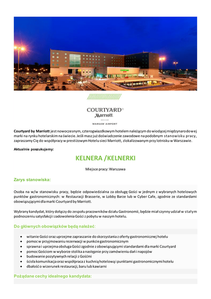 Courtyard by Marriott jest nowoczesnym, czterogwiazdkowym hotelem należącym do wiodącej międzynarodowej marki na rynku hotelarskim na świecie. Jeśli masz już doświadczenie zawodowe na podobnym stanowisku pracy, zapraszamy Cię do współpracy w prestiżowym Hotelu sieci Marriott, zlokalizowanym przy lotnisku w Warszawie. Aktualnie poszukujemy: KELNERA /KELNERKI Miejsce pracy: Warszawa Zarys stanowiska: Osoba na w/w stanowisku pracy, będzie odpowiedzialna za obsługę Gości w jednym z wybranych hotelowych punktów gastronomicznych: w Restauracji Brasserie, w Lobby Barze lub w Cyber Cafe, zgodnie ze standardami obowiązującymi dla marki Courtyard by Marriott. Wybrany kandydat, który dołączy do zespołu pracowników działu Gastronomii, będzie miał czynny udział w stałym podnoszeniu satysfakcji i zadowolenia Gości z pobytu w naszym hotelu. Do głównych obowiązków będą należeć: witanie Gości oraz uprzejme zapraszanie do skorzystania z oferty gastronomicznej hotelu pomoc w przyjmowaniu rezerwacji w punkcie gastronomicznym sprawna i uprzejma obsługa Gości zgodnie z obowiązującymi standardami dla marki Courtyard pomoc Gościom w wyborze stolika a następnie przy zamówieniu dań i napojów budowanie pozytywnych relacji z Gośćmi ścisła komunikacja oraz współpraca z kuchnią hotelową i punktami gastronomicznymi hotelu dbałość o wizerunek restauracji, baru lub kawiarni Pożądane cechy idealnego kandydata: miła aparycja i wysoka kultura osobista umiejętność pracy w zespole komunikatywność łatwość nawiązywania kontaktów pozytywne nastawienie i poczucie humoru Wymagania: minimum 1 rok doświadczenia zawodowego na podobnym stanowisku pracy bardzo dobra znajomość języka polskiego komunikatywna znajomość języka angielskiego, znajomość innych języków obcych mile widziana gotowość do pracy w systemie zmianowym, w tym w godzinach nocnych wymagana książeczka do celów sanitarno-epidemiologicznych Oferujemy: pracę w 4* hotelu marki Courtyard, należącej do międzynarodowej sieci Marriott International zatrudnienie na podstawie umowy o pracę / stałe wynagrodzenie zasadnicze uczestnictwo w hotelowym planie premiowym szkolenia w zakresie powierzonego stanowiska pracy oraz inne szkolenia zapewniane przez Pracodawcę i sieć Marriott Int. możliwość korzystania z pakietu świadczeń socjalnych i motywacyjnych (uczestnictwo w programie MultiSport, możliwość korzystania z ubezpieczenia grupowego dla pracownika oraz członków rodziny, w tym ubezpieczenie na życie opłacane przez Pracodawcę, pakiety świadczeń medycznych w konkurencyjnych cenach, dofinansowanie w ramach ZFŚS, dofinansowanie posiłków na stołówce pracowniczej) udział w programach pracowniczych realizowanych w ramach sieci Marriott International możliwość rozwoju zawodowego pracę w stabilnej i prestiżowej firmie pracę opartą na wzajemnym szacunku i miłej atmosferze Osoby zainteresowane prosimy o przesyłanie CV, listu motywacyjnego na adres email: [email protected] lub faxem: 48 22 650 06 90. W tytule maila prosimy o wpisanie nazwy stanowiska, na które została wysłana aplikacja. Prosimy o dopisanie klauzuli: "Wyrażam zgodę na przetwarzanie moich danych osobowych zawartych w mojej ofercie pracy dla potrzeb niezbędnych do realizacji procesu rekrutacji prowadzanego przez firmę Chopin Ai rport Development sp. z o.o. z siedzibą w Warszawie przy ul. Żwirki i Wigury 1 (zgodnie z Ustawą z dnia 29.08.1997 o ochronie danych osobowych, Dz.U. z 2002 r., nr 101 poz. 926, ze zm.) Podanie danych jest dobrowolne. Oświadczam, że zostałem/am poinformowany/na o prawie dostępu do moich danych osobowych, ich poprawiania i aktualizowania."