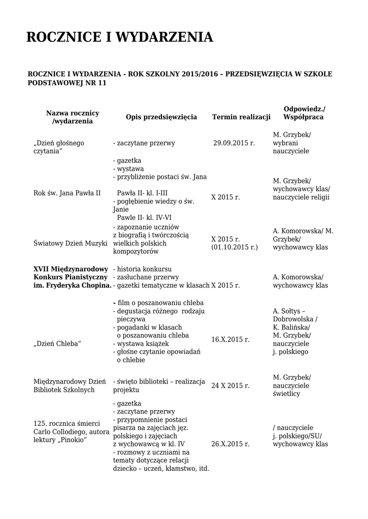 ROCZNICE I WYDARZENIA ROCZNICE I WYDARZENIA - ROK SZKOLNY 2015/2016 – PRZEDSIĘWZIĘCIA W SZKOLE PODSTAWOWEJ NR 11 Nazwa rocznicy /wydarzenia „Dzień głośnego czytania” Opis przedsięwzięcia - zaczytane przerwy Termin realizacji 29.09.2015 r. - gazetka - wystawa - przybliżenie postaci św. Jana Rok św. Jana Pawła II Pawła II- kl. I-III - pogłębienie wiedzy o św. Janie Pawle II- kl. IV-VI - zapoznanie uczniów z biografią i twórczością Światowy Dzień Muzyki wielkich polskich kompozytorów Międzynarodowy Dzień Bibliotek Szkolnych M. Grzybek/ wybrani nauczyciele X 2015 r. M. Grzybek/ wychowawcy klas/ nauczyciele religii X 2015 r. (01.10.2015 r.) A. Komorowska/ M. Grzybek/ wychowawcy klas XVII Międzynarodowy - historia konkursu Konkurs Pianistyczny - zasłuchane przerwy im. Fryderyka Chopina. - gazetki tematyczne w klasach X 2015 r. „Dzień Chleba” Odpowiedz./ Współpraca A. Komorowska/ wychowawcy klas - film o poszanowaniu chleba - degustacja różnego rodzaju pieczywa - pogadanki w klasach o poszanowaniu chleba 16.X.2015 r. - wystawa książek - głośne czytanie opowiadań o chlebie A. Sołtys – Dobrowolska / K. Balińska/ M. Grzybek/ nauczyciele j. polskiego - święto biblioteki – realizacja 24 X 2015 r. projektu M. Grzybek/ nauczyciele świetlicy - gazetka - zaczytane przerwy - przypomnienie postaci 125. rocznica śmierci pisarza na zajęciach jęz. Carlo Collodiego, autora polskiego i zajęciach lektury „Pinokio” z wychowawcą w kl. IV 26.X.2015 r. - rozmowy z uczniami na tematy dotyczące relacji dziecko – uczeń, kłamstwo, itd. / nauczyciele j. polskiego/SU/ wychowawcy klas Nazwa rocznicy /wydarzenia Opis przedsięwzięcia - przebranie za ulubioną „Światowy dzień postaci postać bajkową bajek” - zaczytane przerwy 11 listopada – 98. rocznica Odzyskania Niepodległości 165. rocznica urodzin Roberta Louisa Stevensona 5.XI.2015 r. M. Grzybek/ nauczyciele świetlicy / wychowawcy klas/ nauczyciele j. polskiego/SU nauczyciele j. polskiego/ M. Danielak /SU - zaczytane przerwy – „Wyspa skarbów - zapoznanie uczniów z biografią i twórczością pisarza M. Grzybek/ nauczyciele świetlicy/ wychowawcy klas/ nauczyciele j. polskiego - konkurs „Miś maksymalny” - XI 2015 r. XI 2015 r. XI 2015 r. 180. rocznica urodzin oraz 105. rocznica śmierci Marka Twaina - zaczytane przerwy - czytanie książki „Przygody Tomka XI 2015 r. Sawyera” - gazetki tematyczne - konkursy Światowy Dzień - zajęcia tematyczne na 21 XI 2015 r. Życzliwości zajęciach z wychowawcą - gazetki tematyczne MIĘDZYNARODOWY w klasach DZIEŃOSÓB XII 2015 r. - zajęcia z wychowawcą oraz NIEPEŁNOSPRAWNYCH religii- tolerancja 60. rocznica urodzin Joanny Olech Odpowiedz./ Współpraca - apel - udział pocztu sztandarowego w lokalnych uroczystościach - konkurs multimedialny na wykonanie prezentacji dotyczącej XI 2015 r. I wojny światowej i Legionów Polski - gazetka tematyczna 185. rocznica (w nocy z 29 na 30 listopada 1830 r. w Warszawie) rozpoczęcia powstania - gazetki tematyczne listopadowego - zrywu - rys historyczny niepodległościowego skierowanego przeciwko rosyjskiemu zaborcy. Światowy Dzień Pluszowego Misia Termin realizacji - gazetka tematyczna - zaczytane przerwy- głośne czytanie książki „Dynastia Miziołków” XII 2015 r. M. Danielak/ wychowawcy klas M. Grzybek/ wychowawcy świetlicy/SU M. Grzybek/ wychowawcy świetlicy/ nauczyciele j. polskiego/SU SU/M. Grzybek/ wychowawcy świetlicy Wychowawcy klas/ PCK/ nauczyciele religii M. Grzybek/ wychowawcy świetlicy/ nauczyciele j. polskiego/SU Nazwa rocznicy /wydarzenia 140. rocznica urodzin Hugh Jones'a Liftinga Opis przedsięwzięcia - - gazetka tematyczna - zaczytane przerwy Termin realizacji I 2016 r. - gazetka 100. rocznica urodzin - zaczytane przerwy- głośne Seweryny Szmaglewskiej II 2016 r. czytanie książki „Czarne stopy” 10. rocznica śmierci Stanisława Lema 260. rocznica urodzin W. A. Mozarta 70. rocznica urodzin Macieja Wojtyszki 1050. rocznica Chrztu Polski 170. rocznica urodzin Henryka Sienkiewicza - Międzynarodowe Święto Pracy - Dzień Flagi - Święto Konstytucji 3 Maja 70. rocznica kapitulacji III Rzeszy i koniec II WŚ - komunizm w Polsce - gazetka - zaczytane przerwy- głośne czytanie książki „Bajki robotów” - gazetka - zasłuchana przerwa - przybliżenie postaci kompozytora na zajęciach muzyki III 2016 r. III 2016 r. - gazetka - zaczytane przerwy- głośne IV 2016 r. czytanie książki „Bromba i inni” - gazetka - przybliżenie wydarzeń na zajęciach z historii - pokazanie aspektu wiary w IV 2016 r. wydarzeniu historycznym na lekcjach religii - gazetka - zaczytane przerwy- głośne czytanie książki „Janko Muzykant”, „Latarnik” - akademia - konkurs tematyczny o życiu i V- VI 2016 r. fragmentach twórczości pisarza - gazetka tematyczna - rys historyczny - udział w lokalnych uroczystościach V 2016 r. Odpowiedz./ Współpraca M. Grzybek/ wychowawcy świetlicy/ nauczyciele j. polskiego/SU M. Grzybek/ wychowawcy świetlicy/ nauczyciele j. polskiego/SU M. Grzybek/ wychowawcy świetlicy/ nauczyciele j. polskiego/SU A. Komorowska M. Grzybek/ wychowawcy świetlicy/ nauczyciele j. polskiego/SU M. Danielak/ wychowawcy klas/ nauczyciele religii opiekunowie zajęć pozalekcyjnych/ SU M. Danielak/ wychowawcy klas/ M. Grzybek Nazwa rocznicy /wydarzenia 175. rocznica urodzin Elizy Orzeszkowej Opis przedsięwzięcia - gazetka tematyczna - zaczytane przerwy- głośne czytanie książki „A...B...C”, „Dobra Pani” Opracowanie: Anna Dajcz, Małgorzata Grzybek Termin realizacji VI 2016 r. Odpowiedz./ Współpraca M. Grzybek/ wychowawcy świetlicy/ nauczyciele j. polskiego/SU zatwierdziła: Teresa Marczak