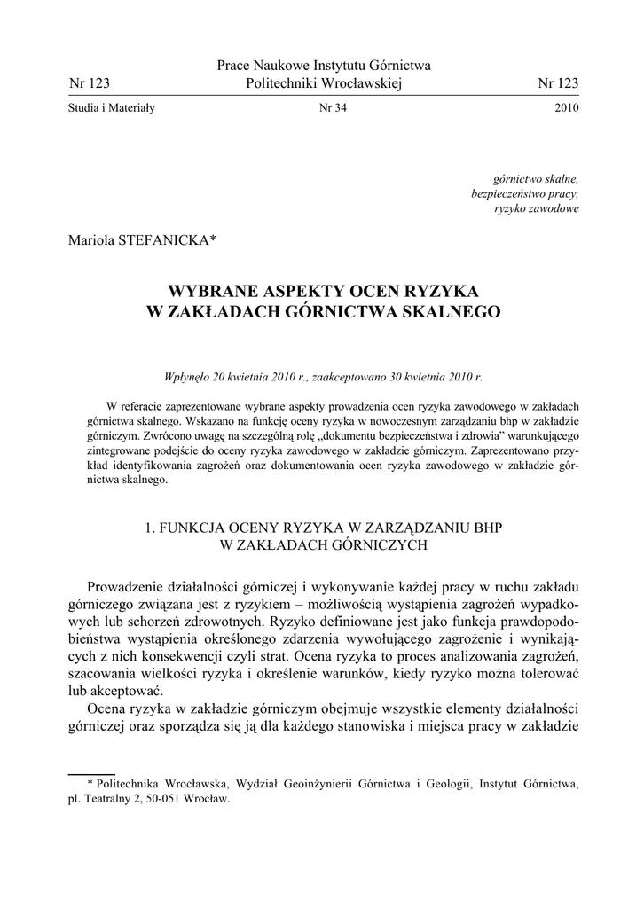 Prace Naukowe Instytutu Górnictwa Politechniki Wrocławskiej Nr 123 Studia i Materiały Nr 123 Nr 34 2010 górnictwo skalne, bezpieczeństwo pracy, ryzyko zawodowe Mariola STEFANICKA* WYBRANE ASPEKTY OCEN RYZYKA W ZAKŁADACH GÓRNICTWA SKALNEGO Wpłynęło 20 kwietnia 2010 r., zaakceptowano 30 kwietnia 2010 r. W referacie zaprezentowane wybrane aspekty prowadzenia ocen ryzyka zawodowego w zakładach górnictwa skalnego. Wskazano na funkcję oceny ryzyka w nowoczesnym zarządzaniu bhp w zakładzie górniczym. Zwrócono uwagę na szczególną rolę „dokumentu bezpieczeństwa i zdrowia” warunkującego zintegrowane podejście do oceny ryzyka zawodowego w zakładzie górniczym. Zaprezentowano przykład identyfikowania zagrożeń oraz dokumentowania ocen ryzyka zawodowego w zakładzie górnictwa skalnego. 1. FUNKCJA OCENY RYZYKA W ZARZĄDZANIU BHP W ZAKŁADACH GÓRNICZYCH Prowadzenie działalności górniczej i wykonywanie każdej pracy w ruchu zakładu górniczego związana jest z ryzykiem – możliwością wystąpienia zagrożeń wypadkowych lub schorzeń zdrowotnych. Ryzyko definiowane jest jako funkcja prawdopodobieństwa wystąpienia określonego zdarzenia wywołującego zagrożenie i wynikających z nich konsekwencji czyli strat. Ocena ryzyka to proces analizowania zagrożeń, szacowania wielkości ryzyka i określenie warunków, kiedy ryzyko można tolerować lub akceptować. Ocena ryzyka w zakładzie górniczym obejmuje wszystkie elementy działalności górniczej oraz sporządza się ją dla każdego stanowiska i miejsca pracy w zakładzie * Politechnika Wrocławska, Wydział Geoinżynierii Górnictwa i Geologii, Instytut Górnictwa, pl. Teatralny 2, 50-051 Wrocław. 150 M. STEFANICKA górniczym. Podjęcie każdej decyzji dopuszczeniowej w ruchu zakładu górniczego oznacza, że została dokonana ocena ryzyka, zagrożenia zostały zidentyfikowane, a ustalone środki zapobiegawcze są dostateczne, aby uznać ryzyko za akceptowalne. Obowiązek prowadzenia oceny ryzyka to nie tylko nowa filozofia podejścia do bhp, ale również nowy sposób na podejmowanie decyzji – przed ich podjęciem zobowiązani jesteśmy wymiernie oszacować poziom bezpieczeństwa, co w konsekwencji ma spowodować, że obszar bhp jest zarządzany w oparciu o przesłanki racjonalności i optymalności, a podejmowanie wszelkich działań jest wynikiem świadomej kalkulacji, w myśl zasady możemy zarządzać jeżeli potrafimy mierzyć w sposób obiektywny efekty działań. Kwestią istotną w podejmowaniu decyzji jest ustalenie minimalnych kryteriów akceptowalności ryzyka. Uznaje się, że ryzyko można zaakceptować, czyli dopuścić do prowadzenia ruchu, eksploatacji, działań i pracy na stanowisku, jeżeli w wyniku oceny można stwierdzić: • spełnione są wymagania obowiązujących przepisów, norm oraz uregulowań wewnętrznych, • zasady ograniczania ryzyka są właściwie stosowane, a ustalając środki zapobiegawcze uwzględniono dostępne osiągnięcia techniki oraz zapewniono odpowiednie środki ochrony zbiorowej i indywidualnej. Ustalenie wyższych progów akceptowalności ryzyka zawodowego jest kwestią przyjętej przez przedsiębiorcę strategii bhp w zakładzie górniczym, często są to już standardy korporacyjne właścicieli przedsiębiorstwa górniczego. Stosowane podstawowe środki służące utrzymywaniu ryzyka akceptowanego na poziomie kontrolowanym w zakładzie górniczym, wynikają bezpośrednio z przepisów i powinny polegać na: • monitorowaniu zagrożeń – utrzymywaniu systemu kontroli, badań, pomiarów, analiz i przeglądów, • przestrzeganiu stosowania ustalonych środków ochrony technicznej, zespołowej i indywidualnej, • przestrzeganiu obowiązujących procedur i instrukcji, • stosowaniu urządzeń ostrzegawczych i alarmowych, znaków i barw bezpieczeństwa, • prowadzenie szkoleń i instruktaży bhp, • prowadzeniu profilaktycznych badań lekarskich, • weryfikacji zatrudnianych osób (również podmiotów obcych) w zakresie posiadanych uprawnień, kwalifikacji, umiejętności, • przestrzeganiu procedur dopuszczania do ruchu – maszyn, urządzeń i obiektów, • prowadzeniu badań czynników szkodliwych dla zdrowia i innych pomiarów profilaktycznych. Wybrane aspekty ocen ryzyka w zakładach górnictwa skalnego 151 Sposób ich realizacji i skuteczność w dużej mierze zależy od wdrożonego systemu zarządzania bhp w zakładzie górniczym. Podsumowując, należy stwierdzić, że to organizacja – przedsiębiorca górniczy decyduje o poziomie „bezpieczeństwa” zakładu górniczego, poprzez przyjęcie poziomu akceptowalności ryzyka oraz sposobie wdrożenia systemu zarządzania bhp. 2. IDENTYFIKACJA ZAGROŻEŃ W ZAKŁADZIE GÓRNICZYM NA POTRZEBY OCENY RYZYKA ZAWODOWEGO Zagrożenie jest definiowane jako stan środowiska pracy mogący spowodować wypadek lub chorobę. Identyfikacja zagrożeń to proces rozpoznawania tego, czy zagrożenie istnieje, oraz opis jego charakterystyk. Oszacowanie ryzyka musi być poprzedzone rzetelną i profesjonalną identyfikacją zagrożeń w układzie: czynnik zagrażający, sytuacje i okoliczności wyzwalające określony czynnik oraz możliwe skutki tych zdarzeń, pamiętając, że oceniane ryzyko jest funkcją częstości wystąpienia zdarzenia zagrażającego i wielkości strat. W warunkach zakładu górniczego podczas prowadzenia analiz zagrożeń ważne jest zwrócenie uwagi na specyfikę uwarunkowań prawnych, technicznych i organizacyjnych oraz wynikających z nich wskazań i zasad, które powinny być przestrzegane w procesie oceny ryzyka zawodowego na etapie identyfikacji zagrożeń, oto niektóre z nich: 1. W procesie identyfikacji zagrożeń powinny, a nawet muszą uczestniczyć osoby kierownictwa i dozoru oraz pracownicy zatrudnieni w ruchu zakładu górniczego. Osoby kierownictwa i dozoru z racji swoich funkcji zobowiązane są do rozpoznawania, monitorowania, analizowania zagrożeń i są najbardziej komp