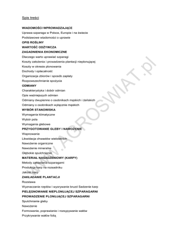 Spis treści WIADOMOŚCI WPROWADZAJĄCE Uprawa szparaga w Polsce, Europie i na świecie Podstawowe wiadomości o uprawie OPIS ROŚLINY WARTOŚĆ ODśYWCZA ZAGADNIENIA EKONOMICZNE Dlaczego warto uprawiać szparagi Koszty załoŜenia i prowadzenia plantacji nieplonującej Koszty w okresie plonowania Dochody i opłacalność Organizacja zbiorów i sposób zapłaty Rozpowszechnianie spoŜycia ODMIANY Charakterystyka i dobór odmian Opis waŜniejszych odmian Odmiany dwupienne o osobnikach męskich i Ŝeńskich Odmiany o osobnikach wyłącznie męskich WYBÓR STANOWISKA Wymagania klimatyczne Wybór pola Wymagania glebowe PRZYGOTOWANIE GLEBY l NAWOśENIE Wapnowanie Likwidacja chwastów wieloletnich NawoŜenie organiczne NawoŜenie mineralne Głębokie spulchnianie MATERIAŁ NASADZENIOWY (KARPY) Metody zakładania szparagami Produkcja karp na rozsadniku Jakość karp ZAKŁADANIE PLANTACJI Rozstawa Wyznaczanie rzędów i wyorywanie bruzd Sadzenie karp PIELĘGNOWANIE NIEPLONUJĄCEJ SZPARAGARNI PROWADZENIE PLONUJĄCEJ SZPARAGARNI Spulchnianie gleby NawoŜenie Formowanie, poprawianie i rozsypywanie wałów Przykrywanie wałów folią Nawadnianie szparagami Likwidacja pędów ZWALCZANIE CHWASTÓW Plantacja nieplonująca Plantacja plonująca Polecane herbicydy Zwalczanie najbardziej uciąŜliwych chwastów ZWALCZANIE CHORÓB l SZKODNIKÓW Choroby Szkodniki Technika ochrony roślin ZBIÓR SZPARAGA Termin zbioru Technika zbioru POSTĘPOWANIE PO ZBIORZE l PRZYGOTOWANIE DO SPRZEDAśY Zmiany fizjologiczne po zbiorze Czynności po zbiorze Wstępne mycie Schładzanie Dokładne mycie i przycinanie Sortowanie Pakowanie Transport PRZECHOWYWANIE LITERATURA OMÓWIENIE TRUDNIEJSZYCH TERMINÓW Tytuł Uprawa szparaga Autor M. Knaflewski Wydawca Hortpress Rok wydania 2005 ISBN 83-89211-17-3 Liczba stron 136 Wymiary 145x205mm Okładka miękka