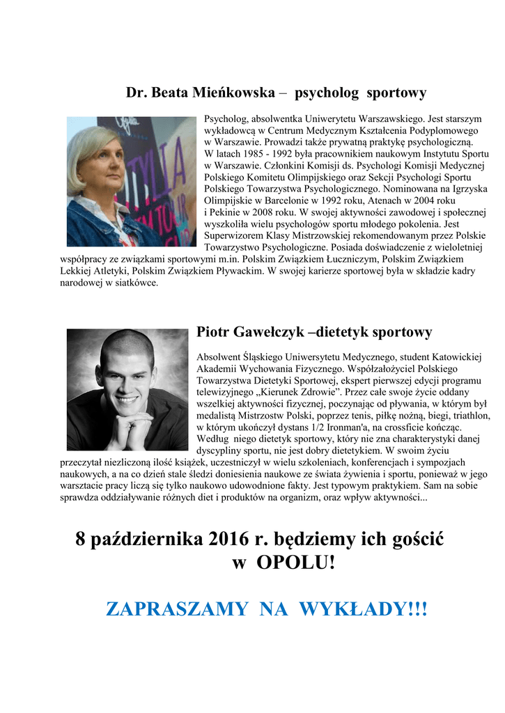 Dr. Beata Mieńkowska – psycholog sportowy Psycholog, absolwentka Uniwerytetu Warszawskiego. Jest starszym wykładowcą w Centrum Medycznym Kształcenia Podyplomowego w Warszawie. Prowadzi także prywatną praktykę psychologiczną. W latach 1985 - 1992 była pracownikiem naukowym Instytutu Sportu w Warszawie. Członkini Komisji ds. Psychologi Komisji Medycznej Polskiego Komitetu Olimpijskiego oraz Sekcji Psychologi Sportu Polskiego Towarzystwa Psychologicznego. Nominowana na Igrzyska Olimpijskie w Barcelonie w 1992 roku, Atenach w 2004 roku i Pekinie w 2008 roku. W swojej aktywności zawodowej i społecznej wyszkoliła wielu psychologów sportu młodego pokolenia. Jest Superwizorem Klasy Mistrzowskiej rekomendowanym przez Polskie Towarzystwo Psychologiczne. Posiada doświadczenie z wieloletniej współpracy ze związkami sportowymi m.in. Polskim Związkiem Łuczniczym, Polskim Związkiem Lekkiej Atletyki, Polskim Związkiem Pływackim. W swojej karierze sportowej była w składzie kadry narodowej w siatkówce. Piotr Gawełczyk –dietetyk sportowy Absolwent Śląskiego Uniwersytetu Medycznego, student Katowickiej Akademii Wychowania Fizycznego. Współzałożyciel Polskiego Towarzystwa Dietetyki Sportowej, ekspert pierwszej edycji programu telewizyjnego „Kierunek Zdrowie”. Przez całe swoje życie oddany wszelkiej aktywności fizycznej, poczynając od pływania, w którym był medalistą Mistrzostw Polski, poprzez tenis, piłkę nożną, biegi, triathlon, w którym ukończył dystans 1/2 Ironman'a, na crossficie kończąc. Według niego dietetyk sportowy, który nie zna charakterystyki danej dyscypliny sportu, nie jest dobry dietetykiem. W swoim życiu przeczytał niezliczoną ilość książek, uczestniczył w wielu szkoleniach, konferencjach i sympozjach naukowych, a na co dzień stale śledzi doniesienia naukowe ze świata żywienia i sportu, ponieważ w jego warsztacie pracy liczą się tylko naukowo udowodnione fakty. Jest typowym praktykiem. Sam na sobie sprawdza oddziaływanie różnych diet i produktów na organizm, oraz wpływ aktywności... 8 października 2016 r. będziemy ich gościć w OPOLU! ZAPRASZAMY NA WYKŁADY!!!