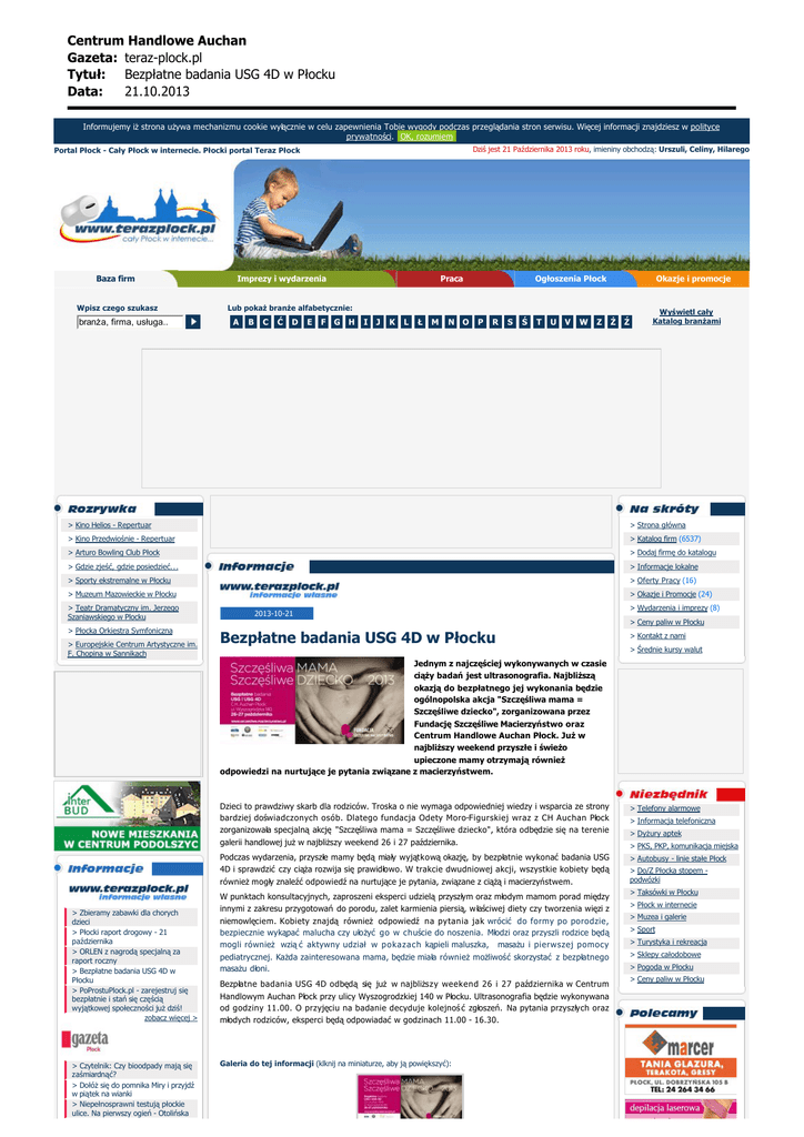 Centrum Handlowe Auchan Gazeta: terazplock.pl Tytu³: Bezp³atne badania USG 4D w P³ocku Data: 21.10.2013 Informujemy iż strona używa mechanizmu cookie wyłącznie w celu zapewnienia Tobie wygody podczas przeglądania stron serwisu. Więcej informacji znajdziesz w polityce prywatności. OK, rozumiem Dziś jest 21 Października 2013 roku, imieniny obchodzą: Urszuli, Celiny, Hilarego Portal Płock - Cały Płock w internecie. Płocki portal Teraz Płock Baza firm Imprezy i wydarzenia Wpisz czego szukasz branża, firma, usługa.. Praca Lub pokaż branże alfabetycznie: A B C Ć D E F G H Ogłoszenia Płock Okazje i promocje I J K L Ł M N O P R S Ś T U V W Z Ż Ź Wyświetl cały Katalog branżami > Kino Helios - Repertuar > Strona główna > Kino Przedwiośnie - Repertuar > Katalog firm (6537) > Arturo Bowling Club Płock > Dodaj firmę do katalogu > Gdzie zjeść, gdzie posiedzieć... > Informacje lokalne > Sporty ekstremalne w Płocku > Oferty Pracy (16) > Muzeum Mazowieckie w Płocku > Okazje i Promocje (24) > Teatr Dramatyczny im. Jerzego Szaniawskiego w Plocku > Płocka Orkiestra Symfoniczna > Europejskie Centrum Artystyczne im. F. Chopina w Sannikach > Wydarzenia i imprezy (8) 2013-10-21 > Ceny paliw w Płocku Bezpłatne badania USG 4D w Płocku > Kontakt z nami > Średnie kursy walut Jednym z najczęściej wykonywanych w czasie ciąży badań jest ultrasonografia. Najbliższą okazją do bezpłatnego jej wykonania będzie ogólnopolska akcja "Szczęśliwa mama = Szczęśliwe dziecko", zorganizowana przez Fundację Szczęśliwe Macierzyństwo oraz Centrum Handlowe Auchan Płock. Już w najbliższy weekend przyszłe i świeżo upieczone mamy otrzymają również odpowiedzi na nurtujące je pytania związane z macierzyństwem. Dzieci to prawdziwy skarb dla rodziców. Troska o nie wymaga odpowiedniej wiedzy i wsparcia ze strony bardziej doświadczonych osób. Dlatego fundacja Odety Moro-Figurskiej wraz z CH Auchan Płock zorganizowała specjalną akcję "Szczęśliwa mama = Szczęśliwe dziecko", która odbędzie się na terenie galerii handlowej już w najbliższy weekend 26 i 27 października. Podczas wydarzenia, przyszłe mamy będą miały wyjątkową okazję, by bezpłatnie wykonać badania USG 4D i sprawdzić czy ciąża rozwija się prawidłowo. W trakcie dwudniowej akcji, wszystkie kobiety będą również mogły znaleźć odpowiedź na nurtujące je pytania, związane z ciążą i macierzyństwem. > Zbieramy zabawki dla chorych dzieci > Płocki raport drogowy - 21 października > ORLEN z nagrodą specjalną za raport roczny > Bezpłatne badania USG 4D w Płocku > PoProstuPlock.pl - zarejestruj się bezpłatnie i stań się częścią wyjątkowej społeczności już dziś! zobacz więcej > W punktach konsultacyjnych, zaproszeni eksperci udzielą przyszłym oraz młodym mamom porad między innymi z zakresu przygotowań do porodu, zalet karmienia piersią, właściwej diety czy tworzenia więzi z > Informacja telefoniczna > Dyżury aptek > PKS, PKP, komunikacja miejska > Autobusy - linie stałe Płock > Do/Z Płocka stopem podwózki > Taksówki w Płocku > Płock w internecie niemowlęciem. Kobiety znajdą również odpowiedź na pytania jak wrócić do formy po porodzie, bezpiecznie wykąpać malucha czy ułożyć go w chuście do noszenia. Młodzi oraz przyszli rodzice będą mogli również wzią ć aktywny udział w pokazach kąpieli maluszka, masażu i pierwszej pomocy > Muzea i galerie pediatrycznej. Każda zainteresowana mama, będzie miała również możliwość skorzystać z bezpłatnego masażu dłoni. > Sklepy całodobowe Bezpłatne badania USG 4D odbędą się już w najbliższy weekend 26 i 27 października w Centrum Handlowym Auchan Płock przy ulicy Wyszogrodzkiej 140 w Płocku. Ultrasonografia będzie wykonywana od godziny 11.00. O przyjęciu na badanie decyduje kolejnoś ć zgłoszeń. Na pytania przyszłych oraz młodych rodziców, eksperci będą odpowiadać w godzinach 11.00 - 16.30. > Czytelnik: Czy bioodpady mają się zaśmiardnąć? > Dołóż się do pomnika Miry i przyjdź w piątek na wianki > Niepełnosprawni testują płockie ulice. Na pierwszy ogień - Otolińska > Telefony alarmowe Galeria do tej informacji (klknij na miniaturze, aby ją powiększyć): > Sport > Turystyka i rekreacja > Pogoda w Płocku > Ceny paliw w Płocku Centrum Handlowe Auchan Gazeta: terazplock.pl Tytu³: Bezp³atne badania USG 4D w P³ocku Data: 21.10.2013 zobacz więcej > źródło: terazplock.pl > Wisła Płock pokonała GKS Bełchatów > 20 rocznica śmierci Dariusza Stolarskiego > Płocki raport drogowy - 10 października zobacz więcej > < wróć Zobacz również z terazplock.pl: Wiadomości 1 - 10 z 2247 dodano: 2013-10-21 > Trzecia bydgoszczanka dołącza do Mon-Pol-u > Kolejarz przerywa passę Wisły > Wielokrotny mistrz Francji pokonany. Orlen Wisła w Lidze Mistrzów! zobacz więcej > Zbieramy zabawki dla chorych dzieci Każdego roku kilkaset chorych dzieci spędza dzień św. Mikołaja w płockich szpitalach. Uczyńmy wszystko, by w tym szczególnym dniu i one mogły cieszyć się z mikołajkowego podarunku. Od ponad dwudziestu lat tajemniczy gość w asyście ba czytaj więcej > dodano: 2013-10-21 > Załóż odblask - jesień na drodze! > Suszyli narkotyki w siłowni > Zatrzymani sprawcy pobicia nieletniego zobacz więcej > Płocki raport drogowy - 21 października Informujemy, gdzie w poniedziałek 21 października na terenie miasta będą prowadzone roboty drogowe oraz, w których miejscach stanie fotoradar Straży Miejskiej. Naprawy bieżące dróg i chodników w poniedziałek 21 października czytaj więcej > dodano: 2013-10-21 ORLEN z nagrodą specjalną za raport roczny > Dobry mecz i lider pokonany! > Dzieci ze Szkoły Muzycznej na stadionie > Puchar dla Młodej Wisły! zobacz więcej > > Biała Podlaska lepsza od Orlen Wisły II > Niemoc trwa - punkty zostają w Danii > Trenerski dwugłos po meczu z Azotami zobacz więcej > > Rozdano nagrody > Wrzesie