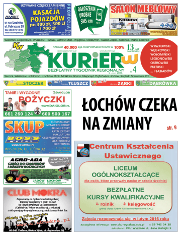 2 LUTEGO 2016 str. 7 str. 11 str. 13 nr 4 str. 16 ŁOCHÓW CZEKA NA ZMIANY str. 9 2 2 LUTEGO 2016 WYSZKÓW l Specjaliści firmy Quad/Graphics szkolili uczniów I TP-U CK Wyszków Warsztaty z Photoshopa Grupa uczniów I TP-U z kierunku technik organizacji reklamy wzięła udział w warsztatach z Photoshopa prowadzonych przez specjalistów firmy Quad/ Graphics. Jest to jedna z największych i najnowocześniejszych firm poligraficznych w Europie, która dodatkowo wyróżnia się profesjonalizmem, wysokim poziomem świadczonych usług i innowacyjnością. Warsztaty były przeznaczone dla osób, które interesują się grafiką i chcą poszerzyć swoją wiedzę oraz zdobyć nowe praktyczne umiejętności. Przez dziesięć tygodni pod okiem specjalistów z branży uczniowie, pracując na nowoczesnych tabletach, mogli nauczyć się m. in. profesjonalnej obróbki zdjęć w najpopularniejszym programie do obróbki obrazu – Adobe Photoshop. Na koniec uczestnicy musieli zmierzyć się z egzaminem, którego zdanie upoważniało do otrzymania certyfikatu. Dla osoby, która uzyskała najlepszy wynik firma przygotowała cenną nagrodę rzeczową, oraz przedstawiciele firmy Quad/Graphics zaprosili uczniów do współpracy po ukończeniu szkoły. Gratulujemy uczniom, którzy otrzymali certyfikaty i zachęcamy wszystkich pozostałych do aktywnego udziału w podobnych przedsięwzięciach podejmowanych przez naszą szkołę. Firmie Quad/Graphics dziękujemy za przeprowadzenie pilotażowego programu w I Technikum Poligraficzno-Usługowym w Wyszkowie. /ckwyszków/ REKLAMY JUŻ OD 1290 ZŁ e-mail: [email protected] 2 LUTEGO 2016 3 WYSZKÓW l Koncert legendy polskiego kabaretu Jan Pietrzak w Wyszkowie z koncertem pt. „Niech żyje Polska” W ubiegłą niedzielę 31 stycznia 2016 r. mieliśmy okazję podziwiać artystę i satyryka, ikonę polskiego kabaretu - Jana Pietrzaka. Koncert „Niech żyje Polska” odbył się w Wyszkowskim Ośrodku Kultury „Hutnik” i zgromadził pełną salę widzów. Został zorganizowany przez wyszkowskie struktury Prawa i Sprawiedliwości. W imieniu organizatorów prowadząca koncert Anna Król poprzedziła koncert Jana Pietrzaka krótkim wprowadzeniem: „Rok 2015 przyniósł wiele niespodziewanych wydarzeń politycznych w naszym kraju. 25 października 2015 roku w wyniku decyzji wyborców, następuje historyczne wydarzenie. Nasi rodacy opowiadają się za programem wyborczym Prawa i Sprawiedliwości, wskutek czego PIS uzyskuje w parlamencie RP społeczny, większościowy mandat zaufania. Po raz pierwszy po 1989 roku PIS stworzył samodzielny rząd bez wchodzenia w koalicje. Następuje pokoleniowa zmiana. Nadzieje Polaków na przeprowadzenie potrzebnych reform, uzdrowienie polskiej polityki i sytuacji społeczno-gospodarczej naszego kraju mają szanse się spełnić. Nastąpił czas na zmiany, które obiecywano skromnym, przeciętym ludziom. Jesteśmy świadkami szybkich i zdecydowanych działań na polskiej scenie politycznej. Jednym z komentatorów tej sceny jest osoba daleka od poprawności politycznej. Polski satyryk, aktor, monologista, felietonista i twórca kabaretu Hybrydy oraz kaba- retu Pod Egidą. Zachodzące zmiany polityczne mają wyraźny wpływ na jego twórczość przez wszystkie lata działalności artystycznej. Cechą charakterystyczną Jana Pietrzaka jest odważne poszukiwanie prawdy w życiu publicznym, piętnowanie zakłamania i ostre, satyryczne widzenie rzeczywistości. Jest osobą wielokrotnie uhonorowaną nagrodami i odznaczeniami za wybitne zasługi dla kultury polskiej, za działalność na rzecz przemian demokratycznych w Polsce oraz za osiągnięcia w pracy artystycznej. Nawiązując do tematyki, dzisiejszy koncert chcemy zadedykować tym, którzy biorą odpowiedzialność za losy naszej Ojczyzny: Panu Prezydentowi Najjaśniejszej Rzeczypospolitej – Andrzejowi Dudzie oraz Rządowi Pani Premier Beaty Szydło. Mam nadzieję, że spędzony dzisiejszego popołudnia czas, dzięki wymownej treści satyrycznej, ubogaci Państwa kulturowo i dostarczy Państwu mnóstwo uśmiechu, którego, na co dzień nam brakuje.” Na początku koncertu przywitano gości m.in.: przewodniczącego Komitetu Stałego Rady Ministrów Henryka Kowalczyka wraz z małżonką, posła na Sejm RP Daniela Milewskiego, radną Sejmiku Województwa Mazowieckiego, pracownika Kancelarii Prezydenta Marzenę Małek wraz z mężem, sędziego Trybunału Stanu Andrzeja Kojro, burmistrza Wyszkowa Grzegorza Nowosielskiego wraz z małżonką, wójta Gminy Obryte Jana Mroczkowskiego wraz z małżonką, księży proboszczów z dekanatu wyszkowskiego, księży z dekanatów ościennych i sąsiednich diecezji, radnych Rady Powiatu i Rady Miejskiej w Wyszkowie, radnych gmin ościennych, przedstawicieli związków, stowarzyszeń działających na terenie powiatu wyszkowskiego. Struktury Prawa i Sprawiedliwości reprezentował przewodniczący Zarządu Powiatowego PiS w Wyszkowie Waldemar Sobczak oraz przewodniczącego Zarządu Komitetu PIS Gminy Wyszków Eugeniusz Zaremba wraz z pozostałymi szefami komitetów terenowych PIS z powiatu wyszkowskiego i powiatów ościennych, Wymieniono również sponsorów koncertu: Jerzego Abramczyka, Dariusza Andrzejewskiego, Iwonę Wyszyńską, Janinę Bajorek, Andrzeja Eychlera, Ewę Bartosiewicz, Andrzeja Lewandowskiego i Waldemara Sobczaka, Annę Król i powitano wraz z osobami towarzyszącymi. Zaproszono na scenę gości tj. przewodniczącego Komitetu Stałego Rady Ministrów Henryka Kowalczyka oraz Posła na Sejm RP Daniela Milewskie- go, prosząc o kilka słów na bieżące tematy. Kiedy rozpoczął się koncert „Niech żyje Polska” widzowie z entuzjazmem przyjmowali satyryczny komentarz do otaczającej nas rzeczywistości i komediowy przekaz rzeczywistości w wykonaniu znakomitego artysty Jana Pietrzaka. Jak się okazuje humor i śmiech jest niezwykle potrzebny - pozwala na dystans wobec bieżących wydarzeń politycznych. Na zakończenie dziękując Jan