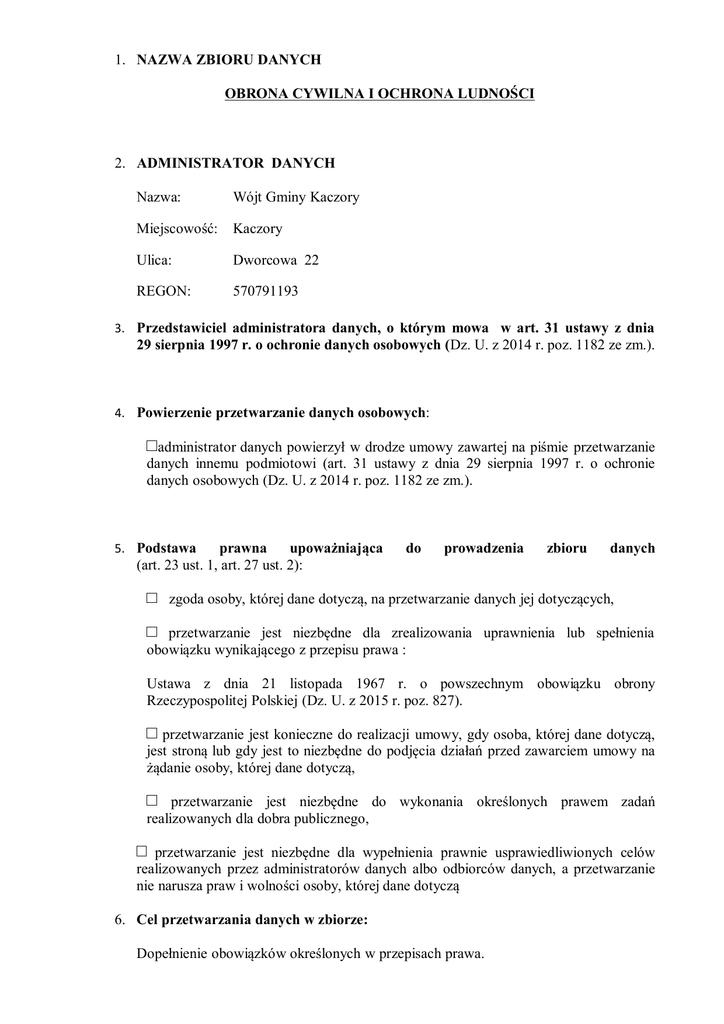 1. NAZWA ZBIORU DANYCH OBRONA CYWILNA I OCHRONA LUDNOŚCI 2. ADMINISTRATOR DANYCH Nazwa: Wójt Gminy Kaczory Miejscowość: Kaczory Ulica: Dworcowa 22 REGON: 570791193 3. Przedstawiciel administratora danych, o którym mowa w art. 31 ustawy z dnia 29 sierpnia 1997 r. o ochronie danych osobowych (Dz. U. z 2014 r. poz. 1182 ze zm.). 4. Powierzenie przetwarzanie danych osobowych: administrator danych powierzył w drodze umowy zawartej na piśmie przetwarzanie danych innemu podmiotowi (art. 31 ustawy z dnia 29 sierpnia 1997 r. o ochronie danych osobowych (Dz. U. z 2014 r. poz. 1182 ze zm.). 5. Podstawa prawna upoważniająca (art. 23 ust. 1, art. 27 ust. 2): do prowadzenia zbioru danych zgoda osoby, której dane dotyczą, na przetwarzanie danych jej dotyczących, przetwarzanie jest niezbędne dla zrealizowania uprawnienia lub spełnienia obowiązku wynikającego z przepisu prawa : Ustawa z dnia 21 listopada 1967 r. o powszechnym obowiązku obrony Rzeczypospolitej Polskiej (Dz. U. z 2015 r. poz. 827). przetwarzanie jest konieczne do realizacji umowy, gdy osoba, której dane dotyczą, jest stroną lub gdy jest to niezbędne do podjęcia działań przed zawarciem umowy na żądanie osoby, której dane dotyczą, przetwarzanie jest niezbędne do wykonania określonych prawem zadań realizowanych dla dobra publicznego, przetwarzanie jest niezbędne dla wypełnienia prawnie usprawiedliwionych celów realizowanych przez administratorów danych albo odbiorców danych, a przetwarzanie nie narusza praw i wolności osoby, której dane dotyczą 6. Cel przetwarzania danych w zbiorze: Dopełnienie obowiązków określonych w przepisach prawa. 7. Opis kategorii osób, których dane są przetwarzane w zbiorze: Osoby fizyczne realizujące zadania w ramach powszechnej samoobrony ludności. 8. Zakres danych przetwarzanych w zbiorze: nazwiska i imiona, adres zamieszkania lub pobytu, numer ewidencyjny PESEL, miejsce pracy, seria i numer dowodu osobistego, inne dane osobowe, przetwarzane w zbiorze: 9. Sposób zbierania danych do zbioru: Od osób, których dotyczą, 10. Sposób udostępniania danych ze zbioru: Dane nie będą udostępniane innym podmiotom niż upoważnione na podstawie przepisów prawa. 11. Oznaczenie odbiorcy danych lub kategorii odbiorców, którym dane mogą być przekazywane: 12. Informacja dotycząca ewentualnego przekazywania danych do państwa trzeciego-
