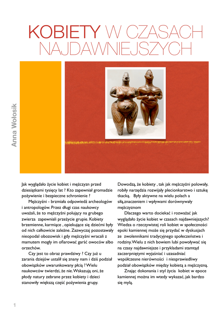 Anna Wołosik KOBIETY W CZASACH NAJDAWNIEJSZYCH Jak wyglądało życie kobiet i mężczyzn przed dziesiątkami tysięcy lat ? Kto zapewniał gromadzie pożywienie i bezpieczne schronienie ? Mężczyźni - brzmiała odpowiedź archeologów i antropologów. Przez długi czas naukowcy uważali, że to mężczyźni polujący na grubego zwierza zapewniali przeżycie grupie. Kobiety brzemienne, karmiące , opiekujące się dziećmi były od nich całkowicie zależne. Zazwyczaj pozostawały nieopodal obozowisk i gdy mężczyźni wracali z mamutem mogły im ofiarować garść owoców albo orzechów. Czy jest to obraz prawdziwy ? Czy już u zarania dziejów ustalił się znany nam i dziś podział obowiązków uwarunkowany płcią ? Wielu naukowców twierdzi, że nie. Wskazują oni, że płody natury zebrane przez kobiety i dzieci stanowiły większą część pożywienia grupy. 1 Dowodzą, że kobiety , tak jak mężczyżni polowały, robiły narzędzia rozwijały plecionkarstwo i sztukę tkacką. Były aktywne na wielu polach a siłą,znaczeniem i wpływami dorównywały mężczyznom Dlaczego warto dociekać i rozważać jak wyglądało życie kobiet w czasach najdawniejszych? Wiedza o rzeczywistej roli kobiet w społeczności epoki kamiennej może się przydać w dyskusjach ze zwolennikami tradycyjnego społeczeństwa i rodziny. Wielu z nich bowiem lubi powoływać się na czasy najdawniejsze i przykladami stamtąd zaczerpniętymi wyjaśniać i uzasadniać współczesne nierówności i niesprawiedliwy podział obowiązków między kobietą a mężczyzną. Znając dokonania i styl życia kobiet w epoce kamiennej można im wtedy wykazać, jak bardzo się mylą. KOBIETY W CZASACH NAJDAWNIEJSZYCH W POSZUKIWANIU POCZĄTKÓW RODZINY LUDZKIEJ Pojawia się człowiek rozumny Kiedy człowiek nauczył się mówić ? Kiedy nauczył się odtwarzać w rzeźbie i rysunku kształty ludzi i zwierząt ? Kiedy po raz pierwszy dał wyraz takim uczuciom jak strach przed śmiercią i żal za tymi, którzy odeszli ? Słowem kiedy człowiek nabył ludzkich zachowań ? Naukowcy przypuszczają, iż nastąpiło to między 100 a 10 tysiącami lat temu. Dokonali tego przedstawiciele gatunku nazywanego po łacinie homo sapiens sapiens czyli człowiek rozumny właściwy. My, ludzie współcześni, również należymy do tego gatunku. Homo sapiens pojawił się w Afryce około 100 tysięcy lat temu i w ciągu następnych kilkudziesięciu tysięcy lat dotarł na wszystkie kontynenty. W Europie pojawił się około 40 tysięcy lat temu. Homo sapiens odziedziczył wiele po swoich przodkach, którzy zaludniali ziemię od milionów lat. Poprzednicy homo sapiens wprowadzili mięso do swojej diety, ujarzmili ogień i budowali proste schronienia. Tę wiedzę i te umiejętności posiadał także homo Malowidło zachowane w północnej Afryce opowiada o dniu powszednim kobiet z epoki kamiennej. Kobiety zbierały owoce, orzechy, jaja ptasie, małże i mięczaki. Płody natury zebrane przez kobiety stanowiły większą część całego pożywienia grupy. 2 sapiens, ale nie poprzestał na tym. Wprowadził do swojego życia zmiany, które dały zdumiewające rezultaty i przyspieszyły rozwój ludzkości.Przyjrzyjmy się jak toczyło się życie naszych bezpośrednich praprzodków w epoce paleolitu. Życie w epoce paleolitu Nasi przodkowie byli wędrowcami. Szli gromadą liczącą około 20-30 osób. Przemierzali rozległe obszary, w zależności od pory roku zatrzymując się nieopodal tras wędrówek zwierząt lub na skraju lasu, kiedy dojrzewały owoce. W miejscach postoju zakładali swoje obozowiska na dłużej. Chaty budowali z kamienia, drewna, a także kości oraz skór zwierząt. Czas spędzany w obozowisku sprzyjał wzajemnej komunikacji między ludźmi. Dzięki temu rozwijali oni umiejętność posługiwania się mową. Taką liczącą 20-30 osób grupę utrzymującą się z tego co jej członkowie znajda i upolują naukowcy nazywają wspólnotą zbieracko-łowiecka. Takie wspólnoty ciągle żyją na Ziemi przykład w Afryce na pustyni Kalahari. KOBIETY W CZASACH NAJDAWNIEJSZYCH Zapewnieniem środków do życia zajmowali się zarówno mężczyźni jak i kobiety. Polowali przede wszystkim na drobną zwierzynę, łowili też ryby i ptaki. Tropienie i osaczanie grubego zwierza – mamuta, lwa jaskiniowego, niedźwiedzia było niebezpieczne i zdarzało się rzadko. Na co dzień ludzie polowali na małe zwierzęta jak króliki lub lisy. Zapewne chwytali je w sieci, bo tak polując można liczyć na duży łup przy stosunkowo małym nakladzie czasu i energii. W polowaniu z siecią współdziałali wszyscy: mężczyźni i kobiety, dzieci i starsi. Przeczesywali zarośla, naganiali zwierzęta, zarzucali na nie sieć i wyłapywali. Każdy miał swój udział w sukcesie, ale największy kobiety, które zbierały rośliny i z ich włókien splatały sieci. Na polowaniu, przy przygotowywaniu żywności i przy budowie domostw, ludzie Wenus z Brassempouy (Francja) to najstarszy znany wizerunek ludzkiej (kobiecej!) twarzy. Głowę wyrzeźbiono w kawałku kła mamuta, na 3.65 cm wysokim, i na 1.9 cm szerokim. Twarz, choć nie ma ust a tylko zaznaczone brwi, oczy i nos, jest harmonijna i spokojna w wyrazie. Pionowe i poziome nacięcia biegnące od czubka głowy do ramion to prawdopodobnie włosy, lub rodzaj welonu bądż kapelusza. Rzeżba jest realistyczna, ale rysy twarzy i proporcje głowy nie pozwalają - zdaniem naukowców - powiązać kobiety z żadnym znanym plemieniem. Kim była Wenus z Brassempouy ? Do jakiego rodu, plemienia należała ? Zapewne już się tego nie dowiemy. 3 ówcześni – tak jak ich przodkowie – posługiwali się przede wszystkim narzędziami wykonanymi z kamienia. Były to jednak narzędzia znacznie doskonalsze, niż te, których używali ludzie w minionych tysiącleciach. Rzemieślnicy wytwarzali noże, groty do włóczni, skrobaczki do czyszczenia skór, rylce do rzeźbienia, ostrza do pił, szydła przebijaki i