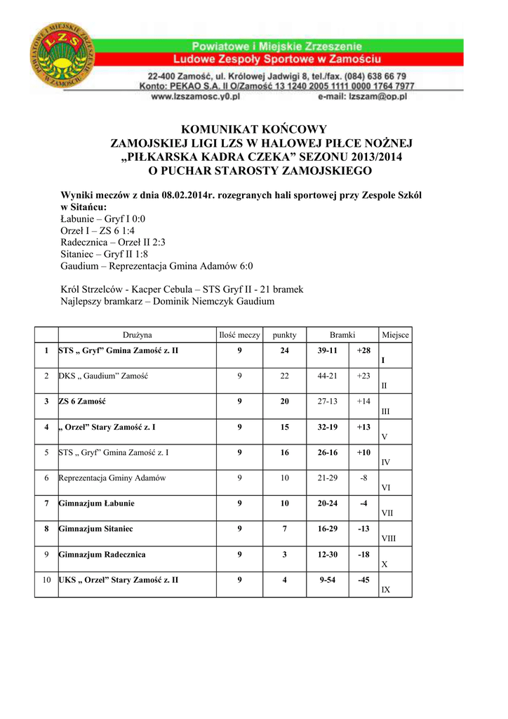KOMUNIKAT KOŃCOWY ZAMOJSKIEJ LIGI LZS W HALOWEJ PIŁCE NOŻNEJ „PIŁKARSKA KADRA CZEKA” SEZONU 2013/2014 O PUCHAR STAROSTY ZAMOJSKIEGO Wyniki meczów z dnia 08.02.2014r. rozegranych hali sportowej przy Zespole Szkól w Sitańcu: Łabunie – Gryf I 0:0 Orzeł I – ZS 6 1:4 Radecznica – Orzeł II 2:3 Sitaniec – Gryf II 1:8 Gaudium – Reprezentacja Gmina Adamów 6:0 Król Strzelców - Kacper Cebula – STS Gryf II - 21 bramek Najlepszy bramkarz – Dominik Niemczyk Gaudium Drużyna 1 STS „ Gryf” Gmina Zamość z. II Ilość meczy punkty 9 24 Bramki 39-11 Miejsce +28 I 2 DKS „ Gaudium” Zamość 9 22 44-21 +23 II 3 ZS 6 Zamość 9 20 27-13 +14 III 4 „ Orzeł” Stary Zamość z. I 9 15 32-19 +13 V 5 STS „ Gryf” Gmina Zamość z. I 9 16 26-16 +10 IV 6 Reprezentacja Gminy Adamów 9 10 21-29 -8 VI 7 Gimnazjum Łabunie 9 10 20-24 -4 VII 8 Gimnazjum Sitaniec 9 7 16-29 -13 VIII 9 Gimnazjum Radecznica 9 3 12-30 -18 X 10 UKS „ Orzeł” Stary Zamość z. II 9 4 9-54 -45 IX Składy drużyn: STS Gryf Gmina Zamość II Bondyra Dawid, Popko Szczepan, Galan Damian, Cebula Krystian, Bednarz Adam, Bondyra Albert, Łuczka Krystian, Łuczka Dominik, Nizioł Mateusz, Cebula Kacper, Kozioł Paweł, trener Roman Blonka DKS Gaudium Zamość Pilipczuk Damian, Niemczyk Dominik, Koszuta Mateusz, Gil Michał, Głąb Patryk, Teterycz Szymon, Zub Dariusz, Kurzępa Dominik, Szykuła Mateusz, Szewczuk Maciej, Mokrzyński Michał, Wójtowicz Krystian, trener ks Tomasz Winogrodzki Reprezentacja Gminy Adamów Marguła Paweł, Marguła Michał, Szwedo Szymon, Szykuła Dawid, Bełz Jakub, Pupiec Konrad, Dębiński Rafał, Sobczak Piotr, Tyrka Michał, Mielnik Adam, Naworol Mateusz, Naworol Łukasz, trener Adam Kozyra UKS Orzeł Stary Zamość I Węcławik Sebastian, Kozioł Zbigniew, Sałamacha Patryk, Szałacha Daniel, Pieczykolan Mateusz, Rybak Arek, Karpowicz Rafał, Woźniak Dawid, Dudka Karol, Torbiński Oskar, Goch Adrian, trener Paweł Lewandowski Gimnazjum Łabunie Nowosad Adam, Maksymiec Adrian, Fogiel Krzysztof, Karchut Mateusz, Karchut Oskar, Borowiec Patryk, Bielecki Łukasz, Latawiec Łukasz, Kozowicz Patryk, Gryszyn Patryk, Nowosad Karol, Wołoszyn Jakub, trener Zbigniew Podkański STS Gryf Gmina Zamość I Kocyło Bartłomiej, Głowacki Grzegorz, Zwolan Szymon, Niemczuk Damian, Romanowski Krystian, Świrgoń Damian, Mołdoch Mateusz, Ponachajba Łukasz, Misiarz Paweł, Strzałkowski Wiktor, Adamowicz Bartosz, Hrabowski Damian, trener Roman Blonka Gimnazjum Sitaniec Bosiak Tomasz, Tchórz Piotr, Milczuk Wojciech, Szałacha Jakub, Krzepiłko Przemysław, Krucoń Bartosz, Sobstyl Sebastian, Zgnilec Bartłomiej, Grosman Jan, Matwiejczuk Kacper, Gryn Marcin, Mróz Wojciech, trener Piotr Chabros Gimnazjum Nr 6 Zamość Gadzina Kasper, Sikora Kamil, Danilczuk Konrad, Kania Grzegorz, Zwolak Michał, Konował Dominik, Niemczuk Damian, Malczewski Łukasz, Borek Sebastian, Leśniak Sebastian, Tatara Jakub, Łuczka Przemysław, trener Dariusz Lachowicz Gimnazjum Radecznica Cielica Adrian, Hadam Sebastian, Harkot Kacper, Harkot Michał, Harkot Patryk, Lachowicz Mateusz, Siemczyk Sebastian, Skrok Jakub, Studziński Krzysztof, Olech Grzegorz, Zych Marcin, Zych Wojciech, trener Wojciech Kondrat UKS Orzeł Stary Zamość II Mężyński Jakub, Czarniecki Mateusz, Bochniak Patryk, Szymala Przemek, Bojar Kacper, Bochniak Patryk, Maluga Daniel, Pawlasiuk Kuba, Kozioł Przemek, Sałamacha Hubert, Krystian Goch, trener Paweł Lewandowski Puchary ufundowali za miejsce I – Starosta Zamojski Henryk Matej, za miejsce II – Prezydent Miasta Zamość Marcin Zamoyski, za miejsce III i IV Powiatowe i Miejskie Zrzeszenie LZS w Zamościu, statuetki dla najlepszych zawodników ufundowało Starostwo Zamojskie. Puchary i medale wręczali: Poseł do Parlamentu Europejskiego, Przewodniczący Rady Powiatowej i Miejskiej Zrzeszenia LZS w Zamościu Arkadiusz Bratkowski, Wicestarosta Zamojski Jerzy Sobczuk Patronat medialny: Gazeta Zamojska Kronika Tygodnia Zamojska Telewizja Kablowa
