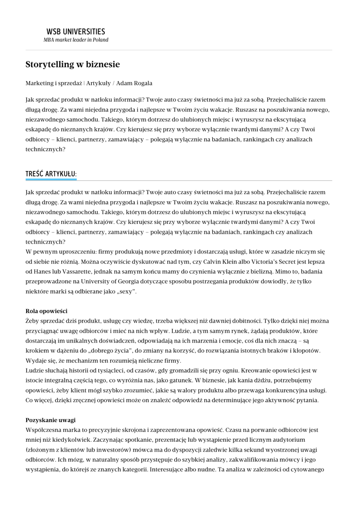 WSB UNIVERSITIES MBA market leader in Poland Storytelling w biznesie Marketing i sprzedaż | Artykuły / Adam Rogala Jak sprzedać produkt w natłoku informacji? Twoje auto czasy świetności ma już za sobą. Przejechaliście razem długą drogę. Za wami niejedna przygoda i najlepsze w Twoim życiu wakacje. Ruszasz na poszukiwania nowego, niezawodnego samochodu. Takiego, którym dotrzesz do ulubionych miejsc i wyruszysz na ekscytującą eskapadę do nieznanych krajów. Czy kierujesz się przy wyborze wyłącznie twardymi danymi? A czy Twoi odbiorcy – klienci, partnerzy, zamawiający – polegają wyłącznie na badaniach, rankingach czy analizach technicznych? TREŚĆ ARTYKUŁU: Jak sprzedać produkt w natłoku informacji? Twoje auto czasy świetności ma już za sobą. Przejechaliście razem długą drogę. Za wami niejedna przygoda i najlepsze w Twoim życiu wakacje. Ruszasz na poszukiwania nowego, niezawodnego samochodu. Takiego, którym dotrzesz do ulubionych miejsc i wyruszysz na ekscytującą eskapadę do nieznanych krajów. Czy kierujesz się przy wyborze wyłącznie twardymi danymi? A czy Twoi odbiorcy – klienci, partnerzy, zamawiający – polegają wyłącznie na badaniach, rankingach czy analizach technicznych? W pewnym uproszczeniu: firmy produkują nowe przedmioty i dostarczają usługi, które w zasadzie niczym się od siebie nie różnią. Można oczywiście dyskutować nad tym, czy Calvin Klein albo Victoria’s Secret jest lepsza od Hanes lub Vassarette, jednak na samym końcu mamy do czynienia wyłącznie z bielizną. Mimo to, badania przeprowadzone na University of Georgia dotyczące sposobu postrzegania produktów dowiodły, że tylko niektóre marki są odbierane jako „sexy”. Rola opowieści Żeby sprzedać dziś produkt, usługę czy wiedzę, trzeba większej niż dawniej dobitności. Tylko dzięki niej można przyciągnąć uwagę odbiorców i mieć na nich wpływ. Ludzie, a tym samym rynek, żądają produktów, które dostarczają im unikalnych doświadczeń, odpowiadają na ich marzenia i emocje, coś dla nich znaczą – są krokiem w dążeniu do „dobrego życia”, do zmiany na korzyść, do rozwiązania istotnych braków i kłopotów. Wydaje się, że mechanizm ten rozumieją nieliczne firmy. Ludzie słuchają historii od tysiącleci, od czasów, gdy gromadzili się przy ogniu. Kreowanie opowieści jest w istocie integralną częścią tego, co wyróżnia nas, jako gatunek. W biznesie, jak kania dżdżu, potrzebujemy opowieści, żeby klient mógł szybko zrozumieć, jakie są walory produktu albo przewaga konkurencyjna usługi. Co więcej, dzięki zręcznej opowieści może on znaleźć odpowiedź na determinujące jego aktywność pytania. Pozyskanie uwagi Współczesna marka to precyzyjnie skrojona i zaprezentowana opowieść. Czasu na porwanie odbiorców jest mniej niż kiedykolwiek. Zaczynając spotkanie, prezentację lub wystąpienie przed licznym audytorium (złożonym z klientów lub inwestorów) mówca ma do dyspozycji zaledwie kilka sekund wyostrzonej uwagi odbiorców. Ich mózg, w naturalny sposób przystępuje do szybkiej analizy, zakwalifikowania mówcy i jego wystąpienia, do którejś ze znanych kategorii. Interesujące albo nudne. Ta analiza w zależności od cytowanego źródła trwa od 8 do 12 sekund. Warto pozostawić słuchaczy z niedosytem, tak aby opowieść wzbudziła chęć bliższego poznania firmy, osoby, produktu czy sposobu myślenia specjalistów danej firmy. Skuteczna historia Wpływowe opowieści zawierają kilka niezbędnych elementów. W klasycznej strukturze storytellingu wyodrębniono 4: ● strategiczny przekaz ● konflikt ● bohaterów ● fabułę Elementy te można łączyć i dowolnie układać, w zależności od kontekstu, w którym historia jest opowiadana, a także celu opowiadania. Olbrzymi wpływ na opowieść ma również narrator, czyli właśnie TY Czytelniku! Jakość historii determinuje bowiem Twoja odwaga do przełamania oporów w zaproponowaniu klientowi historii, która przekona go do Ciebie i Twojej firmy. W największym stopniu opowieść sprzedaje jej autentyzm. Prawda zawarta w tych kilkunastu zdaniach wypowiedzianych na spotkaniu jest największą siłą sprawczą wpływającą na odbiorców komunikacji. Prawdziwe fakty zaczerpnięte z doświadczenia, codziennej praktyki, prawdziwi ludzie, prawdziwe problemy, troski i radości. Prawdziwa i prawdziwy TY – to największa siła każdej historii. Strategiczny przekaz W rozumieniu kreatorów opowieści biznesowych, strategiczny przekaz to ideologiczne lub moralne stwierdzenie, które wyznacza oś tematyczną całej historii. Na przykład w greckiej bajce o zającu i żółwiu, wyścig wygrywa żółw, ponieważ jest powolny i systematyczny, a zając szybki, lecz lekkomyślny. Morał tej historii można zamknąć w zdaniu „arogancja nie popłaca”. Opowieść staje się potwierdzeniem morału – głównego przekazu – i to dzięki niej, odbiorcy mogą lepiej zrozumieć i uwewnętrznić przekaz. Uwewnętrznić, czyli utożsamić się z nim, przejąć się i przeżyć emocjonalnie. Jest to możliwe wyłącznie, gdy opowieść odwołuje się do realnego świata i związanych z nim doświadczeń. Kto nie stoi w korkach? Kto nie ma kłopotów z wolnym internetem? Kto nie chorował? Kto nie zapomniał o imieninach ważnej osoby? Firmy tworzą opowieści w większości po to, aby komunikować przekaz, który odbije się pozytywnym echem dla brandu. Najpierw jednak należy rozwinąć klarownie sformułowany przekaz. Bez tego opowieść nie będzie miała sensu i, tym bardziej, strategicznego celu. A w odbiorze zabrzmi jak dygresja, opowiastka. Aby stworzyć strategiczny przekaz warto przede wszystkim odwołać się do misji firmy. Jakie potrzeby zaspokajają jej produktami czy usługami potencjalni klienci? Sprzedajemy emocje, a nie dane i suche fakty. W precyzowaniu strategicznego przekazu opowieści wspomagającej prezentację biznesową, wy