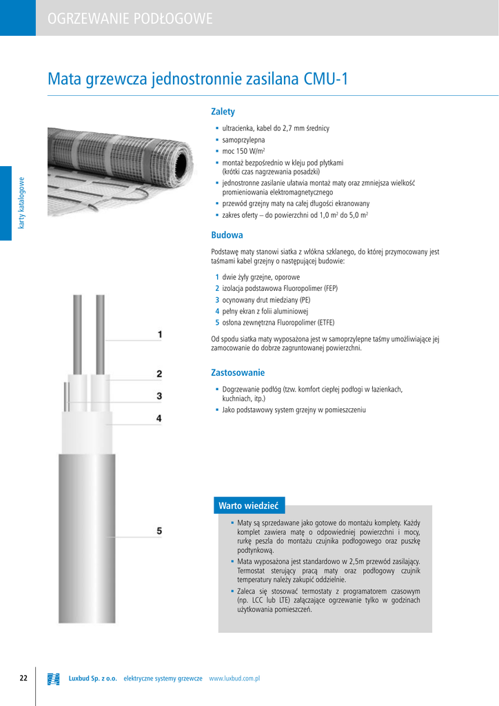 OGRZEWANIE PODŁOGOWE Mata grzewcza jednostronnie zasilana CMU-1 Zalety ultracienka, kabel do 2,7 mm średnicy samoprzylepna moc 150 W/m2 karty katalogowe montaż bezpośrednio w kleju pod płytkami (krótki czas nagrzewania posadzki) jednostronne zasilanie ułatwia montaż maty oraz zmniejsza wielkość promieniowania elektromagnetycznego przewód grzejny maty na całej długości ekranowany zakres oferty – do powierzchni od 1,0 m2 do 5,0 m2 Budowa Podstawę maty stanowi siatka z włókna szklanego, do której przymocowany jest taśmami kabel grzejny o następującej budowie: 1 dwie żyły grzejne, oporowe 2 izolacja podstawowa Fluoropolimer (FEP) 3 ocynowany drut miedziany (PE) 4 pełny ekran z folii aluminiowej 5 osłona zewnętrzna Fluoropolimer (ETFE) Od spodu siatka maty wyposażona jest w samoprzylepne taśmy umożliwiające jej zamocowanie do dobrze zagruntowanej powierzchni. Zastosowanie Dogrzewanie podłóg (tzw. komfort ciepłej podłogi w łazienkach, kuchniach, itp.) Jako podstawowy system grzejny w pomieszczeniu Warto wiedzieć Maty są sprzedawane jako gotowe do montażu komplety. Każdy komplet zawiera matę o odpowiedniej powierzchni i mocy, rurkę peszla do montażu czujnika podłogowego oraz puszkę podtynkową. Mata wyposażona jest standardowo w 2,5m przewód zasilający. Termostat sterujący pracą maty oraz podłogowy czujnik temperatury należy zakupić oddzielnie. Zaleca się stosować termostaty z programatorem czasowym (np. LCC lub LTE) załączające ogrzewanie tylko w godzinach użytkowania pomieszczeń. 22 Luxbud Sp. z o.o. elektryczne systemy grzewcze www.luxbud.com.pl OGRZEWANIE PODŁOGOWE Dane techniczne Ogrzewanie główne lub dogrzewanie Jednostkowa moc grzejna 150 W/m2 Napięcie znamionowe 230V AC +70°C Stopień ochrony IP67 Szerokość maty 0,5 m Długość przewodu zasilającego karty katalogowe Max. wytrzymałość temperaturowa przewodu grzejnego 2,5 m Średnica zewnętrzna przewodu grzejnego od 2,4 mm do 2,7 mm Standardowe maty grzejne Maty grzejne 150 W/m² Symbol Powierzchnia [m2] Wymiary [m] Moc [W] CMU-1-155-150 1,0 0,5 x 2,0 150 CMU-1-155-225 1,5 0,5 x 3,0 225 CMU-1-155-300 2,0 0,5 x 4,0 300 CMU-1-155-375 2,5 0,5 x 5,0 375 CMU-1-155-450 3,0 0,5 x 6,0 450 CMU-1-155-600 4,0 0,5 x 8,0 600 CMU-1-155-750 5,0 0,5 x 10,0 750 www.luxbud.com.pl elektryczne systemy grzewcze Luxbud Sp. z o.o. 23