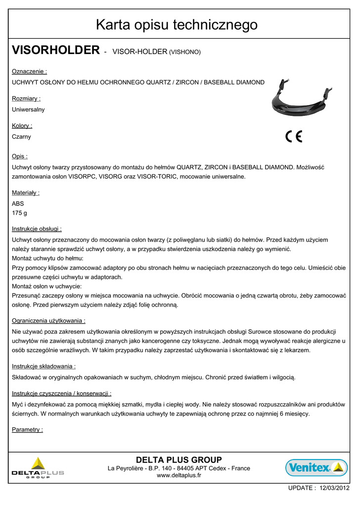 (#+ !) &/ +* ;! VISORHOLDER 7 57 ?5A !" #$ %#&'$ (!'!#$ #$ ) & *%$+ !&,!$ +%#$ )#$&+!&!%$ -! "!+./ -! *,"0% 1 2 !.' %!34 "!+!% !&,! 561 5 !# 571 "!!% / %#&'2 +# ,$ 89: ; &+#/<= !>&,/; *%$+ !&,!$ )#!$ -! "!!% !&,! +%#$ ? )!' %@;'/ '/> & +< A -! *,"0%2 6#- <.-$" /.$ " '.$ &+# &)#%- 4 /*%$+ !&,!$1 % )#$)-</ &+% #- /&<!- '.$ ;! %$" 42 !+. /*%$+/ -! *,"/ 6#$ )!"!$ <' )&0% "!!%4 -)+!#$ )! !>/ &+#!* *,"/ % @ * )#!$* -! +;! '/2 " 3 4 !> )#&/% @3 /*%$+/ % -)+!#*2 !+. !&,! % /*%$ 6#&/B4 )$ !&,!$ % " =& "!!% /*%$ 2 >#0 4 "!!% ! =-B %#+B !>#!+/1 .>$ "!!%4 !&,!@2 6#- ) #%&$" /.$ " '.$ -=B4 C!' @ !*#!B2 ;# /.$+<!% /.$%4 )! <#&" /.$+<!% !<#3'!$" % )!%$.&$* &+#/<=* !>&,/; /#!% &+!&!% -! )#!-/<= /*%$+0% % #=B &/>&+= $* =<! <#!; $ +!<&$2 D-< "!;B %$%!,$%4 #<= '#; / !&0> &;0' %#.' %$*2 +< " )#$)-</ '.$ )#&+4 /.$+<!% &<!+<+!%4 & @ '<#"2 &+#/<= &<,-!% <,-!%4 % !#$; '$* !)<!% * % &/*$"1 *,!-$" " =&/2 *#! 4 )#- 3% +," % ';! B2 &+#/<= $& <!&#%= $4 -$C<!%4 )!"!B " @<< = &"+< 1 "$-, ),= %!-$2 '.$ &+!&!%4 #!)/&' <0% )#!-/<+0% 3 #$*2 !#"'$* %#/<* /.$+<!% /*%$+$ + )% =B !*#!@ )# ! =" = E " & @$2 6#"+#$ DELTA PLUS GROUP La Peyrolière - B.P. 140 - 84405 APT Cedex - France www.deltaplus.fr UPDATE : 12/03/2012 (#+ !) &/ +* ;! VISORHOLDER 7 57 ?5A $#0> ;!-$ %$"; " -$#<+$%$ /#!)=&< = GHEGE1 %,& % <#& #;!!" 1 &<!-' %!3 1 <!"C!#+/ !# !#"" /#!)=&< " % '.!3 !- "!+!%= !&,!$ 7 I 8EEJKK8 576 7 L 89I8JKKE 57 7 IGH 8EEJKK8 57 DELTA PLUS GROUP La Peyrolière - B.P. 140 - 84405 APT Cedex - France www.deltaplus.fr UPDATE : 12/03/2012
