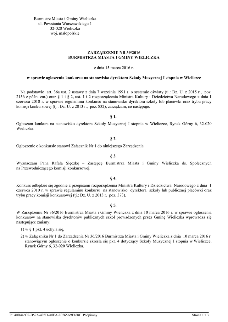 Burmistrz Miasta i Gminy Wieliczka ul. Powstania Warszawskiego 1 32-020 Wieliczka woj. małopolskie ZARZĄDZENIE NR 39/2016 BURMISTRZA MIASTA I GMINY WIELICZKA z dnia 15 marca 2016 r. w sprawie ogłoszenia konkursu na stanowisko dyrektora Szkoły Muzycznej I stopnia w Wieliczce Na podstawie art. 36a ust. 2 ustawy z dnia 7 września 1991 r. o systemie oświaty (tj.: Dz. U. z 2015 r., poz. 2156 z późn. zm.) oraz § 1 i § 2, ust. 1 i 2 rozporządzenia Ministra Kultury i Dziedzictwa Narodowego z dnia 1 czerwca 2010 r. w sprawie regulaminu konkursu na stanowisko dyrektora szkoły lub placówki oraz trybu pracy komisji konkursowej (tj.: Dz. U. z 2013 r., poz. 832), zarządzam, co następuje: § 1. Ogłaszam konkurs na stanowisko dyrektora Szkoły Muzycznej I stopnia w Wieliczce, Rynek Górny 6, 32-020 Wieliczka. § 2. Ogłoszenie o konkursie stanowi Załącznik Nr 1 do niniejszego Zarządzenia. § 3. Wyznaczam Pana Rafała Ślęczkę – Zastępcę Burmistrza Miasta i Gminy Wieliczka ds. Społecznych na Przewodniczącego komisji konkursowej. § 4. Konkurs odbędzie się zgodnie z przepisami rozporządzenia Ministra Kultury i Dziedzictwa Narodowego z dnia 1 czerwca 2010 r. w sprawie regulaminu konkursu na stanowisko dyrektora szkoły lub publicznej placówki oraz trybu pracy komisji konkursowej (tj.: Dz. U. z 2013 r. poz. 373). § 5. W Zarządzeniu Nr 36/2016 Burmistrza Miasta i Gminy Wieliczka z dnia 10 marca 2016 r. w sprawie ogłoszenia konkursów na stanowiska dyrektorów publicznych szkół prowadzonych przez Gminę Wieliczka wprowadza się następujące zmiany: 1) w § 1 pkt. 4 uchyla się, 2) w Załączniku Nr 1 do Zarządzenia Nr 36/2016 Burmistrza Miasta i Gminy Wieliczka z dnia 10 marca 2016 r. stanowiącym ogłoszenie o konkursie skreśla się pkt. 4 dotyczący Szkoły Muzycznej I stopnia w Wieliczce, Rynek Górny 6, 32-020 Wieliczka. Id: 40D446C2-D52A-495D-A0FA-E0265A9F168C. Podpisany Strona 1 z 3 § 6. Zarządzenie wchodzi w życie z dniem 18 marca 2016 r. Burmistrz Artur Kozioł Id: 40D446C2-D52A-495D-A0FA-E0265A9F168C. Podpisany Strona 2 z 3 Załącznik do Zarządzenia Nr 39/2016 Burmistrza Miasta i Gminy Wieliczka z dnia 15 marca 2016 r. OGŁOSZENIE O KONKURSIE Burmistrz Miasta i Gminy Wieliczka ogłasza konkurs na stanowisko dyrektora Szkoły Muzycznej I stopnia w Wieliczce, Rynek Górny 6, 32-020 Wieliczka Do konkursu może przystąpić osoba, która spełnia wymagania określone w przepisach w sprawie wymagań, jakim powinna odpowiadać osoba zajmująca stanowisko dyrektora oraz inne stanowisko kierownicze w poszczególnych typach publicznych szkół i rodzajach publicznych placówek. Oferty osób przystępujących do konkursu powinny zawierać dokumenty określone w załączniku nr 2 do rozporządzenia Ministra Kultury i Dziedzictwa Narodowego z dnia 1 czerwca 2010 r. w sprawie regulaminu konkursu na stanowisko dyrektora szkoły lub placówki oraz trybu pracy komisji konkursowej (tj.: Dz. U. z 2013 r., poz. 832). Oferty należy składać w zamkniętych kopertach z podanym imieniem, nazwiskiem, adresem zwrotnym i numerem telefonu kandydata oraz dopiskiem „Konkurs na stanowisko dyrektora Szkoły Muzycznej I stopnia w Wieliczce” na adres: Urząd Miasta i Gminy w Wieliczce ul. Powstania Warszawskiego 1 32-020 Wieliczka w terminie do dnia 8 kwietnia 2016 r., do godz. 16.00 (liczy się data złożenia oferty w Sekretariacie Urzędu Miasta i Gminy w Wieliczce) O terminie i miejscu przeprowadzenia postępowania konkursowego kandydaci przystępujący do konkursu zostaną powiadomieni pisemnie. Burmistrz Artur Kozioł Id: 40D446C2-D52A-495D-A0FA-E0265A9F168C. Podpisany Strona 3 z 3