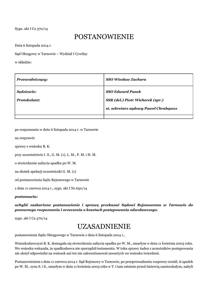 Sygn. akt I Ca 370/14 POSTANOWIENIE Dnia 6 listopada 2014 r. Sąd Okręgowy w Tarnowie – Wydział I Cywilny w składzie: Przewodniczący: SSO Wiesław Zachara Sędziowie: SSO Edward Panek Protokolant: SSR (del.) Piotr Wicherek (spr.) st. sekretarz sądowy Paweł Chrabąszcz po rozpoznaniu w dniu 6 listopada 2014 r. w Tarnowie na rozprawie sprawy z wniosku B. K. przy uczestnictwie I. S., G. M. (1), L. M., P. M. i H. M. o stwierdzenie nabycia spadku po W. M. na skutek apelacji uczestniczki G. M. (1) od postanowienia Sądu Rejonowego w Tarnowie z dnia 11 czerwca 2014 r., sygn. akt I Ns 650/14 postanawia: uchylić zaskarżone postanowienie i sprawę przekazać Sądowi Rejonowemu w Tarnowie do ponownego rozpoznania i orzeczenia o kosztach postępowania odwoławczego. sygn. akt I Ca 370/14 UZASADNIENIE postanowienia Sądu Okręgowego w Tarnowie z dnia 6 listopada 2014 r., Wnioskodawczyni B. K. domagała się stwierdzenia nabycia spadku po W. M., zmarłym w dniu 11 kwietnia 2003 roku. We wniosku wskazała, że spadkodawca nie sporządził testamentu. W toku sprawy żaden z uczestników postępowania nie złożył odpowiedzi na wniosek ani też nie zakwestionował zawartych we wniosku twierdzeń. Postanowieniem z dnia 11 czerwca 2014 r. Sąd Rejonowy w Tarnowie, po przeprowadzeniu rozprawy orzekł, iż spadek po W. M., synu S. i S., zmarłym w dniu 11 kwietnia 2003 roku w T. i tam ostatnio przed śmiercią zamieszkałym, nabyli na podstawie ustawy wprost wdowa G. M. (1) z domu M. w ¼ części, dzieci spadkodawcy I. S. i B. K., obie po ¼ części, a także wnuki spadkodawcy L. M. i P. M., oboje po 1/8 części, w orzeczeniu tym zniesiono także koszty postępowania między stronami. Wydając postanowienie tej treści Sąd Rejonowy ustalił następujący stan faktyczny: W. M. syn S. i S. zmarł w dniu 11 kwietnia 2003 roku w T. i tam przed śmiercią mieszkał. W chwili śmierci pozostawał w związku małżeńskim z G. M. (1). Miał twoje dzieci tj. B. K., I. S. oraz T. M. który zmarł w dniu 1 czerwca 1990 roku pozostawiając dwoje dzieci: L. i P.. Spadkodawca nie sporządził testamentu. Przed Sądem Rejonowym w Tarnowie toczyło się do sygn. akt I Ns 1337/13 postepowanie spadkowe po matce spadkodawcy S. M., która zmarła w dniu 24 listopada 1951 roku a spadek po niej nabyły dzieci: W. M., M. W. i B. W.. Powyższy stan faktyczny jak twierdzi Sąd Rejonowy był pomiędzy stronami niesporny, został przez Sąd ustalony na podstawie dokumentów w postaci aktów stanu cywilnego, określających krąg spadkobierców ustawowych po W. M.. Sąd czynił także ustalenia na podstawie zapewnienia spadkowego wnioskodawczyni (a także zapewnień spadkowych złożonych w sprawie I Ns 1337/13), które potwierdziło informacje zawarte w dokumentach USC i poprzednich orzeczeniach spadkowych. W tym stanie faktycznym Sąd Rejonowy rozważył, co następuje: Zgodnie z treścią art.926§1 i 2 k.c. powołanie do spadku wynika z ustawy albo z testamentu, przy czym dziedziczenie ustawowe co do całości spadku następuje wtedy, gdy spadkodawca nie powołał spadkobiercy albo gdy żadna z osób, które powołał, nie chce lub nie może być spadkobiercą. W rozpoznawanej sprawie nie sygnalizowano, by spadkodawca sporządził testamentu w jakiejkolwiek formie, a zatem Sąd obowiązany był ustalić osoby będące spadkobiercami ustawowymi. Zgodnie z art.931§1 k.c. w pierwszej kolejności powołane są z ustawy do spadku dzieci spadkodawcy oraz jego małżonek. Dziedziczą oni w częściach równych, jednakże część przypadająca małżonkowi nie może być mniejsza niż jedna czwarta całości spadku. Z kolei po myśli §2 przywołanego przepisu jeżeli dziecko spadkodawcy nie dożyło otwarcia spadku, udział spadkowy, który by mu przypadał, przypada jego dzieciom w częściach równych. Przepis ten stosuje się odpowiednio do dalszych zstępnych. W rozpoznawanej sprawie z zapewnienia spadkowego wynikało, że spadkodawca zmarł pozostając w związku małżeńskim z G. M. (1), a poza tym miał troje dzieci, z których dwoje żyje (B. K., I. S.), zaś trzecie (T. M.) zmarł w 1990 pozostawiając dwoje dzieci (L. i P.). W konsekwencji powyższego wdowie po spadkodawcy oraz I. S. i B. K. przypadały udziały wynoszące 1/4 część, zaś L. i P. M. udziały wynoszące po 1/8 części. O kosztach postępowania, które ograniczyły się do opłaty sądowej od wniosku a które w całości uiścił wnioskodawca orzeczono na podstawie art.520§1 k.p.c. Apelację od powyższego postanowienia wywiodła uczestniczka G. M. (1), która zaskarżyła to postanowienie w części dotyczącej punktu I stwierdzającego nabycie spadku po W. M. wnosząc o orzeczenie co do istoty sprawy poprzez zmianę tego postanowienia i orzeczenie, że spadek po zmarłym dziedziczą na podstawie testamentu holograficznego wdowa G. M. (1) w 49/100 części, oraz zstępni zmarłego to jest B. K., I. S. i P. M., każde z nich po 17/100 części. Skarżąca wnosiła też o zasądzenie kosztów postępowania apelacyjnego, a ewentualnie o uchylenie zaskarżonego postanowienia i przekazanie sprawy Sądowi I instancji do ponownego rozpoznania i rozstrzygnięcia. Skarżąca zarzuciła Sądowi Rejonowemu błąd w ustaleniach faktycznych polegający na tym, że przyjęto iż zmarły nie sporządził testamentu, co doprowadziło w konsekwencji do ustalenia błędnego porządku dziedziczenia. Uzasadniając apelację skarżąca wywiodła, że W. M. pozostawił własnoręczny testament, o którym zresztą wnioskodawczyni B. K. doskonale wiedziała, choć złożyła odmiennej treści zapewnienie. Jak wskazano dalej do Sądu I instancji należało w tej sytuacji zbadanie z urzędu kto jest spadkobiercą i z jakiego tytułu, a w tym celu kluczowym wręcz dokumentem jest testament, którym Sąd Rejonowy w ogóle się nie zajął. Odpowiedź na apelację złożyła wnioskodawczyni B. K. wnosząc o jej oddalenie i twierdząc, że testament zmarłego w żadnym