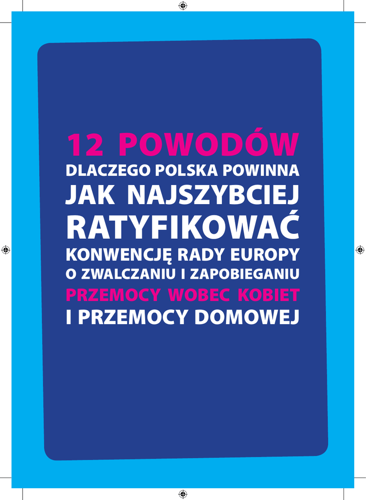 12 powodów DLACZEGO POLSKA POWINNA JAK NAJSZYBCIEJ RATYFIKOWAĆ KONWENCJĘ RADY EUROPY O ZWALCZANIU I ZAPOBIEGANIU PRZEMOCY WOBEC KOBIET I PRZEMOCY DOMOWEJ 1 2 3 4 Bo gdy dziewczyna zgłosi gwałt na randce, to usłyszy „A po coś tam lazła? Porządnych dziewczyn nikt nie gwałci”. Bo gdy dziewczynka poskarży się, że chłopak ją molestuje, usłyszy, że powinno jej się to podobać, a poza tym „chłopaki tak mają, muszą się wyszumieć”. Bo wciąż uczy się dziewczyny, jak mają uniknąć gwałtu, a nie chłopców, by nie gwałcili. Bo wciąż (także policja, pomoc społeczna, sądy, społeczeństwo) powiela się stereotypy, że za przemoc i gwałt nie jest winny gwałciciel, lecz kobieta – jej za krótka sukienka, zachowanie, alkohol. 5 6 Bo kościelni hierarchowie uważają, że to dzieci same pchają im się do łóżka! Bo w Polsce NIGDY nie było ogólnokrajowej kampanii przeciwko gwałtom i innym rodzajom przemocy seksualnej wobec kobiet. 7 8 9 10 11 12 Bo w partiach politycznych kobiety są bite i molestowane (np. ostatnia afera z pobiciem działaczki w SLD, film, na którym lider PiS molestuje pracownice). Bo 80% sprawców przemocy dostaje wyroki w zawieszeniu, co de facto sprawia, że są bezkarni. Bo samorządy dostały dodatkowe obowiązki w ramach ustawy antyprzemocowej, ale żadnych na to funduszy. Bo nie ma w Polsce ogólnokrajowego, całodobowego telefonu dla ofiar przemocy. Bo od 2005 roku nie było ani jednej ogólnopolskiej kampanii na temat przemocy wobec kobiet – grupy, która najczęściej doświadcza przemoc. Bo Konwencja zobowiązuje państwa do ochrony ofiar przemocy a nie sprawców! Domaganie się jak najszybszej ratyfikacji Konwencji i wcielania w życie zapisanych w niej zobowiązań, daje szansę na to, by Polska faktycznie chroniła ofiary przemocy a nie sprawców i by realnie przeciwdziałała zjawisku przemocy ze względu na płeć.