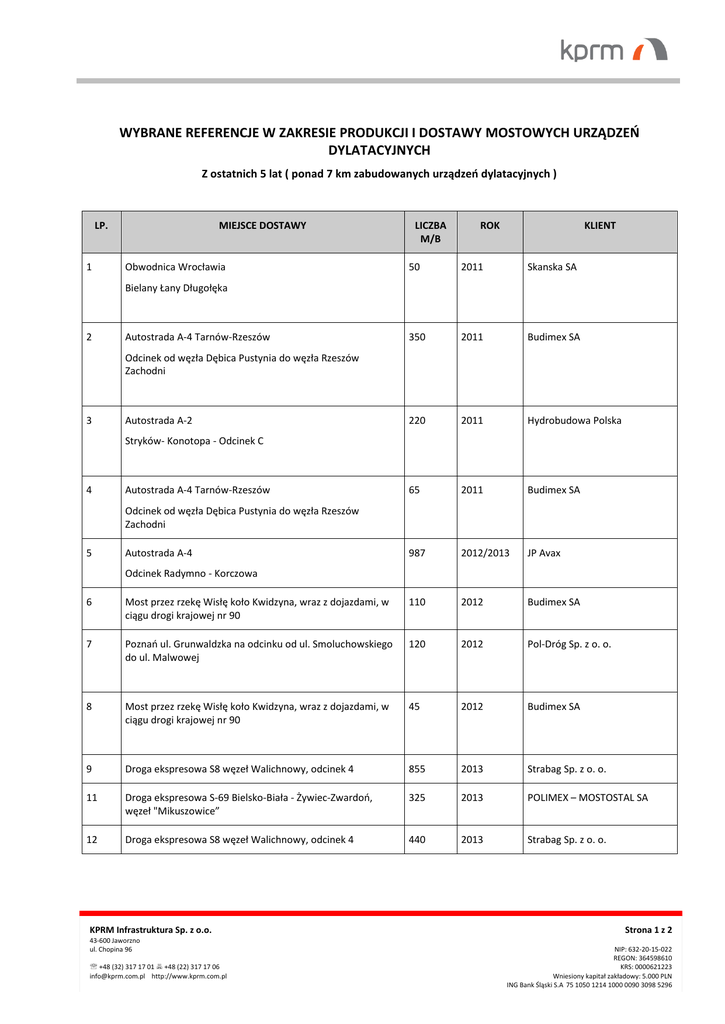 WYBRANE REFERENCJE W ZAKRESIE PRODUKCJI I DOSTAWY MOSTOWYCH URZĄDZEŃ DYLATACYJNYCH Z ostatnich 5 lat ( ponad 7 km zabudowanych urządzeń dylatacyjnych ) LP. 1 MIEJSCE DOSTAWY Obwodnica Wrocławia LICZBA M/B ROK KLIENT 50 2011 Skanska SA 350 2011 Budimex SA 220 2011 Hydrobudowa Polska 65 2011 Budimex SA 987 2012/2013 JP Avax Bielany Łany Długołęka 2 Autostrada A-4 Tarnów-Rzeszów Odcinek od węzła Dębica Pustynia do węzła Rzeszów Zachodni 3 Autostrada A-2 Stryków- Konotopa - Odcinek C 4 Autostrada A-4 Tarnów-Rzeszów Odcinek od węzła Dębica Pustynia do węzła Rzeszów Zachodni 5 Autostrada A-4 Odcinek Radymno - Korczowa 6 Most przez rzekę Wisłę koło Kwidzyna, wraz z dojazdami, w ciągu drogi krajowej nr 90 110 2012 Budimex SA 7 Poznań ul. Grunwaldzka na odcinku od ul. Smoluchowskiego do ul. Malwowej 120 2012 Pol-Dróg Sp. z o. o. 8 Most przez rzekę Wisłę koło Kwidzyna, wraz z dojazdami, w ciągu drogi krajowej nr 90 45 2012 Budimex SA 9 Droga ekspresowa S8 węzeł Walichnowy, odcinek 4 855 2013 Strabag Sp. z o. o. 11 Droga ekspresowa S-69 Bielsko-Biała - Żywiec-Zwardoń, węzeł "Mikuszowice” 325 2013 POLIMEX – MOSTOSTAL SA 12 Droga ekspresowa S8 węzeł Walichnowy, odcinek 4 440 2013 Strabag Sp. z o. o. KPRM Infrastruktura Sp. z o.o. 43-600 Jaworzno ul. Chopina 96 +48 (32) 317 17 01 +48 (22) 317 17 06 [email protected] http://www.kprm.com.pl Strona 1 z 2 NIP: 632-20-15-022 REGON: 364598610 KRS: 0000621223 Wniesiony kapitał zakładowy: 5.000 PLN ING Bank Śląski S.A 75 1050 1214 1000 0090 3098 5296 13 Węzeł komunikacyjny obwodnicy północnej (drogi krajowej) z 20 drogą wojewódzką nr 454 (ul. Budowlanych - Sobieskiego) 2013 SKANSKA S.A. 14 Linia kolejowa Kraków Zakopane odc. Stryszów Zembrzyce 104 2013/2014 SKANSKA S.A. 15 Drogowa Trasa Średnicowa Katowice Gliwice, część Zachów, docinek G1 505 2014 SKANSKA S.A. 16 Most na Wiśle w m. Kamień wraz z budową dróg dojazdowych (+-350mm) 40 2014 GOTOWSKI Budownictwo Komunikacyjne i Przemysłowe Sp. z o.o. / Energopol Szczecin SA 17 Autostrada A4 Rzeszów - Jarosław 732 2014/2015 Budimex SA 18 Autostrada A1 Stryków – Tuszyn 473 2015 Strabag Sp. z o. o. 19 Most Łazienkowski w Warszawie 159 2015 Intercor/Bilfinger 20 Obwodnica miasta Wielunia w ciągu DK nr S8 398 2015 Strabag Sp. z o. o. 21 Budowa Trasy Średnicowej Północnej w Toruniu 55 2015 SKANSKA S.A. 22 Most przez Kanał Bydgoski 34 2015 SKANSKA S.A. 23 Most na rzece Prośnie w Kaliszu 12 2015 SKANSKA S.A. 24 Budowa drogi ekspresowej S7 na terenie miasta Krakowa (tzw. „Trasy Nowohuckiej”) 590 2015 Strabag Sp. z o. o. 25 Budowa łącznicy kolejowej Kraków Zabłocie – Kraków Krzemionki Etap III 180 2016 Budimex SA 26 Modernizacja linii kolejowej Warszawa Łódź etap II, Lot B2 – odcinek Łódź Widzew – Łódź Fabryczna ze stacją Łódź Fabryczna 350 2016 Torpol S.A. 27 Budowa drogi ekspresowej S3 Nowa Sól – Legnica (A4), zadanie III od węzła Kaźmierzów do węzła Lubin Północ 62 2016 Export Pribex Sp. z o.o. 28 Modernizacja linii kolejowej E30/C-E30 odc. Kraków-Rzeszów, 32 etap III 2016 Intop Tarnobrzeg Sp. z o.o. 29 Budowa drogi ekspresowej S7 na odcinku Miłomłyn – Olsztynek w zakresie pododcinka „A” 36 2016 Budimex S.A 30 Budowa drogi ekspresowej S7 na odcinku Miłomłyn – Olsztynek w zakresie pododcinka „B” wraz z obwodnicą Ostródy w ciągu DK16 80 2016 Budimex S.A 31 Zaprojektowanie i wybudowanie drogi ekspresowej S5 Poznań Wrocław na odcinku Korzeńsko (bez węzła) – Węzeł Widawa Wrocław 615 2016 Dragados Strona 2 z 2