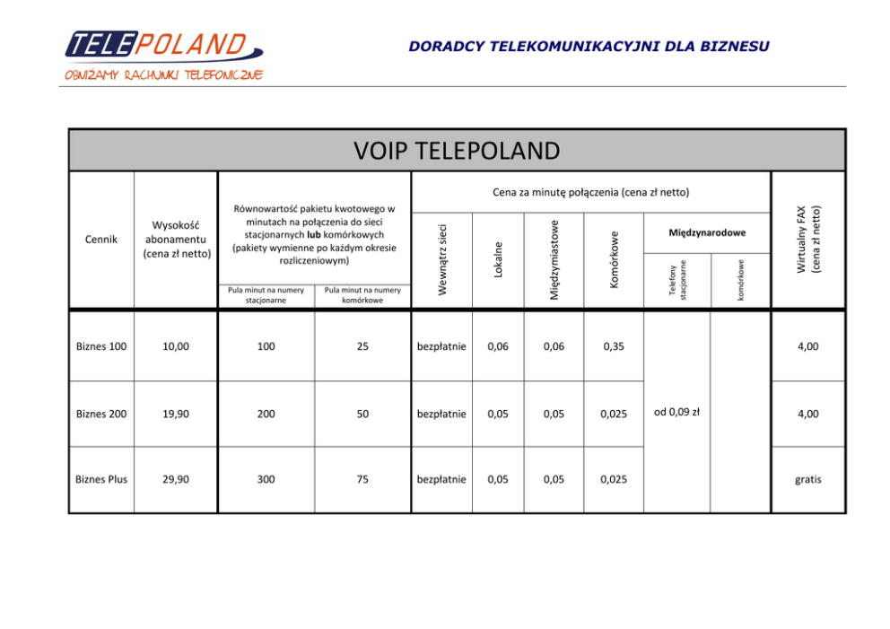 DORADCY TELEKOMUNIKACYJNI DLA BIZNESU VOIP TELEPOLAND Międzymiastowe Komórkowe 10,00 100 25 bezpłatnie 0,06 0,06 0,35 Biznes 200 19,90 200 50 bezpłatnie 0,05 0,05 0,025 Biznes Plus 29,90 300 75 bezpłatnie 0,05 0,05 0,025 Wysokość abonamentu (cena zł netto) Pula minut na numery stacjonarne Pula minut na numery komórkowe Międzynarodowe komórkowe Lokalne Biznes 100 Cennik Telefony stacjonarne Wewnątrz sieci Równowartość pakietu kwotowego w minutach na połączenia do sieci stacjonarnych lub komórkowych (pakiety wymienne po każdym okresie rozliczeniowym) Wirtualny FAX (cena zł netto) Cena za minutę połączenia (cena zł netto) 4,00 od 0,09 zł 4,00 gratis