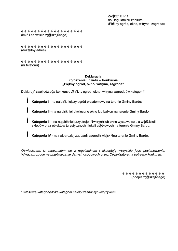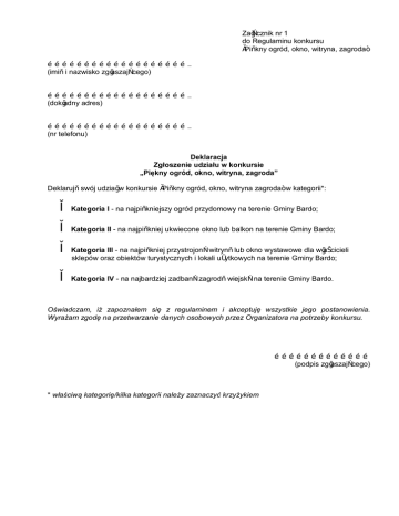 Załącznik nr 1 do Regulaminu konkursu „Piękny ogród, okno, witryna, zagroda” ………………………………………………….. (imię i nazwisko zgłaszającego) ………………………………………………….. (dokładny adres) ………………………………………………….. (nr telefonu) Deklaracja Zgłoszenie udziału w konkursie „Piękny ogród, okno, witryna, zagroda” Deklaruję swój udział w konkursie „Piękny ogród, okno, witryna zagroda” w kategorii*: □ Kategoria I - na najpiękniejszy ogród przydomowy na terenie Gminy Bardo; □ Kategoria II - na najpiękniej ukwiecone okno lub balkon na terenie Gminy Bardo; □ Kategoria III - na najpiękniej przystrojoną witrynę lub okno wystawowe dla właścicieli sklepów oraz obiektów turystycznych i lokali użytkowych na terenie Gminy Bardo; □ Kategoria IV - na najbardziej zadbaną zagrodę wiejską na terenie Gminy Bardo. Oświadczam, iż zapoznałem się z regulaminem i akceptuję wszystkie jego postanowienia. Wyrażam zgodę na przetwarzanie danych osobowych przez Organizatora na potrzeby konkursu. ………………………………… (podpis zgłaszającego) * właściwą kategorię/kilka kategorii należy zaznaczyć krzyżykiem