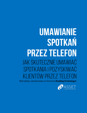 Warsztaty szkoleniowe w formule OneDayTraining© ----------------------------------------------------------------------------------------------------------------------------------------Specjalistyczne szkolenia i konsultacje biznesowe ASSET Business Development Sp. z o.o. Warsaw Financial Center, ul. Emilii Plater 53, 00-113 Warszawa tel: (+48 22) 101 39 74 , [email protected], www.asset.pl Warsztaty szkoleniowe w formule OneDayTraining© Podstawowym zadaniem telemarketera i jednym z elementów pracy przedstawiciela handlowego jest rozmowa telefoniczna z potencjalnym klientem, mająca na celu przedstawienie mu oferowanego produktu i umówienie się na spotkanie lub prezentację. Jednak wbrew pozorom może ona okazać się niezwykle trudna. Rozmówca może, na przykład, nie znać firmy, bądź od początku rozmowy być nastawiony negatywnie do osób dzwoniących z jakąkolwiek ofertą. Przekonanie go do naszych racji to prawdziwa sztuka. Telemarketer musi być przygotowany na różne scenariusze rozmów i powinien umieć odpowiednio reagować na zachowania rozmówcy. Szkolenie "Telemarketing - Pozyskiwanie Klientów" to rzetelne wprowadzenie w tajniki skutecznego pozyskiwania spotkań i nowych klientów przez telefon. Szkolenie powstało na podstawie praktycznych doświadczeń z prawie 15 lat szkoleń i coachingów, prowadzonych w działach CallCenter największych firm ze wszystkich praktycznie sektorów rynku. OneDayTraining© - dynamiczna formuła szkolenia dla ludzi ceniących czas, skoncentrowana na szybkim przekazaniu kluczowej wiedzy i najważniejszych umiejętności. Materiały dydaktyczne/podręcznik dokumentujące przekazaną wiedzę Testy i analizy własnych możliwości Imienny certyfikat ukończenia szkolenia Ćwiczenia indywidualne i zespołowe Elementy coachingu, Mindmapping Dyskusje i burze mózgów, studia przypadków Kwestionariusze i testy zachowań Czas trwania: 1 dzień Godzina: 09.30-16.00 Inwestycja zawiera: materiały szkoleniowe, przerwy kawowe, certyfikat Menadżer projektu: Anna Andruczyk, [email protected] ----------------------------------------------------------------------------------------------------------------------------------------Specjalistyczne szkolenia i konsultacje biznesowe ASSET Business Development Sp. z o.o. Warsaw Financial Center, ul. Emilii Plater 53, 00-113 Warszawa tel: (+48 22) 101 39 74 , [email protected], www.asset.pl WPROWADZENIE Spotkanie też trzeba sprzedać TWOJA OFERTA Co jest Twoim produktem, na jakie potrzeby odpowiada? Co odróżnia Cię od konkurentów? Kto jest Twoim klientem i jakie ma potrzeby? TWÓJ TOR PRZESZKÓD Jaki masz plan? Cold Calling to tylko jedna z metod JAK SIĘ PRZEBIĆ PRZEZ FIREWALL (20 SPRAWDZONYCH METOD) Traktuj sekretarkę jak... Życzliwość, wyrozumiałość - czy to działa? Niestandardowo "Złota godzina" Wywiad i wnioski Głos ALE CO MAM JEJ POWIEDZIEĆ? Nie ma jednej techniki, czyli testujemy wszystko JAK ROZMAWIAĆ Z DECYDENTEM (20 SKUTECZNCYH SPOSOBÓW) Sprzedaż spotkania przez telefon AIDA, SPIN, ESV - w kontakcie telefonicznym Wszyscy są egoistami Jak pytać o czas na rozmowę? Mów tak, jak pragnie Cię słyszeć klient Poszukaj drzwi, zamiast rozbijać mur głową Bądź przygotowany i profesjonalny Finalizacja i zakończenie rozmowy PODSUMOWANIE / ZAKOŃCZENIE NEUTRAL SCREEN PROCEDURE™ (METODA NEUTRALNEGO TŁA™) Aby nauczyć uczestników PRAKTYCZNYCH i konkretnych nawyków podczas szkolenia, wykorzystamy licencjonowaną metodę Neutral Screen Procedure™. Podczas omawianego szkolenia uczestnicy będą wykonywali telefony do rzeczywistych klientów. Do rozmów zostanie wykorzystany sprzęt audio do rozmów konferencyjnych/głośniki tak, aby wszyscy słyszeli zarówno "klienta", jak i osobę rozmawiającą. ----------------------------------------------------------------------------------------------------------------------------------------Specjalistyczne szkolenia i konsultacje biznesowe ASSET Business Development Sp. z o.o. Warsaw Financial Center, ul. Emilii Plater 53, 00-113 Warszawa tel: (+48 22) 101 39 74 , [email protected], www.asset.pl Dominik Frajberg. Charyzmatyczny trener, niezwykle skuteczny menadżer, inspirujący coach biznesowy. Uczestnicy szkoleń i spotkań opisują go jako: "...wyjątkowo kontaktowy, z ogromną wiedzą i doświadczeniem, ale też pełen humoru i dystansu do samego siebie...". Absolwent psychologii Uniwersytetu Jagiellońskiego. Psycholog biznesu, specjalista w dziedzinie motywacji, sprzedaży i marketingu. Od 10 lat zajmuje stanowiska kierownicze w zagranicznych i polskich firmach doradczych. Posiada ponad dziesięcioletnie doświadczenie w dziedzinie zarządzania personelem oraz zarządzania organizacją. Obecnie przygotowuje i realizuje międzynarodowe projekty z zakresu rozwoju zasobów ludzkich, organizacji i zarządzania. Jest członkiem rady programowej Europejskiego Stowarzyszenia Rozwoju Biznesu EBDA (European Business Development Association) oraz Instytutu Partnerstwa Publiczno Prywatnego IPPP. Autor ponad 200 programów szkoleń i publikacji, konsultant i Coach biznesowy. Obecnie zajmuje stanowisko: Prezes Zarządu Asset Business Development Sp. z o.o. (od 11 lat) Prezes Zarządu Instytutu Badań i Analiz Menadżerskich IBAM. (od 10 lat) Prezes Zarządu sieci kancelarii prawnych Avoué Polska Sp. z o.o. (od 3 lat) Posiada ponad 15 lat praktycznego doświadczenia zawodowego i prawie 400 osobiście realizowanych i nadzorowanych projektów doradczych, szkoleniowych i badawczych. AGORA AKZO – NOBEL NOBILES ALIOR BANK ALLIANZ AMBRA AMERSPORT ARAL POLSKA ASTER ATC CARGO AUCHAN POLSKA AXN BAKOMA BIOAGRA BNP PARIBAS BRITISH – AMERICAN TOBACCO POLSKA CABLE BULGARIA AD (BULGARIA) CADBURY POLAND CANAL+ POLSKA CARRIER CARLSBERG POLSKA CDM PEKAO SA CHANEL CITIBANK HANDLOWY CLOETTA (SWEDEN) COCA-COLA AMATIL (POLAND) CYFROWY POLSAT DEICHMANN DUKA POLSKA DIOR ENERGIS POLSKA FABRYKA NARZĘDZI FANAR FEDEX POLSKA GAWEX MEDIA GAZETAPRACA.PL GRUPA ATLA