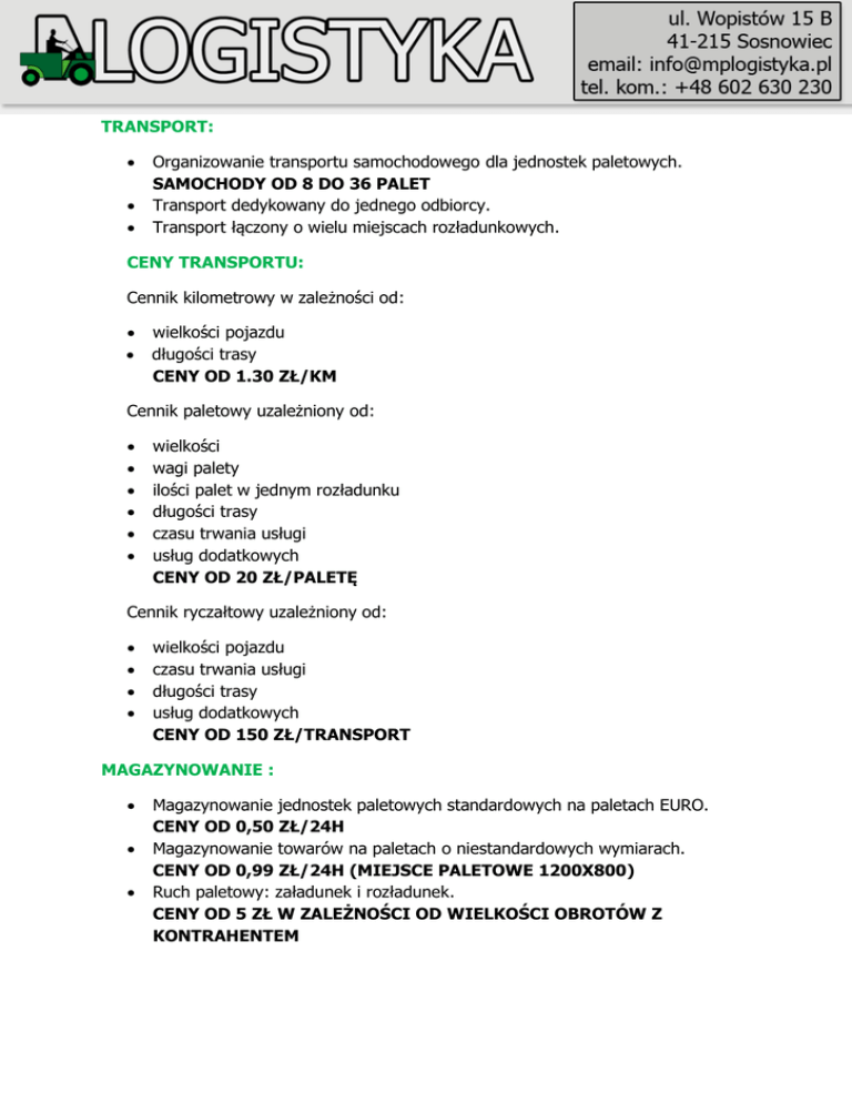 TRANSPORT: Organizowanie transportu samochodowego dla jednostek paletowych. SAMOCHODY OD 8 DO 36 PALET Transport dedykowany do jednego odbiorcy. Transport łączony o wielu miejscach rozładunkowych. CENY TRANSPORTU: Cennik kilometrowy w zależności od: wielkości pojazdu długości trasy CENY OD 1.30 ZŁ/KM Cennik paletowy uzależniony od: wielkości wagi palety ilości palet w jednym rozładunku długości trasy czasu trwania usługi usług dodatkowych CENY OD 20 ZŁ/PALETĘ Cennik ryczałtowy uzależniony od: wielkości pojazdu czasu trwania usługi długości trasy usług dodatkowych CENY OD 150 ZŁ/TRANSPORT MAGAZYNOWANIE : Magazynowanie jednostek paletowych standardowych na paletach EURO. CENY OD 0,50 ZŁ/24H Magazynowanie towarów na paletach o niestandardowych wymiarach. CENY OD 0,99 ZŁ/24H (MIEJSCE PALETOWE 1200X800) Ruch paletowy: załadunek i rozładunek. CENY OD 5 ZŁ W ZALEŻNOŚCI OD WIELKOŚCI OBROTÓW Z KONTRAHENTEM PRZECHOWYWANIE PRZEDMIOTÓW: Usługa obejmuje wypożyczenie jednostki opakowaniowo/paletowej 1200x800x800mm. CENY OD 40 ZŁ/MIESIĄC, 100 ZŁ/KWARTAŁ, 350 ZŁ/ROK Możliwość zapakowania i rozpakowania jednostki w osobnych pomieszczeniach. Ruch paletowy. CENY OD 10 ZŁ/JEDNOSTKĘ Ubezpieczenie dodatkowe powierzonych przedmiotów. Utylizacja zbędnych przedmiotów. PAKOWANIE PRODUKTÓW: Możliwość spakowania produktów nie posiadających opakowania jednostkowego, np.: o workowanie, o torebkowanie, o saszetkowanie produktów sypkich. Pakowanie i przepakowanie opakowań jednostkowych i zbiorczych. Kompletowanie jednostek i znakowanie produktów. Paletyzowanie produktów. CENY INDYWIDUALNE DLA KAŻDEGO KONTRAKTU. UPUSTY UZALEŻNIONE OD WIELKOŚCI KONTRAKTÓW I DŁUGOŚCI WSPÓŁPRACY KONFEKCJONOWANIE DOSTAW: Zmagazynowane palety dostarczone w jednym czasie wysyłamy w różne miejsca w różnym czasie według zamówienia zleceniodawcy. Przyjmowanie na magazyn pojedynczych palet i wysyłanie ich jednym transportem. Usługi dodatkowe wymagane przez klienta. CENY JAK PRZY MAGAZYNOWANIU I TRANSPORCIE KONFEKCJONOWANIE PALET: Układanie na jednej palecie towarów z innych palet. Zmiany etykiet. Zabezpieczanie palet. Usługi dodatkowe wymagane przez klienta. CENNY INDYWIDUALNE ZALEŻNE OD ILOŚCI TOWARU NA PALECIE, WIELKOŚCI KONTRAKTU I USŁUG DODATKOWYCH. KONFEKCJONOWANIE PACZEK: Pakowanie w paczki towarów wg specyfikacji zleceniodawcy. Wysyłanie paczek. CENY W ZALEŻNOŚCI OD: o WIELKOŚCI I ILOŚCI PACZEK o WARTOŚCI PACZEK o SUMY UBEZPIECZENIA o INNYCH WARUNKÓW USŁUGI o WIELKOŚCI USŁUG DODATKOWYCH USŁUGI DODATKOWE: Usługi dodatkowe ustalane indywidualnie. CENY ZA USŁUGI DODATKOWE USTALANE Z KLIENTEM Jeśli macie Państwo jakiekolwiek pytania - prosimy o kontakt Artur Bujoczek tel. +48 602 630 230 [email protected]