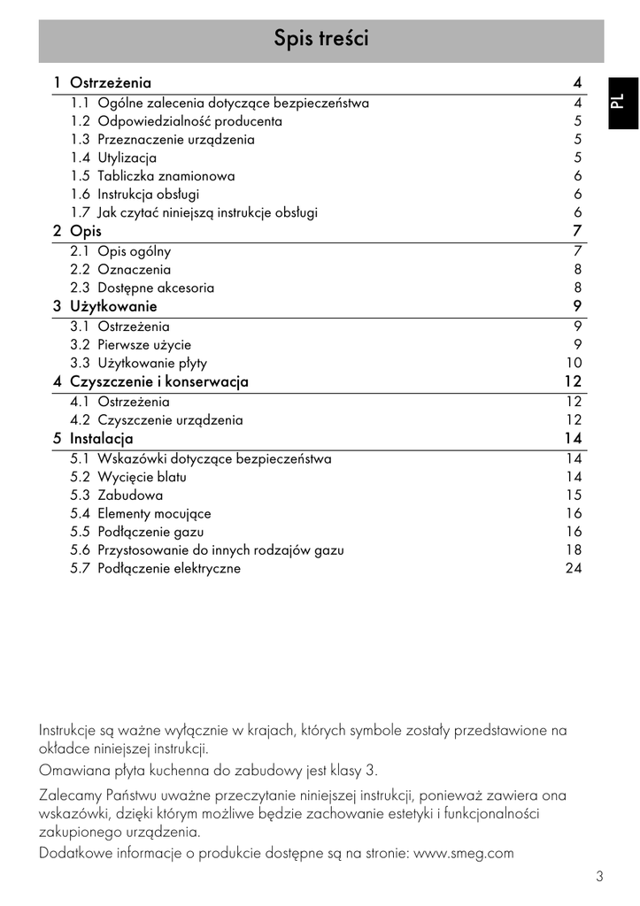 Spis treści 1.1 1.2 1.3 1.4 1.5 1.6 1.7 4 Ogólne zalecenia dotyczące bezpieczeństwa Odpowiedzialność producenta Przeznaczenie urządzenia Utylizacja Tabliczka znamionowa Instrukcja obsługi Jak czytać niniejszą instrukcje obsługi 4 5 5 5 6 6 6 2 Opis 7 2.1 Opis ogólny 2.2 Oznaczenia 2.3 Dostępne akcesoria 7 8 8 3 Użytkowanie 3.1 Ostrzeżenia 3.2 Pierwsze użycie 3.3 Użytkowanie płyty 4 Czyszczenie i konserwacja 4.1 Ostrzeżenia 4.2 Czyszczenie urządzenia 5 Instalacja 5.1 5.2 5.3 5.4 5.5 5.6 5.7 Wskazówki dotyczące bezpieczeństwa Wycięcie blatu Zabudowa Elementy mocujące Podłączenie gazu Przystosowanie do innych rodzajów gazu Podłączenie elektryczne PL 1 Ostrzeżenia 9 9 9 10 12 12 12 14 14 14 15 16 16 18 24 Instrukcje są ważne wyłącznie w krajach, których symbole zostały przedstawione na okładce niniejszej instrukcji. Omawiana płyta kuchenna do zabudowy jest klasy 3. Zalecamy Państwu uważne przeczytanie niniejszej instrukcji, ponieważ zawiera ona wskazówki, dzięki którym możliwe będzie zachowanie estetyki i funkcjonalności zakupionego urządzenia. Dodatkowe informacje o produkcie dostępne są na stronie: www.smeg.com 3 Ostrzeżenia 1 Ostrzeżenia 1.1 Ogólne zalecenia dotyczące bezpieczeństwa Obrażenia na osobach • Urządzenie i jego elementy są bardzo gorące podczas użytkowania. • Podczas użytkowania nie należy dotykać elementów grzejnych. • Dzieci poniżej 8 roku życia nie powinny przebywać w pobliżu urządzenia bez opieki osoby dorosłej. • Urządzenie nie służy do zabawy. • Podczas użytkowania nie kłaść na urządzeniu metalowych przedmiotów takich, jak widelce, łyżki i pokrywki. • Po zakończeniu użytkowania wyłączyć urządzenie. • Nie należy nigdy próbować gasić płomienia lub pożaru wodą: wyłączyć urządzenie i nakryć płomień pokrywą lub ognioodporną narzutą. • Czynności związane z czyszczeniem i konserwacją nie powinny być wykonywane przez dzieci bez nadzoru. • Instalacja i naprawy powinny być wykonywane przez wykwalifikowany personel zgodnie z obowiązującymi przepisami. • Nie wprowadzać zmian na urządzeniu. 4 • Nie wkładać ostro zakończonych metalowych przedmiotów (sztućce lub przyrządy) do szczelin. • Nigdy nie próbować naprawiać urządzenia samodzielnie lub bez pomocy wykwalifikowanego specjalisty. • Jeśli przewód zasilania elektrycznego jest uszkodzony, należy natychmiast skontaktować się z serwisem technicznym, który dokona jego wymiany. Uszkodzenie urządzenia • Nie stosować ściernych lub agresywnych detergentów (np. produktów z granulkami, odplamiaczy i gąbek metalowych) na częściach szklanych. • Ewentualnie używać drewnianych lub plastikowych narzędzi. • Nie siadać na urządzeniu. • Nie stosować pary do czyszczenia urządzenia. • Nie zatykać otworów, szczelin wentylacyjnych i odprowadzających ciepło. • Nie zostawiać urządzenia bez nadzoru podczas pieczenia potraw, które mogą wydzielać tłuszcz lub olej. • Nie zostawiać przedmiotów na powierzchniach pieczenia. • W żadnym razie nie używać urządzenia do ogrzewania pomieszczeń. Ostrzeżenia Producent nie ponosi żadnej odpowiedzialności za szkody osobowe lub rzeczowe powstałe w wyniku: • użycia urządzenia w sposób niezgodny z przeznaczeniem, • nieprzestrzegania zaleceń zawartych w instrukcji użytkowania, • naruszenia chociaż jednej części urządzenia, • używania nieoryginalnych części zamiennych. 1.3 Przeznaczenie urządzenia Urządzenie jest przeznaczone do pieczenia potraw w warunkach domowych. Każde inne użycie jest nieprawidłowe. Urządzenie nie może być używane przez osoby (w tym dzieci) o ograniczonych zdolnościach psychofizycznych lub nieposiadające odpowiedniego doświadczenia lub wiedzy, chyba że będzie się to odbywać pod kontrolą osób dorosłych odpowiedzialnych za ich bezpieczeństwo. 1.4 Utylizacja Urządzenie należy poddać utylizacji oddzielnie od innych odpadów (dyrektywy 2002/95/ WE, 2002/96/WE, 2003/108/WE). Urządzenie nie zawiera substancji w ilości niebezpiecznej dla zdrowia i środowiska, zgodnie z aktualnymi dyrektywami europejskimi. Aby dokonać utylizacji urządzenia należy: PL 1.2 Odpowiedzialność producenta Napięcie elektryczne Niebezpieczeństwo porażenia prądem • Odłączyć główne zasilanie elektryczne. • Odłączyć przewód zasilający od instalacji elektrycznej. • Odłączyć przewód zasilania elektrycznego i usunąć go razem z wtyczką. • Powierzyć urządzenie odpowiednim centrom selektywnej zbiórki odpadów elektrycznych i elektronicznych lub oddać sprzedawcy w momencie zakupu podobnego urządzenia. Opakowanie urządzenia zostało wykonane z materiałów, które nie zanieczyszczają środowiska i nadają się do recyklingu. • Materiały z opakowania należy oddać do odpowiednich punktów selektywnej zbiórki odpadów. Opakowania z tworzyw sztucznych Niebezpieczeństwo uduszenia się • Nie pozostawiać opakowania i jego elementów bez nadzoru. • Dzieci nie powinny bawić się plastikowymi torebkami z opakowania. 5 Ostrzeżenia 1.5 Tabliczka znamionowa Tabliczka znamionowa zawiera dane techniczne, numer seryjny i oznaczenie. Nie wolno zdejmować tabliczki znamionowej. 1.6 Instrukcja obsługi Niniejsza instrukcja stanowi integralną część urządzenia i powinna być przechowywana w całości oraz w zasięgu ręki użytkownika przez cały okres eksploatacji urządzenia. Przed użyciem urządzenia należy uważnie przeczytać niniejszą instrukcję obsługi. 1.7 Jak czytać niniejszą instrukcje obsługi W instrukcji zastosowano następujące symbole ułatwiające czytanie: Ostrzeżenia Ogólne informacje dotyczące podręcznika, bezpieczeństwa i końcowej utylizacji. Opis Opis urządzenia i akcesoriów. Użytkowanie Informacje o użytkowaniu urządzenia i akcesoriów, porady dotyczące pieczenia. Czyszczenie i konserwacja Informacje o prawidłowym czyszcz