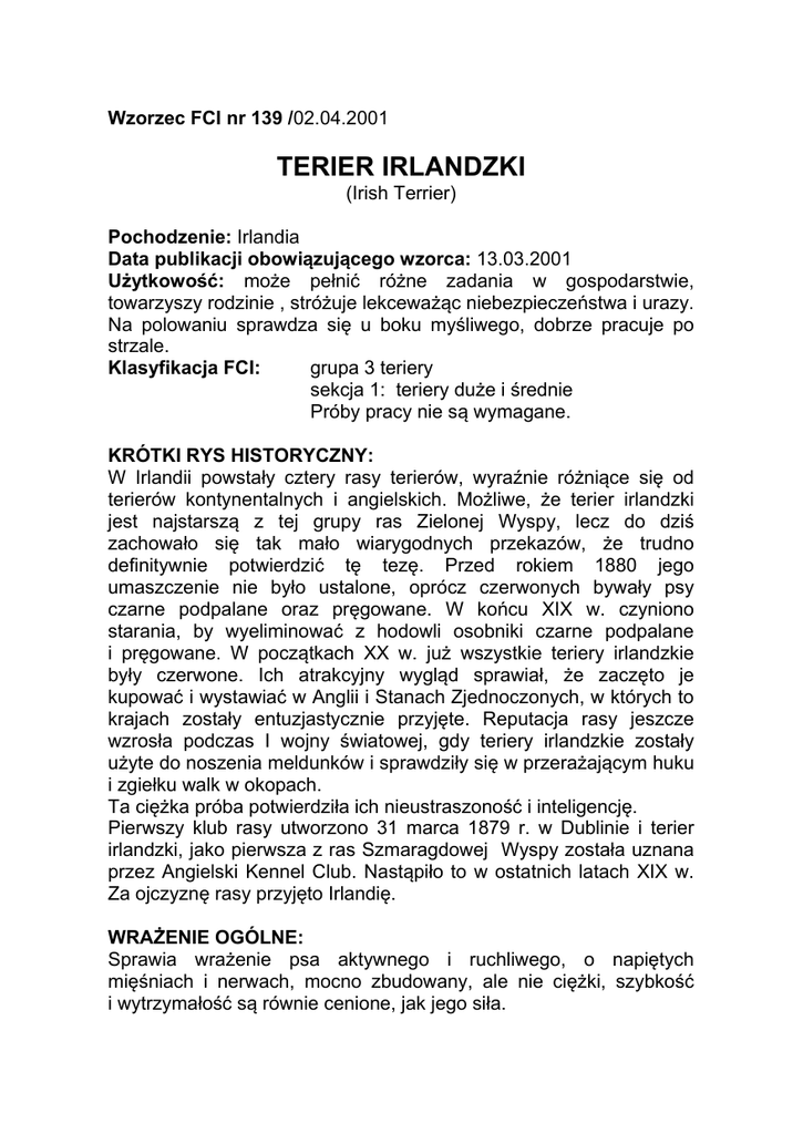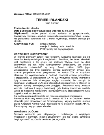 Wzorzec FCI nr 139 /02.04.2001 TERIER IRLANDZKI (Irish Terrier) Pochodzenie: Irlandia Data publikacji obowiązującego wzorca: 13.03.2001 Użytkowość: może pełnić różne zadania w gospodarstwie, towarzyszy rodzinie , stróżuje lekceważąc niebezpieczeństwa i urazy. Na polowaniu sprawdza się u boku myśliwego, dobrze pracuje po strzale. Klasyfikacja FCI: grupa 3 teriery sekcja 1: teriery duże i średnie Próby pracy nie są wymagane. KRÓTKI RYS HISTORYCZNY: W Irlandii powstały cztery rasy terierów, wyraźnie różniące się od terierów kontynentalnych i angielskich. Możliwe, że terier irlandzki jest najstarszą z tej grupy ras Zielonej Wyspy, lecz do dziś zachowało się tak mało wiarygodnych przekazów, że trudno definitywnie potwierdzić tę tezę. Przed rokiem 1880 jego umaszczenie nie było ustalone, oprócz czerwonych bywały psy czarne podpalane oraz pręgowane. W końcu XIX w. czyniono starania, by wyeliminować z hodowli osobniki czarne podpalane i pręgowane. W początkach XX w. już wszystkie teriery irlandzkie były czerwone. Ich atrakcyjny wygląd sprawiał, że zaczęto je kupować i wystawiać w Anglii i Stanach Zjednoczonych, w których to krajach zostały entuzjastycznie przyjęte. Reputacja rasy jeszcze wzrosła podczas I wojny światowej, gdy teriery irlandzkie zostały użyte do noszenia meldunków i sprawdziły się w przerażającym huku i zgiełku walk w okopach. Ta ciężka próba potwierdziła ich nieustraszoność i inteligencję. Pierwszy klub rasy utworzono 31 marca 1879 r. w Dublinie i terier irlandzki, jako pierwsza z ras Szmaragdowej Wyspy została uznana przez Angielski Kennel Club. Nastąpiło to w ostatnich latach XIX w. Za ojczyznę rasy przyjęto Irlandię. WRAŻENIE OGÓLNE: Sprawia wrażenie psa aktywnego i ruchliwego, o napiętych mięśniach i nerwach, mocno zbudowany, ale nie ciężki, szybkość i wytrzymałość są równie cenione, jak jego siła. Sylwetka nie może być niezgrabna i przysadzista, jest elegancka i pełna wdzięku . ZACHOWANIE/CHARAKTER: Pojętny i stanowczy, żyje w zgodzie z innymi psami, wyjątkowo wierny. Ma dobry charakter i jest przymilny wobec ludzi, ale jeśli zaatakuje, jest odważny jak lew i walczy do końca. Niesprawiedliwa jest opinia jakoby psy te były zaczepne i nawet w ringu wystawowym wywoływały awantury. Gdy wymagają tego okoliczności, terier irlandzki okazuje się odważny i zdecydowany. Uczy się łatwo i jest łagodnym kompanem, w pełni zasługującym na określenie: ”stróż człowieka ubogiego, przyjaciel chłopa i ulubieniec dżentelmena”. GŁOWA: Długa, bez zmarszczek. Mózgoczaszka: płaska i dosyć wąska między uszami, lekko zwęża się ku oczom. Stop ledwo widoczny, tylko z profilu. Trzewioczaszka: Trufla nosowa: powinna być czarna. Wargi: przylegające, a ich zewnętrzna strona jest prawie czarna. Szczęka i żuchwa równej długości. Mocne, muskularne , by zapewnić niezawodny chwyt. Uzębienie: mocne, regularne i zdrowe. Siekacze szczęki ciasno przykrywają siekacze żuchwy. Policzki: nie za pełne, powinny pod oczami lekko się zapadać, ale nie tak by, głowa przypominała greyhounda. Oczy: ciemnej barwy, małe, nie wyłupiaste, pełne życia, ognia i inteligencji. Oczy żółte lub jasne są uważane za dużą wadę. Uszy: małe, w kształcie litery „V”, średniej grubości, dobrze osadzone na głowie i opadające blisko policzków ku przodowi. Górna linia zagięcie ucha powinno znajdować się wyraźnie ponad wierzchem czaszki. Ucho opadające na boki głowy, jak u psa gończego, nie jest typowe dla teriera irlandzkiego, ucho półstojące jest jeszcze bardziej niepożądane. Sierść na uszach winna być krótka i ciemniejsza niż na tułowiu. SZYJA: Ma być dobrej długości i rozszerzać się stopniowo ku łopatkom, powinna być dobrze noszona i sucha (bez podgardla). Po obu jej stronach ciągną nasady uszu. się pasma dłuższego włosa, sięgające prawie TYŁÓW: Proporcjonalny, ani zbyt długi, ani zbyt krótki. Grzbiet : mocny i prosty, za łopatkami nie powinno być śladu wklęśnięcia, słabości. Lędźwie: umięśnione i nieznacznie wypukłe. Suka jest nieco dłuższa w partii lędźwiowej od samca. Klatka piersiowa: głęboka i umięśniona, ale nie szeroka, o pełnym obrysie. Żebra są dość dobrze zaokrąglone, raczej długie niż szeroko rozstawione, daleko zachodzące do tyłu. OGON: Powinien być osadzony dość wysoko, radośnie noszony, ale nie zakręcony ponad grzbietem. Wystarczającej grubości, mocny i dość długi. Zwyczajowo ogon jest kopiowany tak, że pozostawia się 2/3 jego całości. Jest on pokryty szorstką sierścią, nie ma na nim frędzli ani długich włosów. Może być pozostawiony w stanie naturalnym w krajach, gdzie prawo zakazuje dokonywania zabiegów kopiowania. KOŃCZYNY: Tak przednie jak i tylne powinny w ruchu kierować się prosto do przodu. Kończyny przednie:. Łopatki widoczne w rysunku, długie i skośne. Łokcie pracują swobodnie po obu stronach tułowia. Przedramiona: średniej długości, idealnie proste o mocnej kości. Śródręcza krótkie i proste, mało uwidocznione nadgarstki. Kończyny tylne powinny być mocne i umięśnione. Uda silne Stawy kolanowe o średnim kątowaniu. Stawy skokowe nisko położone. Łapy mocne, możliwie okrągłe, średniej wielkości. Wysklepione palce nie kierują się ani do wewnątrz, ani na zewnątrz. Cenione są czarne pazury. Opuszki zdrowe, bez zrogowaciałych narośli i spękań. RUCH: Kończyny przednie i tylne poruszają się równolegle i prosto ku przodowi. Łokcie pracują po osi tułowia swobodnie, bez przeszkód. Stawy skokowe nie kierują się ani na zewnątrz, ani do wewnątrz. OKRYWA WŁOSOWA: Sierść powinna być gęsta i twarda, drutowata, ostra, ale płasko przylegająca. Sierść jest tak gęsta, że kiedy ją przeczesujemy palcami, nie powinno być widać skóry. Włos nie może być miękki i jedwabisty. Jest niezbyt długi, tak by nie tu
