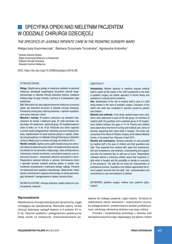 SPECYFIKA OPIEKI NAD NIELETNIM PACJENTEM W ODDZIALE CHIRURGII DZIECIĘCEJ THE SPECIFICS OF JUVENILE PATIENTS’ CARE IN THE PEDIATRIC SURGERY WARD Małgorzata Kazimierczak1, Barbara Grzymała-Turzańska2, Agnieszka Kobiołka1 1 Katedra Zdrowia Kobiety Śląski Uniwersytet Medyczny w Katowicach 2 Oddział Chirurgii Dziecięcej Gliwickie Centrum Medyczne DOI: http://dx.doi.org/10.20883/pielpol.2016.38 STRESZCZENIE ABSTRACT Wstęp. Współczesny postęp w medycynie nakłada na personel medyczny obowiązek zaspokajania wszystkich potrzeb hospitalizowanego w oddziale chirurgii dziecięcej dziecka, podejścia holistycznego do jego choroby i pomocy w rozwiązywaniu jego problemów. Cel. Wskazanie roli, jaką odgrywa personel medyczny w procesie opieki nad dzieckiem leczonym w oddziale chirurgii dziecięcej. Porównano ocenę pracy własnej personelu z opiniami wystawionymi przez rodziców i dzieci. Materiał i metody. W badaniu posłużono się ankietami skierowanymi do każdej z badanych grup: 24 osób personelu medycznego, 63 opiekunów i wybranej grupy 33 hospitalizowanych dzieci w wieku od 14 do 18 lat. Rodziców oraz dzieci zapytano o poziom opieki pielęgniarskiej i lekarskiej, poczucie bezpieczeństwa, respektowanie ich praw podczas pobytu w szpitalu. Badanie przeprowadzono na Oddziale Chirurgii Dziecięcej w Gliwickim Centrum Medycznym w okresie od lutego do kwietnia 2015 r. Wyniki i wnioski. Ogólna ocena opieki świadczonej przez personel medyczny dokonana przez dzieci i ich opiekunów była wysoka. Oczekiwali oni od personelu medycznego, obok profesjonalizmu i fachowości, również życzliwości, zrozumienia i wsparcia, a po zakończeniu leczenia – wskazówek odnośnie samoopieki w domu. Respondenci wskazali deficyty w zakresie informowania dzieci o sposobie leczenia, prawach podczas pobytu w szpitalu oraz możliwości decydowania o wykonaniu danego zabiegu. Personel nie wykazywał cech wypalenia zawodowego. Opiekunowie i dzieci wysoko ocenili poziom wsparcia otrzymanego ze strony personelu, jego fachowość i zaangażowanie w opiekę i leczenie dzieci. Introduction. Modern advance in medicine requires medical staff to satisfy all the needs of the child hospitalized in the ward of pediatric surgery, the holistic approach to his/her illness and assistance in solving his/her problems. Aim. Identification of the role of medical staff in care of a child being treated in the ward of pediatric surgery. Evaluation of the staff’s own work was compared to opinions issued by parents and children. Material and methods. In the study, questionnaires were used, which were addressed to each of the test group: 24 members of medical staff, 63 guardians and a selected group of 33 hospitalized children between the ages of 14–18. Parents and children were asked about the level of nursing and medical care, sense of security, respecting their rights while in hospital. The study was conducted at the Ward of Pediatric Surgery at the Gliwice Medical Center, in the period from February to April 2015. Results and conclusions. General evaluation of care provided by medical staff in the eyes of children and their guardians was high. They expected from medical staff, apart from professionalism and competence, also kindness, understanding and support, and after the treatment tips on self-care at home. Respondents indicated deficits in informing children about their treatment, rights while in hospital and the possibility to decide on execution of the procedure. The staff did not show the characteristics of professional burnout. Guardians and children appreciated the level of support received from the staff, their professionalism and commitment to care and treatment of children. SŁOWA KLUCZOWE: chirurgia dziecięca, opieka medyczna, prawa pacjenta, wsparcie. KEYWORDS: pediatric surgery, medical care, patient’s rights, support. Wprowadzenie Współczesna chirurgia dziecięca jest dynamiczną, ciągle rozwijającą się specjalnością. Niezwykle prężny rozwój chirurgii dziecięcej nastąpił dopiero w II połowie XX w. [1–3]. Obecnie pediatria i pielęgniarstwo pediatryczne kładą nacisk na holistyczne, zindywidualizowane po- PIELĘGNIARSTWO POLSKIE NR 3 (61) 2016 dejście do małego pacjenta i jego rodziny. Oznacza to realizowanie zleceń lekarskich i wykonywanie czynności pielęgniarskich, podejmowanie działań profilaktycznych, edukację zdrowotną dziecka oraz jego rodziny. Choroba i hospitalizacja powodują u dziecka stan obciążenia psychicznego objawiający się lękiem, bólem PRACA ORYGINALNA 403 i ograniczeniem aktywności. W przypadku małych dzieci specyficznym źródłem lęku jest rozłąka z matką – lęk separacyjny. Dużym obciążeniem psychicznym jest ból. Często pojawiają się brak apetytu, rozdrażnienie, wybuchy złości i zaburzenia snu [4–6]. Pobyt na oddziale chirurgicznym wiąże się również z koniecznością częstego wykonywania bolesnych zabiegów. Wzbudzają one poczucie zagrożenia, uczucie gniewu, co prowadzi do biernego czy czynnego protestu. Obserwujemy także u dzieci zupełny brak apetytu, trudności z zasypianiem, budzenie się w nocy, a u dzieci starszych – moczenie nocne [5, 7]. Czasami długotrwała hospitalizacja ma dla rozwoju dziecka poważne konsekwencje w postaci tzw. choroby szpitalnej, która jest odmianą choroby sierocej [4, 6, 8]. Działania osób opiekujących się dzieckiem muszą być ukierunkowane na zaspokojenie podstawowej potrzeby psychicznej, jaką jest potrzeba bezpieczeństwa. Należy pamiętać, że prawa dziecka są naturalną konsekwencją praw człowieka. Dziecko ma godność, potrzeby, zainteresowania i prawa [1, 5, 9, 10]. W trakcie pobytu dziecka w szpitalu opiekun ma prawo do przebywania z nim, uczestniczenia w podejmowaniu decyzji o leczeniu, w tym prawo do odmowy zgody na leczenie czy zabieg operacyjny. Opiekun ma również prawo do obecności przy dziecku w trakcie udzielania świadczeń zdrowotnych. Personel może s