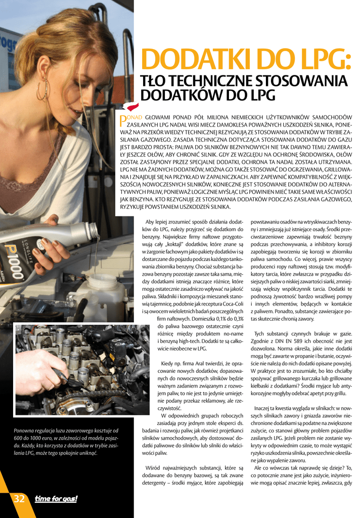 DODATKI DO LPG: TŁO TECHNICZNE STOSOWANIA DODATKÓW DO LPG P ONAD GŁOWAMI PONAD PÓŁ MILIONA NIEMIECKICH UŻYTKOWNIKÓW SAMOCHODÓW ZASILANYCH LPG NADAL WISI MIECZ DAMOKLESA POWAŻNYCH USZKODZEŃ SILNIKA, PONIEWAŻ NA PRZEKÓR WIEDZY TECHNICZNEJ REZYGNUJĄ ZE STOSOWANIA DODATKÓW W TRYBIE ZASILANIA GAZOWEGO. ZASADA TECHNICZNA DOTYCZĄCA STOSOWANIA DODATKÓW DO GAZU JEST BARDZO PROSTA: PALIWA DO SILNIKÓW BEZNYNOWYCH NIE TAK DAWNO TEMU ZAWIERAŁY JESZCZE OŁÓW, ABY CHRONIĆ SILNIK. GDY ZE WZGLĘDU NA OCHRONĘ ŚRODOWISKA, OŁÓW ZOSTAŁ ZASTĄPIONY PRZEZ SPECJALNE DODATKI, OCHRONA TA NADAL ZOSTAŁA UTRZYMANA. LPG NIE MA ŻADNYCH DODATKÓW, MOŻNA GO TAKŻE STOSOWAĆ DO OGRZEWANIA, GRILLOWANIA I ZNAJDUJE SIĘ NA PRZYKŁAD W ZAPALNICZKACH. ABY ZAPEWNIĆ KOMPATYBILNOŚĆ Z WIĘKSZOŚCIĄ NOWOCZESNYCH SILNIKÓW, KONIECZNE JEST STOSOWANIE DODATKÓW DO ALTERNATYWNYCH PALIW, PONIEWAŻ LOGICZNIE MYŚLĄC LPG POWINIEN MIEĆ TAKIE SAME WŁAŚCIWOŚCI JAK BENZYNA. KTO REZYGNUJE ZE STOSOWANIA DODATKÓW PODCZAS ZASILANIA GAZOWEGO, RYZYKUJE POWSTANIEM USZKODZEŃ SILNIKA. Aby lepiej zrozumieć sposób działania dodatków do LPG, należy przyjrzeć się dodatkom do benzyny. Największe firmy naftowe przygotowują cały „koktajl” dodatków, które znane są w żargonie fachowym jako pakiety dodatków i są dostarczane do pojazdu podczas każdego tankowania zbiornika benzyny. Chociaż substancja bazowa benzyny pozostaje zawsze taka sama, między dodatkami istnieją znaczące różnice, które mogą ostatecznie zasadniczo wpływać na jakość paliwa. Składniki i kompozycja mieszanek stanowią tajemnicę, podobnie jak receptura Coca-Coli i są owocem wieloletnich badań poszczególnych firm naftowych. Domieszka 0,1% do 0,3% do paliwa bazowego ostatecznie czyni różnicę między produktem no-name i benzyną high-tech. Dodatki te są całkowicie nieobecne w LPG. Ponowna regulacja luzu zaworowego kosztuje od 600 do 1000 euro, w zależności od modelu pojazdu. Każdy, kto korzysta z dodatków w trybie zasilania LPG, może tego spokojnie uniknąć. Kiedy np. firma Aral twierdzi, że opracowanie nowych dodatków, dopasowanych do nowoczesnych silników będzie ważnym zadaniem związanym z rozwojem paliw, to nie jest to jedynie umiejętnie podany przekaz reklamowy, ale rzeczywistość. W odpowiednich grupach roboczych zasiadają przy jednym stole eksperci ds. badania i rozwoju paliw, jak również projetkanci silników samochodowych, aby dostosować dodatki paliwowe do silników lub silniki do właściwości paliw. Wśród najważniejszych substancji, które są dodawane do benzyny bazowej, są tak zwane detergenty – środki myjące, które zapobiegają 32 powstawaniu osadów na wtryskiwaczach benzyny i zmniejszają już istniejące osady. Środki przeciwstarzeniowe zapewniają trwałość beznyny podczas przechowywania, a inhibitory korozji zapobiegają tworzeniu się korozji w zbiorniku paliwa samochodu. Co więcej, prawie wszyscy producenci ropy naftowej stosują tzw. modyfikatory tarcia, które zwłaszcza w przypadku dzisiejszych paliw o niskiej zawartości siarki, zmniejszają większy współczynnik tarcia. Dodatki te podnoszą żywotność bardzo wrażliwej pompy i innych elementów, będących w kontakcie z paliwem. Ponadto, substancje zawierające potas skutecznie chronią zawory. Tych substancji czynnych brakuje w gazie. Zgodnie z DIN EN 589 ich obecność nie jest dozwolona. Norma określa, jakie inne dodatki mogą być zawarte w propanie i butanie, oczywiście nie należą do nich dodatki opisane powyżej. W praktyce jest to zrozumiałe, bo kto chciałby spożywać grillowanego kurczaka lub grillowane kiełbaski z dodatkami? Środki myjące lub antykorozyjne mogłyby odebrać apetyt przy grillu. Inaczej ta kwestia wygląda w silnikach: w nowszych silnikach zawory i gniazda zaworów niechronione dodatkami są podatne na zwiększone zużycie, co stanowi główny problem pojazdów zasilanych LPG. Jeżeli problem nie zostanie wykryty w odpowiednim czasie, to może wystąpić ryzyko uszkodzenia silnika, powszechnie określane jako wypalenie zaworu. Ale co wówczas tak naprawdę się dzieje? To, co potocznie znane jest jako zużycie, inżynierowie mogą opisać znacznie lepiej, zwłaszcza, gdy Inter national dostępna jest zaawansowana wiedza dotyczaca zjawisk zachodzących w czasie zużycia erozyjnego. Oto najprostsze z możliwych wyjaśnień: kiedy zawór jest zamykany, płytka zaworu spoczywa w gnieździe zaworowym. Kiedy zawór jest odrywany przez wałek rozrządu z pierścienia gniazda, powierzchnia płytki zaworu ulega zdzieraniu. Zjawisko to występuje również w trybie zasilania benzyną, ale w znacznie mniejszym stopniu, dzięki istnieniu dodatków do benzyny. Producenci silników postanowili zminimalizować ten problem, stosując obrót zaworów. O ile nie ogranicza on samego zużycia, to zapewnia jego równomierność na całej powierzchni zaworu. Regulacja w ustalonych czasokresach międzyobsługowych, przeciwdziałająca zużyciu, jest zazwyczaj wystarczająca w przypadku stosownaia zwykłej benzyny. Jeśli silnik zasilany jest wyłącznie LPG, który w przeciwieństwie do benzyny nie ma żadnych dodatków, to zużycie zwiększa się nieproporcjonalnie szybciej. Podczas serii eksperymentów udało się ustalić, że zawory niektórych pojazdów zasilanych wyłącznie LPG przekroczyły swoją dopuszczalną granicę zużycia już po 35 000 km, a podczas pracy dwupaliwowej (z ok. 10-procentowym dodatkiem benzyny) po 45 000 km i musiały być ponownie ustawione. Ponieważ zużycie następowało znacznie szybciej niż zalecane przez producenta terminy przeglądów kontrolnych, pozostawało w dużej mierze niezauważone podczas obsług, aż w pewnym momencie spowodowało uszkodzenie silnika. Jeśli jednak do LPG stosowane są dodatki, tak jak ma to miejsce w przypadku benzyny, to wówczas mogą one skutecznie zwalczać to zużycie. W szczególności, mieszanka substancji potasowych dla z