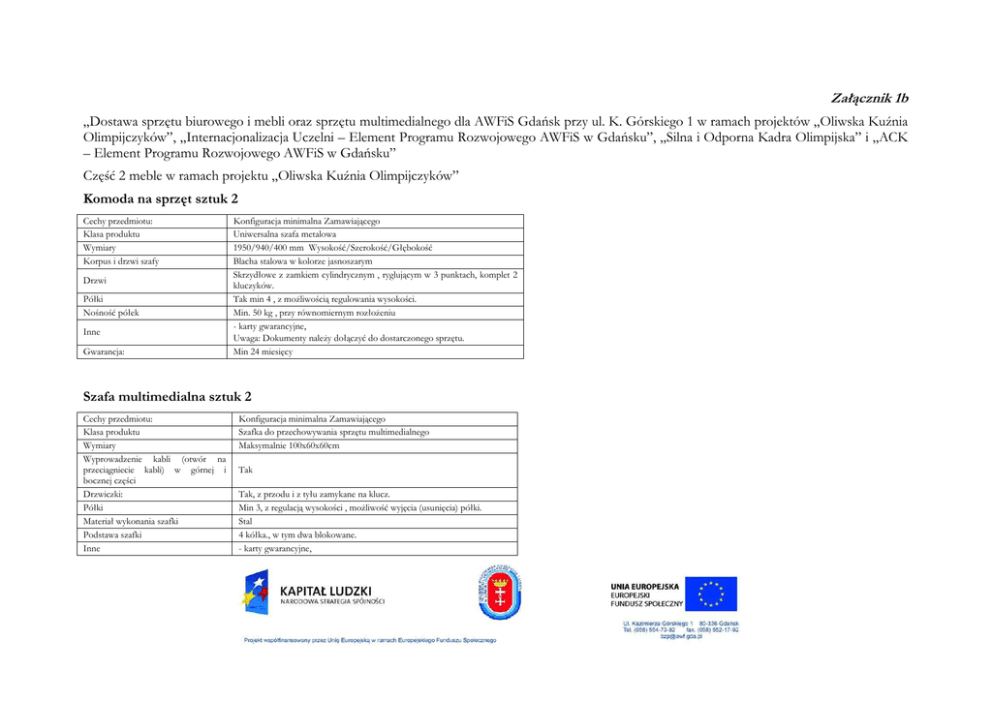 Załącznik 1b „Dostawa sprzętu biurowego i mebli oraz sprzętu multimedialnego dla AWFiS Gdańsk przy ul. K. Górskiego 1 w ramach projektów „Oliwska Kuźnia Olimpijczyków”, „Internacjonalizacja Uczelni – Element Programu Rozwojowego AWFiS w Gdańsku”, „Silna i Odporna Kadra Olimpijska” i „ACK – Element Programu Rozwojowego AWFiS w Gdańsku” Część 2 meble w ramach projektu „Oliwska Kuźnia Olimpijczyków” Komoda na sprzęt sztuk 2 Cechy przedmiotu: Klasa produktu Wymiary Korpus i drzwi szafy Drzwi Półki Nośność półek Inne Gwarancja: Konfiguracja minimalna Zamawiającego Uniwersalna szafa metalowa 1950/940/400 mm Wysokość/Szerokość/Głębokość Blacha stalowa w kolorze jasnoszarym Skrzydłowe z zamkiem cylindrycznym , ryglującym w 3 punktach, komplet 2 kluczyków. Tak min 4 , z możliwością regulowania wysokości. Min. 50 kg , przy równomiernym rozłożeniu - karty gwarancyjne, Uwaga: Dokumenty należy dołączyć do dostarczonego sprzętu. Min 24 miesięcy Szafa multimedialna sztuk 2 Cechy przedmiotu: Klasa produktu Wymiary Wyprowadzenie kabli (otwór na przeciągniecie kabli) w górnej i bocznej części Drzwiczki: Półki Materiał wykonania szafki Podstawa szafki Inne Konfiguracja minimalna Zamawiającego Szafka do przechowywania sprzętu multimedialnego Maksymalnie 100x60x60cm Tak Tak, z przodu i z tyłu zamykane na klucz. Min 3, z regulacją wysokości , możliwość wyjęcia (usunięcia) półki. Stal 4 kółka., w tym dwa blokowane. - karty gwarancyjne, Gwarancja: Uwaga: Dokumenty należy dołączyć do dostarczonego sprzętu. Min 24 miesięcy Siedzisko sztuk 56 Typ: Siedzisko konferencyjne Opis: miękkie, tapicerowane siedzisko z oparciem, na metalowej konstrukcji ramy z możliwość składowania w stosie do min .10szt. Materiał tapicerki: oban , Zamawiający, określi kolor krzesła, z firmą która wygra postępowanie przetargowe. Materiał konstrukcji ramy: Stal lakierowana na czarno. waga netto [kg]: Maksymalnie 7 kg Rysunek schematyczny , wymiary podane na rysunku zawierają przedział w jakim wykonawca musi zawrzeć swój produkt aby spełniał specyfikację. Wygląd siedziska nie powinien odbiegać znacząco od przedstawionego na poniższym rysunku. Gwarancja 24 miesiące Biurko typ I szt.28 Typ: Biurko prostokątne 140 cm x 65 cm , h=75 cm Dwie metalowe nogi na podstawach lakierowane na czarno lub niebiesko Blat wykonany z płyty melaminowanej o kolorze klonu (uwaga kolor musi się pokrywać z kolorem biurka typ II i III) o grubości minimalnie 25 mm, krawędzie blatów zabezpieczone trwałym obrzeżem ABS o grubości 2 mm w kolorze płyty. Rysunek schematyczny , wymiary podane na rysunku zawierają wymiary w jakim wykonawca musi zawrzeć swój produkt aby spełniał specyfikację. Wygląd biurka nie powinien odbiegać znacząco od przedstawionego na poniższym rysunku. Gwarancja 24 miesiące Biurko typ II szt.2 Typ: Biurko prostokątne Biurko wykonane z płyty melaminowanej lub laminowej o kolorze klonu (uwaga kolor musi się pokrywać z kolorem biurka typ I i II) o grubości minimalnie 25 mm, krawędzie blatów zabezpieczone trwałym obrzeżem ABS o grubości 2 mm w kolorze płyty. Zamawiający dopuszcza użycia innego materiału wewnątrz szafki i wewnątrz szuflad. Uchwyty do szuflad i półki: Metalowe lub drewniane okrągłe lub płaskie. Wymagania: Z jednej strony 4 szuflady, z drugiej strony szafka zamykana na kluczyk. (do zestawu należy dołączyć komplet 2 kluczyków) Rysunek schematyczny , wymiary podane na rysunku zawierają przedział w jakim wykonawca musi zawrzeć swój produkt aby spełniał specyfikację. Wygląd biurka nie powinien odbiegać znacząco od przedstawionego na poniższym rysunku. Gwarancja 24 miesiące