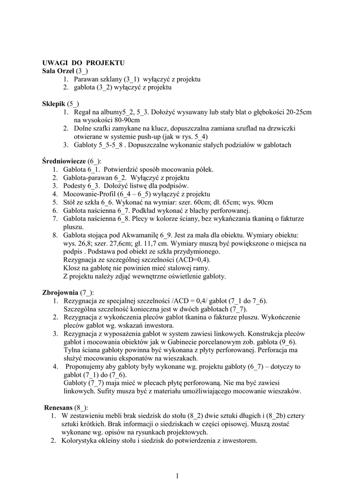 UWAGI DO PROJEKTU Sala Orzeł (3_) 1. Parawan szklany (3_1) wyłączyć z projektu 2. gablota (3_2) wyłączyć z projektu Sklepik (5_) 1. Regał na albumy5_2, 5_3. Dołożyć wysuwany lub stały blat o głębokości 20-25cm na wysokości 80-90cm 2. Dolne szafki zamykane na klucz, dopuszczalna zamiana szuflad na drzwiczki otwierane w systemie push-up (jak w rys. 5_4) 3. Gabloty 5_5-5_8 . Dopuszczalne wykonanie stałych podziałów w gablotach Średniowiecze (6_): 1. Gablota 6_1. Potwierdzić sposób mocowania półek. 2. Gablota-parawan 6_2. Wyłączyć z projektu 3. Podesty 6_3. Dołożyć listwę dla podpisów. 4. Mocowanie-Profil (6_4 – 6_5) wyłączyć z projektu 5. Stół ze szkła 6_6. Wykonać na wymiar: szer. 60cm; dł. 65cm; wys. 90cm 6. Gablota naścienna 6_7. Podkład wykonać z blachy perforowanej. 7. Gablota naścienna 6_8. Plecy w kolorze ściany, bez wykańczania tkaniną o fakturze pluszu. 8. Gablota stojąca pod Akwamanilę 6_9. Jest za mała dla obiektu. Wymiary obiektu: wys. 26,8; szer. 27,6cm; gł. 11,7 cm. Wymiary muszą być powiększone o miejsca na podpis . Podstawa pod obiekt ze szkła przydymionego. Rezygnacja ze szczególnej szczelności (ACD=0,4). Klosz na gablotę nie powinien mieć stalowej ramy. Z projektu należy zdjąć wewnętrzne oświetlenie gabloty. Zbrojownia (7_): 1. Rezygnacja ze specjalnej szczelności /ACD = 0,4/ gablot (7_1 do 7_6). Szczególna szczelność konieczna jest w dwóch gablotach (7_7). 2. Rezygnacja z wykończenia pleców gablot tkanina o fakturze pluszu. Wykończenie pleców gablot wg. wskazań inwestora. 3. Rezygnacja z wyposażenia gablot w system zawiesi linkowych. Konstrukcja pleców gablot i mocowania obiektów jak w Gabinecie porcelanowym zob. gablota (9_6). Tylna ściana gabloty powinna być wykonana z płyty perforowanej. Perforacja ma służyć mocowaniu eksponatów na wieszakach. 4. Proponujemy aby gabloty były wykonane wg. projektu gabloty (6_7) – dotyczy to gablot (7_1) do (7_6). Gabloty (7_7) maja mieć w plecach płytę perforowaną. Nie ma być zawiesi linkowych. Sufity musza być z materiału umożliwiającego mocowanie wieszaków. Renesans (8_): 1. W zestawieniu mebli brak siedzisk do stołu (8_2) dwie sztuki długich i (8_2b) cztery sztuki krótkich. Brak informacji o siedziskach w części opisowej. Muszą zostać wykonane wg. opisów na rysunkach projektowych. 2. Kolorystyka okleiny stołu i siedzisk do potwierdzenia z inwestorem. 1 3. Gablota (8_3). Zmiana lokalizacji monitora na tylnej ścianie. Uwzględnić rewizję i wentylację dla monitora ! Należy uzgodnić kolorystykę tej gabloty. 4. Gablota na kapę (8_4).Gablotę wykonać wg konstrukcji gabloty 11_4, rezygnacja z linek, podziały wklejone na stałę. Rezygnacja z wewnętrznego oświetlenia w gablocie, górne zwieńczenie przeszklone. Światło gabloty /miejsce na eksponaty/ powinno wynosić: wys. 152cm; szer. 140cm; gł. 60cm. 5. Postument szklany (8_5). W zestawieniu nieaktualne wymiary. 6. Podkład pod gobeliny (8_7). Wyłączyć z projektu. 1. 2. 3. 4. 5. 6. 7. 8. 9. 10. Rokoko (9_): Stół (9_1). Szuflada: czoło i bok szklane; konieczność szczególnej szczelności (ACD=0,4). Sprawdzić czy możliwe jest wykonanie kloszy na stół bez wewnętrznych ścian (podziałów pomiędzy kloszami). Gablota na szkło weneckie (9_2). Nie wymagana jest szczególna szczelność (ACD=0,4). Należy zmniejszyć grubość szkła w konstrukcji przegródek wewnątrz gabloty. Gablota „Moda” (9_3). Fronty szuflad mają być ze szkła mlecznego dostosowanego kolorem do pozostałej zabudowy. Uwzględnić uchwyty przy szufladach. Wszystkie szuflady ze szczególna szczelnością (ACD=0,4). Dolna część gabloty – poniżej szuflad – zamknięta taflą szkła mlecznego . Wykonać Stojak obrotowy pod manekiny (9_4) 2 szt. Bark rysunku !średnica talerza obrotowego wynosi 60cm. Gablota przyścienna „Moda” (9_5). Konieczna szczególna szczelność (ACD=0,4). Konieczne określenie czasu rozświetlenia elektrycznej szyby i sposobu pobudzania przezierności szyby oraz pobudzania ruchu obrotowych podestów pod manekiny. Gablota (9_3) konieczność zastosowania wkładu pulpitowego na blacie z listwą na opis. Gablota (9_5) dwa stojaki pulpitowe na opisy . Gablota (9_6) uzgodnić sposób opisu eksponatów /półki/. Sposób i długość rozświetlania jak w gablocie (9_5). Wykonać postumenty do gabloty, brak rysunku i zwymiarowania trzech postumentów w gablocie (3 szt. 45x45x10cm). Tkanina Barrisol (9_8). Brak informacji w zestawieniu i opisie. Postument pod mebel (9_10) 2 x 1 szt , wymiary w zestawieniu gablot. Barok (10_): 1. Bufet (10_1) wyłączyć z projektu. 2. Gablota na strój szlachecki (10_2) wyłączyć z projektu. 3. Wielkie lustro (10_3) wyłączyć z projektu. 4. Mocowanie kafli (10_4, 10_5) wyłączyć z projektu. Klasycyzm (11_): 1. Gablota patriotyczna (11-1) materiał i kolor wyścielenia gabloty określimy później. Należy do wkładu dodać listwę z opisami. 2. Gablota klasycyzm (11_2).Poprawne wymiary gabloty na rysunku. Wymiary z projektu różnią się od wymiarów odnotowanych w spisie gablot. 3. Gablota empirowa (11_3) rezygnacja ze szczególnej szczelności (ACD=0,4). Potwierdzić wymiary gabloty. Sytuacja jak wyżej. 2 4. Gablota biedermeier (11_4) wymaga szczególnej szczelności (ACD=0,4). Grubość prętów mocujących wewnątrz gabloty do konsultacji. 5. Gablota żeliwo (11_9). Rezygnacja ze szczególnej szczelności (ACD=0,4). W stosunku do projektu i opisu zostanie zmieniona ilość półek. Dodać listwę opisową obiektów. 6. Wysłony (11_10) 2 szt. Zmiana wysokości wysłon do ok. h= 300 cm. Wykonany wg. danych z opisu. PTPN (12_0): 1. Szafa (12_1). Podziały pionowe zostaną wklejone na etapie realizacji, wtedy też potwierdzimy czy pozostaną półki zamontowane w systemie linkowym. 2. Gablota na kaporet (12_3). Potwierdzić wymiary klosza – wydaje się zbyt wysoki. Miał mieć max 20 cm. Ale całość a nie tylko klosz.