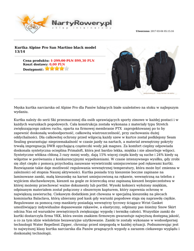 Utworzono: 2017-03-04 05:15:16 Kurtka Alpine Pro San Martino black model 13/14 Cena produktu: 1 299,00 PLN 899,30 PLN Koszt dostawy: 0,00 PLN Dostępność: Męska kurtka narciarska od Alpine Pro dla Panów lubiących białe szaleństwo na stoku w najlepszym wydaniu. Kurtka należy do serii Ski przeznaczonej dla osób uprawiających sporty zimowe w każdej postaci i w każdych warunkach pogodowych. Cała konstrukcja została wykonana z materiały typu Stretch zwiększającego zakres ruchu, oparta na firmowej membranie PTX zaprojektowanej po to by zapewnić doskonałą wodoodporność, całkowitą wiatroszczelność, przy zachowaniu dużej oddychalności. Dla całkowitej ochrony przed wilgocią każdy szew w kurtce został podklejony Seam Sealing gwarantując nieprzemakalność w czasie jazdy na nartach, a materiał zewnętrzny pokryty trwałą impregnacją DWR opychającą cząsteczki wody jak magnes. Za komfort cieplny odpowiada doskonała syntetyczna ocieplina Primaloft, która jest bardzo lekka, miękka i nie absorbuje wilgoci. Syntetyczne włókna chłoną 3 razy mniej wody, dają 15% więcej ciepła kiedy są suche i 24% kiedy są wilgotne w porównaniu z konkurencyjnymi wypełnieniami. W czasie intensywnego wysiłku, gdy zrobi się zbyt ciepło z pomocą przychodzą zasuwane wywietrzniki umiejscowione pod rękawami kurtki. Rozwiązanie takie daje możliwość regulowania wewnętrznej temperatury, która może być zmienna w zależności od stopnia Naszej aktywności. Kurtka posiada trzy kieszenie boczne zapinane na laminowane zamki, małą kieszonkę na karnet umiejscowioną na rękawie, wewnętrzną na telefon z wyjściem słuchawkowym, kieszeń na gogle ze ściereczką oraz zapinaną kieszeń bezpieczeństwa w której możemy przechować ważne dokumenty lub portfel. Wysoki kołnierz wyłożony miękkim, odpinanym materiałem został połączony z obszernym kapturem, który zapewnia ochronę w największą zawieruchę. Ciekawym dodatkiem jest chowana w specjalną kieszonkę na plecach kominiarka Balaclava, którą ubieramy pod kask gdy warunki pogodowe staja się naprawdę ciężkie. Regulowane za pomocą rzep mankiety posiadają wewnętrzy lycrowy ściągacz Wrist Gasket umożliwiający indywidualne dopasowanie rękawów, a elastyczny, odpinany pas śnieżny Snow Skirt odcina Nas od warunków zewnętrznych zwiększając wygodę i termikę całości. Wszystkie zamki do kurtki dostarczyła firma YKK, która swoim znakiem firmowym gwarantuje najwyższą dostępną jakość, a co za tym idzie wieloletnie bezawaryjne użytkowanie. Zamki te zostały wykonane w wodoodpornej technologii Water Repellent Zipper, chroniąc przed niepogodą w każdej sytuacji. Podsumowując jest to najwyższej klasy kurtka narciarska dla Panów pragnących wygody a zarazem ciekawego wyglądu i doskonałej technologii. Technologia: -PTX -Seam Sealing -DWR -Primaloft -Balaclava -Wrist Gasket -Snow Skirt -YKK -Water Repellent Zipper Specyfikacja: -Materiał: 96% Poliester, 4% Elastan Producent Alpine Pro Rozmiary M, L, XL, XXL Wodoodporność Kolory Kolekcja Płeć Adres: http://nartyrowery.pl/ 6000-10000 mm Czarny zima 2013/14 Męska Telefon: 34 365 66 09 Email: [email protected] Gadu-Gadu: Skype: