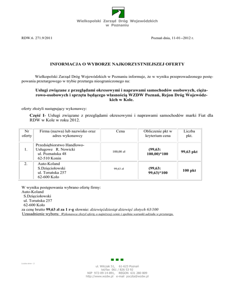 Wielkopolski Zarząd Dróg Wojewódzkich w Poznaniu RDW.6. 271.9/2011 Poznań dnia, 11-01--2012 r. INFORMACJA O WYBORZE NAJKORZYSTNIEJSZEJ OFERTY Wielkopolski Zarząd Dróg Wojewódzkich w Poznaniu informuje, że w wyniku przeprowadzonego postępowania przetargowego w trybie przetargu nieograniczonego na: Usługi związane z przeglądami okresowymi i naprawami samochodów osobowych, ciężarowo-osobowych i sprzętu będącego własnością WZDW Poznań, Rejon Dróg Wojewódzkich w Kole. oferty złożyli następujący wykonawcy: Część I- Usługi związane z przeglądami okresowymi i naprawami samochodów marki Fiat dla RDW w Kole w roku 2012. Nr oferty 1. 2. Firma (nazwa) lub nazwisko oraz adres wykonawcy Przedsiębiorstwo HandlowoUsługowe R. Nowicki ul. Poznańska 48 62-510 Konin Auto-Koland S.Dzięciołowski ul. Toruńska 257 62-600 Koło Cena 100,00 zł 99,63 zł Obliczenie pkt w kryterium cena Liczba pkt. (99,63: 100,00)*100 99,63 pkt (99,63: 99,63)*100 100 pkt W wyniku postępowania wybrano ofertę firmy: Auto-Koland S.Dzięciołowski ul. Toruńska 257 62-600 Koło za cenę brutto 99,63 zł za 1 r-g słownie: dziewięćdziesiąt dziewięć złotych 63/100 Uzasadnienie wyboru: Wykonawca złożył ofertę o najniższej cenie i spełnia warunki udziału w przetargu. Liczba stron - 2 ▀ ▀ ▀ ul. Wilczak 51, 61-623 Poznań tel/fax 061 / 826 53 92 NIP 972-09-14-891, REGON 631 280 809 http://www.wzdw.pl e-mail [email protected] 2 Część II- Usługi związane z przeglądami okresowymi i naprawami samochodów marki Lublin, Polonez dla RDW w Kole w roku 2012. Nr oferty 2. Firma (nazwa) lub nazwisko oraz adres wykonawcy Cena Przedsiębiorstwo HandlowoUsługowe R. Nowicki ul. Poznańska 48 62-510 Konin 100,00 zł Obliczenie pkt w kryterium cena Liczba pkt. (100,00: 100,00)*100 100,00 pkt W wyniku postępowania wybrano ofertę firmy: Przedsiębiorstwo Handlowo-Usługowe R. Nowicki ul. Poznańska 48 62-510 Konin za cenę brutto 100,00 zł za 1 r-g słownie: sto złotych 00/100 Uzasadnienie wyboru: Złożono jedną ofertę i Wykonawca spełnia warunki udziału w postępowaniu. Część III- Usługi związane z przeglądami okresowymi i naprawami sprzętu RDW w Kole w roku 2012. Nie wpłynęła żadna oferta. Uzasadnienie: Postępowanie w cz. III unieważnia się na podst. Art. 93 pkt.1 ppkt.1) Ustawy Prawo Zamówień Publicznych Część IV- Usługi związane z przeglądami okresowymi i naprawami sprzętu innego w RDW w Kole w roku 2012. Nr oferty 3. Firma (nazwa) lub nazwisko oraz adres wykonawcy SPRZEDAŻ-SERWIS STIHL ul. Mickiewicza 7 62-700 Turek Cena 98,40 zł Obliczenie pkt w kryterium cena Liczba pkt. (98,40/ 98,40)*100 100 pkt W wyniku postępowania wybrano ofertę firmy: SPRZEDAŻ-SERWIS STIHL ul. Mickiewicza 7 62-700 Turek za cenę brutto 98,40 zł za 1 r-g słownie: dziewięćdziesiąt osiem złotych 40/100 Uzasadnienie wyboru: Złożono jedną ofertę i Wykonawca spełnia warunki udziału w postępowaniu. Część V- Usługi związane z przeglądami okresowymi i naprawami samochodu marki MercedesUNIMOG w RDW w Kole w roku 2012. Nie wpłynęła żadna oferta. Uzasadnienie: Postępowanie w cz. V unieważnia się na podst. Art. 93 pkt.1 ppkt.1) Ustawy Prawo Zamówień Publicznych DYREKTOR Marek Kmiecik ▀ ▀ ▀ ul. Wilczak 51, 61-623 Poznań tel/fax 061 / 826 53 92 NIP 972-09-14-891, REGON 631 280 809 http://www.wzdw.pl e-mail [email protected]