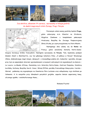 Już wkrótce, albowiem 14 czerwca, wyruszamy w kolejną podróż do dwóch magicznych stolic Europy: Pragi i Paryża Pierwszym celem naszej podróży będzie Praga, gdzie zobaczymy Wzgórze m.in. Zamkowe z Klasztor na Strahovie, kompleksem pałacowym Hradczany, Bazylikę św. Jerzego. Pospacerujemy Złotą Uliczką, po czym przejdziemy na Stare Miasto. Następnego dnia udamy się do Reims we Francji, gdzie zwiedzimy Katedrę Notre-Dame- miejsce koronacji królów francuskich. Następnie wyruszymy do Paryża. Tam, będziemy podążać śladami Amelii z Montmartre, czy też głównego bohatera filmu „O północy w Paryżu” Woody’ego Allena, doświadczając magii miejsc, słynących z niezwykłego piękna ulic, bulwarów i ogrodów, obcując przy tym ze wspaniałymi zbiorami zgromadzonymi w muzeach zaliczanych do największych na świecie – Le Louvre, Le Musée d’Orsay. Zwiedzimy m.in. Katerdrę Notre-Dame, Centrum Pompidou, Dzielnicę Łacińską, Sorbonę, Bazylikę Sacré- Coeur, Wieżę Eiffela, perełkę francuskiego klasycyzmu i baroku – Wersal, pokłonimy się największym na Cmentarzu Père Lachaise oraz odbędziemy rejs statkiem po Sekwanie. A to wszystko przy dźwiękach paryskich grajków, zapachu świeżo zaparzonej kawy, ulicznego zgiełku i wielokulturowego tłumu…. Roksana Frychel