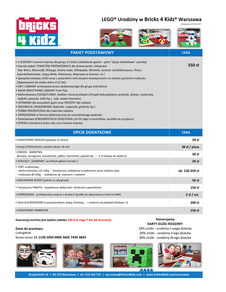 LEGO® Urodziny w Bricks 4 Kidz® Warszawa obowiązuje od 01.02.2017 r. PAKIET PODSTAWOWY CENA • 2 GODZINY trwania imprezy dla grupy 12 dzieci (dodatkowi goście - patrz 'Opcje Dodatkowe' poniżej) • Szeroki wybór TEMATÓW PRZEWODNICH dla dziewczynek i chłopców: Star Wars, Minecraft, Ninjago, Kraina Lodu, Olimpiada, Minionki, Jurassic Land/Dinozaury, Piraci, Superbohaterowie, Angry Birds, Pokemony, Wyprawa w kosmos i in.) • Specjalne zestawy LEGO wraz z autorskimi instrukcjami tematycznymi na różnym poziomie trudności (dopasowane do wieku dzieci 4-12 lat) • GRY i ZABAWY animowane przez dedykowanego dla grupy instruktora • KĄCIK KREATYWNEJ ZABAWY Free Play • Nielimitowany POCZĘSTUNEK: słodkie i słone przekąski (chrupki kukurydziane, prażynki, delicje, ciasteczka, wafelki, paluszki, żelki itp.), soki, woda mineralna • UPOMINKI dla wszystkich gości oraz PREZENT dla Jubilata • DEKORACJE URODZINOWE (baloniki, czapeczki, girlandy itp.) • TORBA PREZENTOWA dla rodziców Jubilata • ZAPROSZENIA w formie elektronicznej do samodzielnego wydruku • Podstawowa DOKUMENTACJA ZDJĘCIOWA (10-20 zdjęć uczestników, wysyłka po przyjęciu) • OPIEKA instruktora przez cały czas trwania imprezy OPCJE DODATKOWE 550 zł CENA 30 zł • DODATKOWE DZIECKO (powyżej 12 dzieci) • Gorąca PIZZA prosto z pizzerii (duża, 42 cm) 30 zł / pizza • OWOCE - WARZYWA (banany, winogrona, mandarynki, jabłka, marchewki, papryki itp. ---- 2-3 rodzaje do wyboru) 30 zł • DZIECIĘCY „SZAMPAN”, po którym głowa nie boli ;) 20 zł • TORT urodzinowy: - okolicznościowy 115 zł/kg - tematyczny, ozdobiony w wybranym przez Jubilata stylu - tradycyjny 85 zł/kg - ozdobiony np. owocami i napisem ok. 120-250 zł 50 zł • MALOWANIE BUZIEK (pakiet za całą grupę) 150 zł • Tematyczna PINIATA - wypełniona słodyczami i drobnymi upominkami • ZAPROSZENIA - profesjonalny wydruk z drukarni (próbki do obejrzenia w Centrum B4K) 2 zł / szt. • SALA DLA RODZICÓW (z poczęstunkiem, kawą i herbatą, … i możecie się pobawić klockami :)) 200 zł • DODATKOWY ANIMATOR 150 zł Gwarancją terminu jest wpłata zadatku 200 zł w ciągu 7 dni od rezerwacji. Dane do przelewu: Coding4Kids Numer konta: 11 1140 2004 0000 3602 7430 3843 Honorujemy KARTY DUŻEJ RODZINY! 10% zniżki - urodziny I-szego dziecka 20% zniżki - urodziny II-ego dziecka 30% zniżki - urodziny III-ego dziecka Stryjeńskich 19 | 02-719 Warszawa | tel. 516 162 719 | [email protected] | www.bricks4kidz.com/warszawa