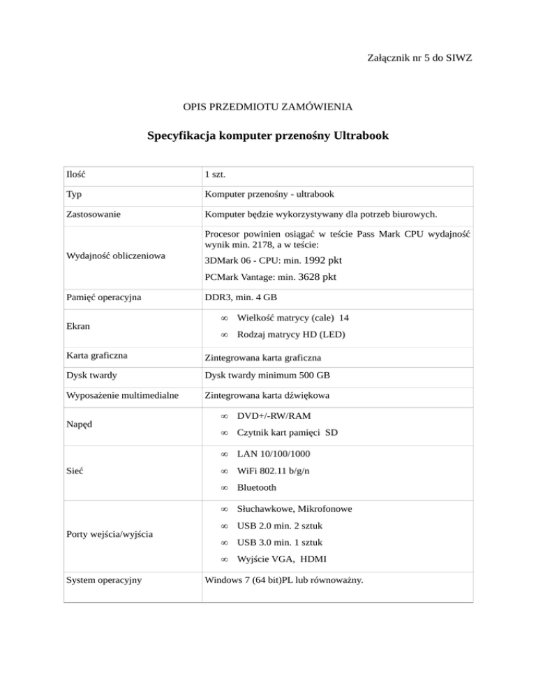 Załącznik nr 5 do SIWZ OPIS PRZEDMIOTU ZAMÓWIENIA Specyfikacja komputer przenośny Ultrabook Ilość 1 szt. Typ Komputer przenośny - ultrabook Zastosowanie Komputer będzie wykorzystywany dla potrzeb biurowych. Procesor powinien osiągać w teście Pass Mark CPU wydajność wynik min. 2178, a w teście: Wydajność obliczeniowa 3DMark 06 - CPU: min. 1992 pkt PCMark Vantage: min. 3628 pkt Pamięć operacyjna Ekran DDR3, min. 4 GB • Wielkość matrycy (cale) 14 • Rodzaj matrycy HD (LED) Karta graficzna Zintegrowana karta graficzna Dysk twardy Dysk twardy minimum 500 GB Wyposażenie multimedialne Zintegrowana karta dźwiękowa Napęd Sieć Porty wejścia/wyjścia System operacyjny • DVD+/-RW/RAM • Czytnik kart pamięci SD • LAN 10/100/1000 • WiFi 802.11 b/g/n • Bluetooth • Słuchawkowe, Mikrofonowe • USB 2.0 min. 2 sztuk • USB 3.0 min. 1 sztuk • Wyjście VGA, HDMI Windows 7 (64 bit)PL lub równoważny. Przez system równoważny do Microsoft Windows Zamawiający rozumie system spełniający następujące wymagania funkcjonalne: 1. Zapewniający pełne wsparcie dla wykorzystywanego przez Zamawiającego oprogramowania, tj.: - oprogramowania biurowego MS Office 2003/2010 Pro. - Oprogramowania antywirusowego Kaspersky Anti-Virus for Windows Workstations. 2. Umożliwiający wykorzystanie na potrzeby aplikacji min. 8 GB przestrzeni adresowej pamięci RAM. 3. Pozwalający na uruchomienie aplikacji 32 i 64-bitowych. Zapewniający pełne wsparcie dla urządzeń i podzespołów zainstalowanych w zamawianym sprzęcie komputerowym i peryferyjnych (przy ew. wykorzystaniu sterowników od odpowiednich producentów podzespołów dołączonych do komputera). Inne Niezawodność/jakość wytwarzania aluminiowa obudowa klawiatura typu chicklet Sprzęt produkowany zgodnie z normami ISO 9001 oraz ISO 14001 2 lata od daty dostawy w miejscu instalacji komputera. Usunięcie awarii - następny dzień roboczy po otrzymaniu zgłoszenia (przyjmowanie zgłoszeń w dni robocze w godzinach 8.00 — 16.00 telefonicznie, faksem, e-mail) Warunki gwarancji Serwis urządzeń musi byś realizowany przez producenta lub autoryzowanego partnera serwisowego producenta. Serwis urządzeń musi byś realizowany zgodnie z wymaganiami normy ISO 9001.