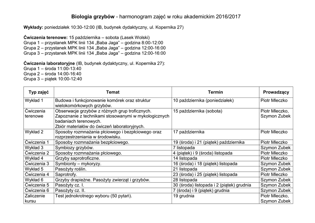 Biologia grzybów - harmonogram zajęć w roku akademickim 2016