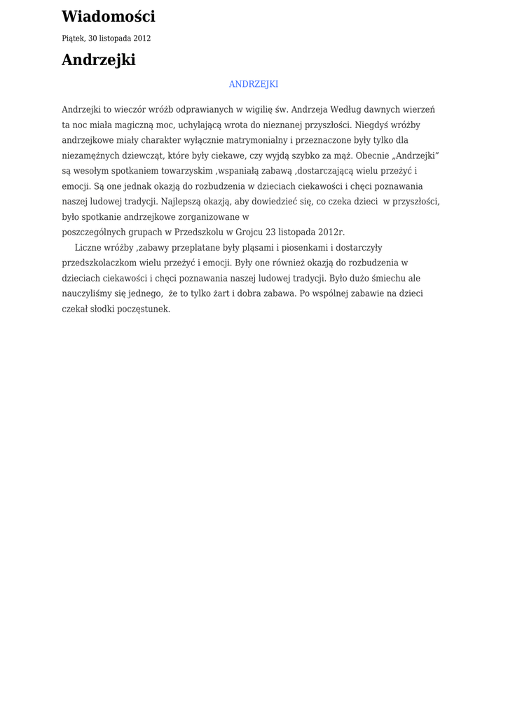 Wiadomości Piątek, 30 listopada 2012 Andrzejki ANDRZEJKI Andrzejki to wieczór wróżb odprawianych w wigilię św. Andrzeja Według dawnych wierzeń ta noc miała magiczną moc, uchylającą wrota do nieznanej przyszłości. Niegdyś wróżby andrzejkowe miały charakter wyłącznie matrymonialny i przeznaczone były tylko dla niezamężnych dziewcząt, które były ciekawe, czy wyjdą szybko za mąż. Obecnie „Andrzejki” są wesołym spotkaniem towarzyskim ,wspaniałą zabawą ,dostarczającą wielu przeżyć i emocji. Są one jednak okazją do rozbudzenia w dzieciach ciekawości i chęci poznawania naszej ludowej tradycji. Najlepszą okazją, aby dowiedzieć się, co czeka dzieci w przyszłości, było spotkanie andrzejkowe zorganizowane w poszczególnych grupach w Przedszkolu w Grojcu 23 listopada 2012r. Liczne wróżby ,zabawy przeplatane były pląsami i piosenkami i dostarczyły przedszkolaczkom wielu przeżyć i emocji. Były one również okazją do rozbudzenia w dzieciach ciekawości i chęci poznawania naszej ludowej tradycji. Było dużo śmiechu ale nauczyliśmy się jednego, że to tylko żart i dobra zabawa. Po wspólnej zabawie na dzieci czekał słodki poczęstunek.