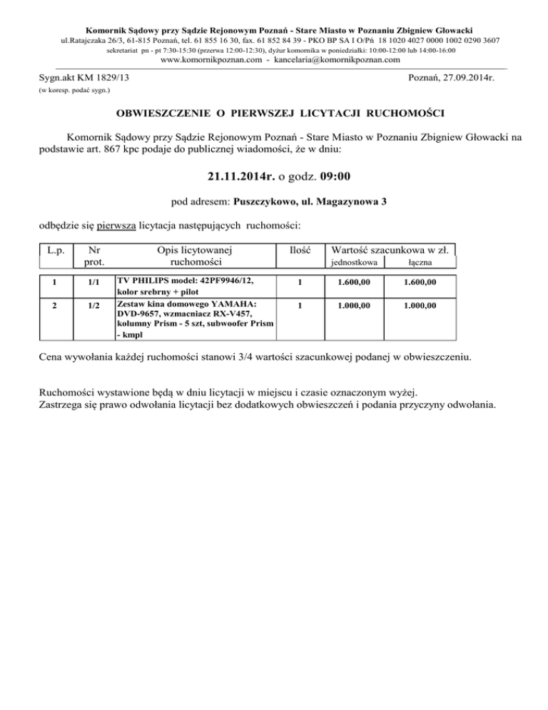 Komornik Sądowy przy Sądzie Rejonowym Poznań - Stare Miasto w Poznaniu Zbigniew Głowacki ul.Ratajczaka 26/3, 61-815 Poznań, tel. 61 855 16 30, fax. 61 852 84 39 - PKO BP SA I O/Pń 18 1020 4027 0000 1002 0290 3607 sekretariat pn - pt 7:30-15:30 (przerwa 12:00-12:30), dyżur komornika w poniedziałki: 10:00-12:00 lub 14:00-16:00 www.komornikpoznan.com - [email protected] Sygn.akt KM 1829/13 Poznań, 27.09.2014r. (w koresp. podać sygn.) OBWIESZCZENIE O PIERWSZEJ LICYTACJI RUCHOMOŚCI Komornik Sądowy przy Sądzie Rejonowym Poznań - Stare Miasto w Poznaniu Zbigniew Głowacki na podstawie art. 867 kpc podaje do publicznej wiadomości, że w dniu: 21.11.2014r. o godz. 09:00 pod adresem: Puszczykowo, ul. Magazynowa 3 odbędzie się pierwsza licytacja następujących ruchomości: L.p. Nr prot. Opis licytowanej ruchomości Ilość 1 1/1 2 1/2 TV PHILIPS model: 42PF9946/12, kolor srebrny + pilot Zestaw kina domowego YAMAHA: DVD-9657, wzmacniacz RX-V457, kolumny Prism - 5 szt, subwoofer Prism - kmpl Wartość szacunkowa w zł. jednostkowa łączna 1 1.600,00 1.600,00 1 1.000,00 1.000,00 Cena wywołania każdej ruchomości stanowi 3/4 wartości szacunkowej podanej w obwieszczeniu. Ruchomości wystawione będą w dniu licytacji w miejscu i czasie oznaczonym wyżej. Zastrzega się prawo odwołania licytacji bez dodatkowych obwieszczeń i podania przyczyny odwołania.