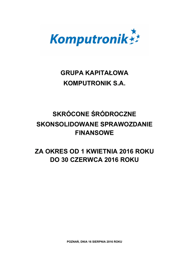 GRUPA KAPITAŁOWA KOMPUTRONIK S.A. SKRÓCONE ŚRÓDROCZNE SKONSOLIDOWANE SPRAWOZDANIE FINANSOWE ZA OKRES OD 1 KWIETNIA 2016 ROKU DO 30 CZERWCA 2016 ROKU POZNAŃ, DNIA 16 SIERPNIA 2016 ROKU SPIS TREŚCI SKONSOLIDOWANY BILANS ................................................................................................................................ 1 SKONSOLIDOWANY RACHUNEK ZYSKÓW I STRAT .......................................................................................... 3 SKONSOLIDOWANE ZESTAWIENIE ZMIAN W KAPITALE WŁASNYM ............................................................... 5 SKONSOLIDOWANY RACHUNEK PRZEPŁYWÓW PIENIĘŻNYCH ..................................................................... 7 DODATKOWE INFORMACJE I OBJAŚNIENIA DO ŚRÓDROCZNEGO SKRÓCONEGO SKONSOLIDOWANEGO SPRAWOZDANIA FINANSOWEGO .............................................................................. 9 1. Informacje ogólne ...................................................................................................................................... 9 2. Podstawa sporządzenia oraz zasady rachunkowości ............................................................................. 10 3. Znaczące zdarzenia i transakcje ............................................................................................................. 13 4. Zysk na akcję .......................................................................................................................................... 23 5. Sezonowość działalności ........................................................................................................................ 24 6. Segmenty operacyjne.............................................................................................................................. 24 7. Konsolidacja ............................................................................................................................................ 26 8. Rzeczowe aktywa trwałe ......................................................................................................................... 29 9. Wartości niematerialne ............................................................................................................................ 30 10. Nieruchomości inwestycyjne ................................................................................................................... 31 11. Wartość godziwa instrumentów finansowych⃰ ⃰ ......................................................................................... 31 12. Odpisy aktualizujące wartość aktywów ................................................................................................... 33 13. Kapitał podstawowy................................................................................................................................. 34 14. Programy płatności akcjami .................................................................................................................... 35 15. Dywidendy............................................................................................................................................... 36 16. Emisja i wykup papierów dłużnych .......................................................................................................... 36 17. Naruszenie postanowień umów (kredyty, pożyczki) ................................................................................ 37 18. Rezerwy .................................................................................................................................................. 37 19. Informacje o istotnych zmianach wielkości szacunkowych, w tym o korektach z tytułu rezerw, rezerwie i aktywach z tytułu odroczonego podatku dochodowego .................................................................................... 37 20. Zobowiązania warunkowe ....................................................................................................................... 37 21. Połączenia jednostek gospodarczych ..................................................................................................... 38 22. Działalność zaniechana........................................................................................................................... 38 23. Transakcje z jednostkami powiązanymi .................................................................................................. 38 24. Zdarzenia po dniu bilansowym ................................................................................................................ 39 25. Inne znaczące zmiany aktywów, zobowiązań, przychodów i kosztów..................................................... 39 26. Inne informacje wymagane przepisami (wybrane dane finansowe przeliczone na euro) ........................ 40 27. Inne informacje, które zdaniem Zarządu Emitenta są istotne dla oceny sytuacji kadrowej, majątkowej, finansowej, wyniku finansowego Komputronik S.A. oraz Grupy Komputronik .................................................. 41 28. Zatwierdzenie do publikacji ..................................................................................................................... 42 SKONSOLIDOWANY BILANS AKTYWA Aktywa trwałe Wartość firmy Wartości niematerialne Rzeczowe aktywa trwałe Nieruchomości inwestycyjne Inwestycje w jednostkach zależnych Inwestycje w jednostkach stowarzyszonych Należności i pożyczki Pochodne instrumenty finansowe Pozostałe długoterminowe aktywa finansowe Inne długoterminowe aktywa finansowe Długoterminowe rozliczenia międzyokresowe Aktywa z tytułu odroczonego podatku dochodowego Aktywa trwałe razem Aktywa obrotowe Zapasy Należności z tytułu umów o usługę budowlaną Należności z tytułu dostaw i usług oraz pozostałe należności Należności z tytułu bieżącego podatku dochodowego Pożyczki Pochodne instrumenty finansowe Pozostałe kr